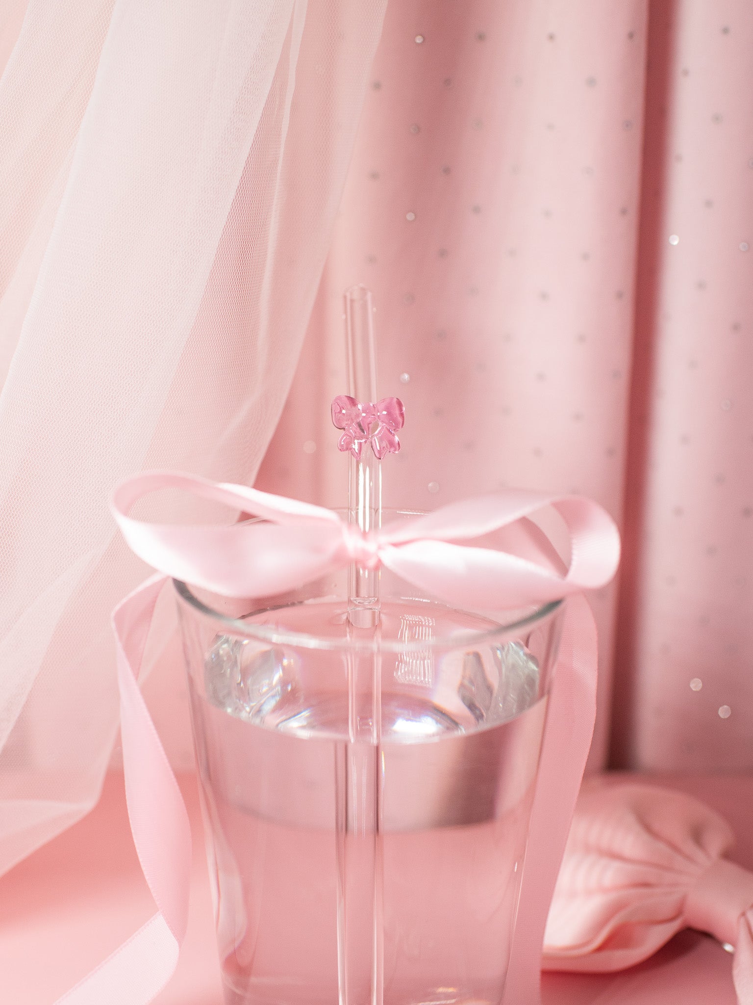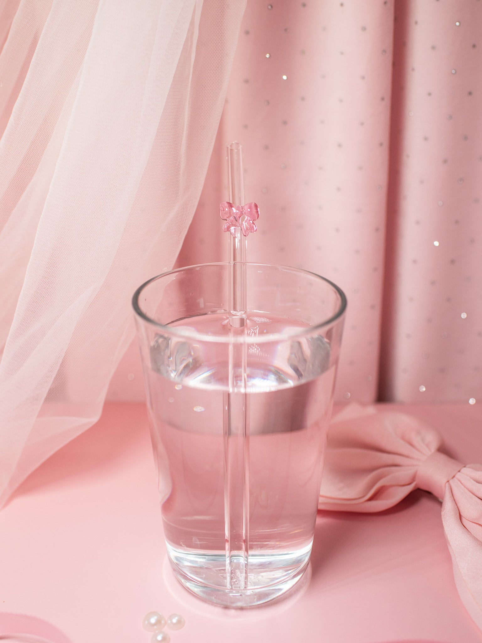 Made of glass, so no chance of that weird metallic taste you get with some metal straws. Features one little pink bow at the top of the straw. So cute!Â