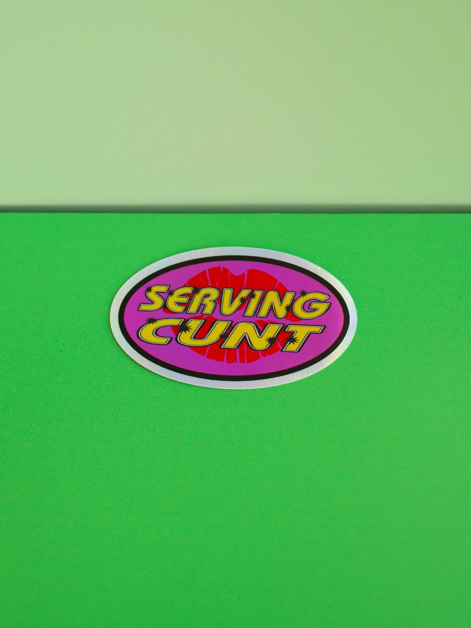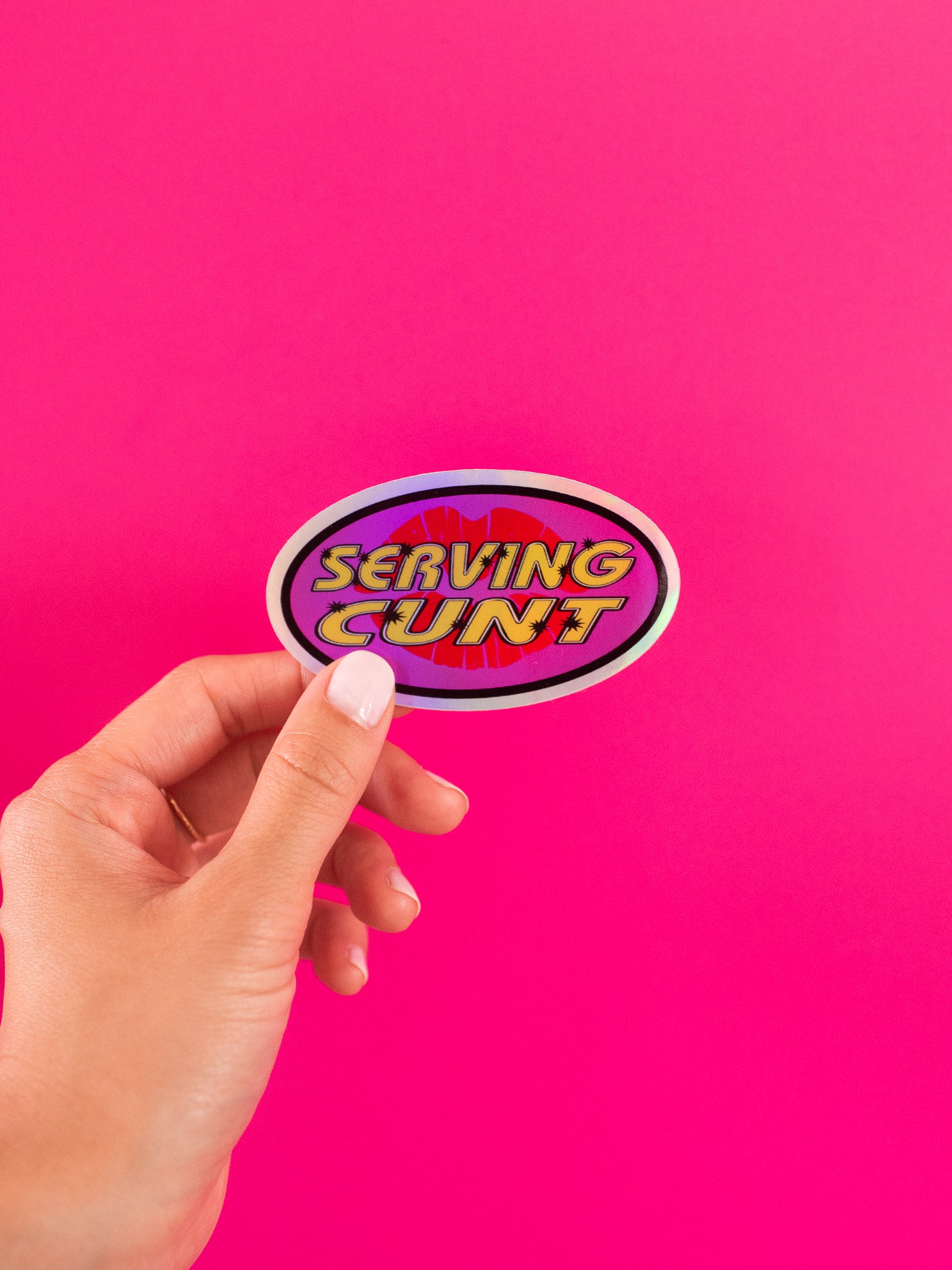 This 90's, retro inspired sticker reads "serving cunt" in holographic glitter!