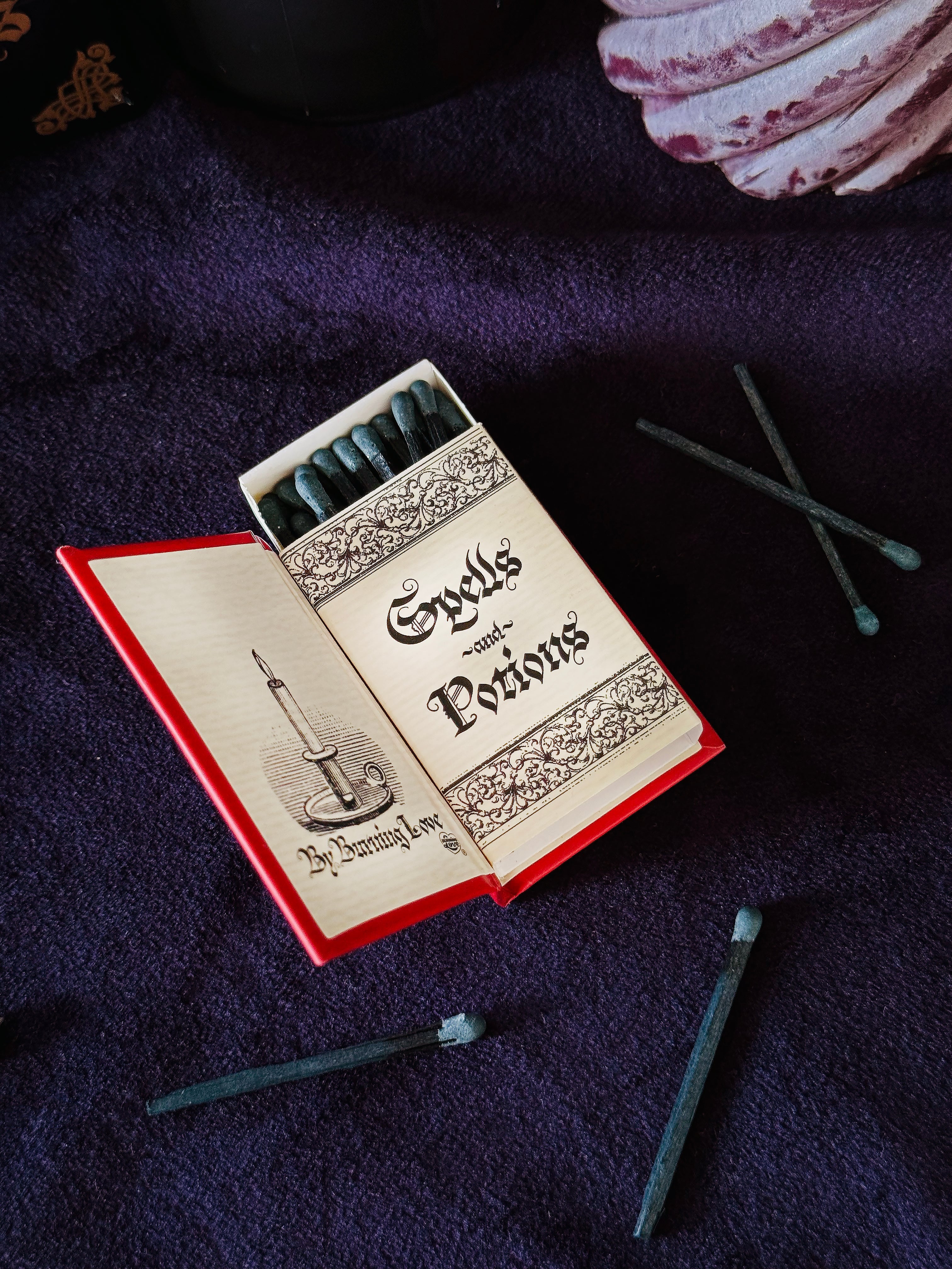 These spellbook matches are designed to look like a real book! Open the cover and see the title and witchy artwork! The back cover features women casting spells, what more could you want? The striker is on the side of the book and inside are solid black matches.