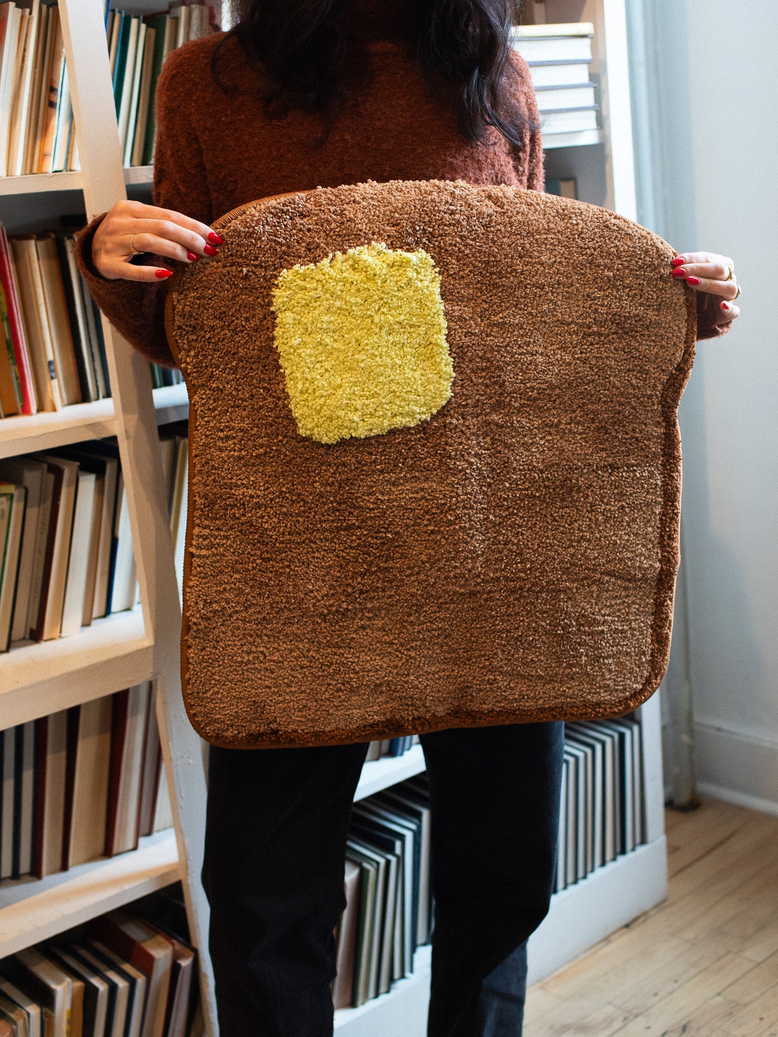 Measures 22" x 24" and is made to look like a piece of buttered toast! 🍞 Slip resistant backing, so no need to get rug tape! Made from 100% polyester, can be machine washed, but we recommend hand washing. Do not iron, air dry only.