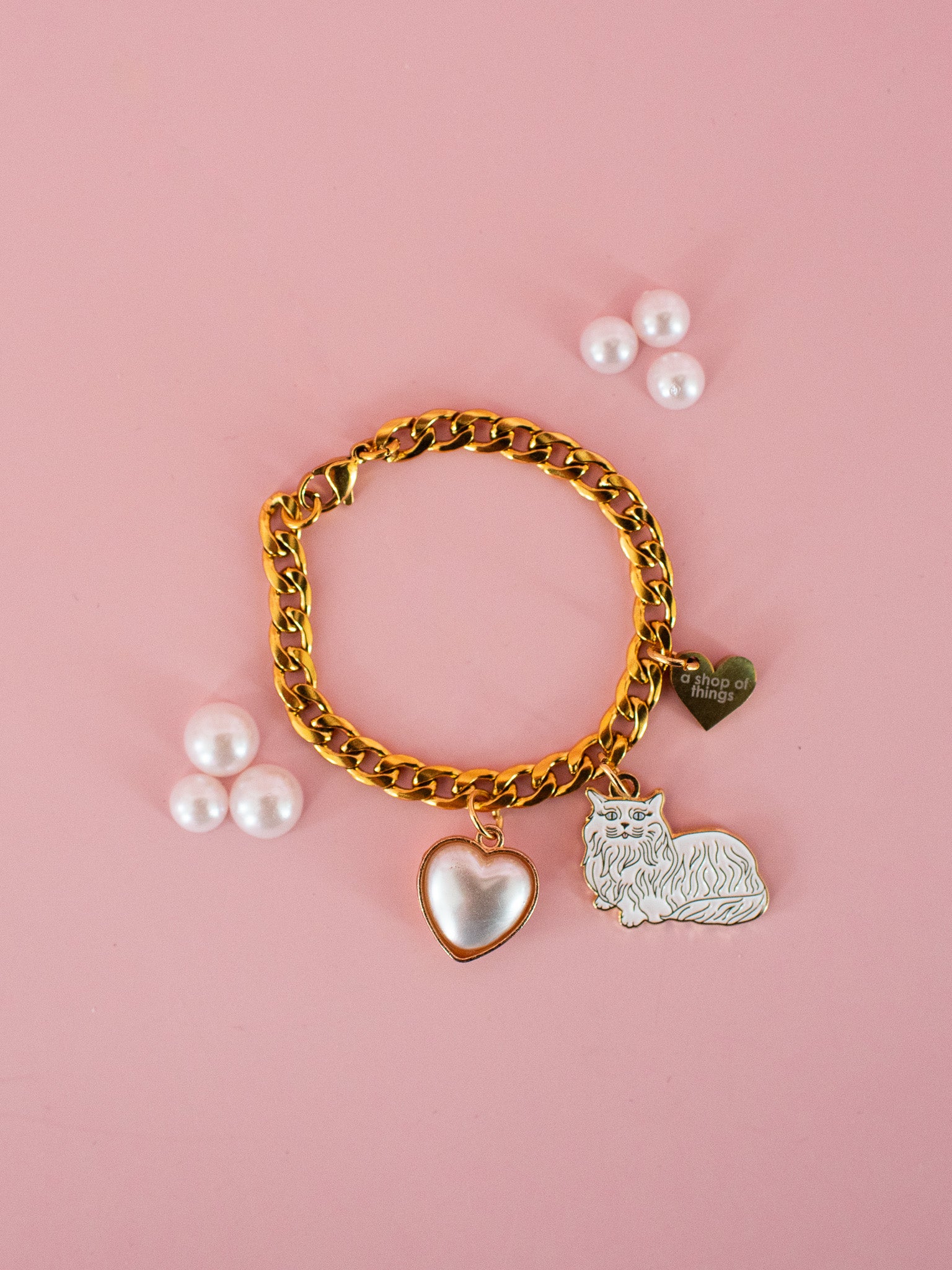 This cup charm is made from a gold toned curb link chain and has a pearl heart, cat, and gold heart charm attached.