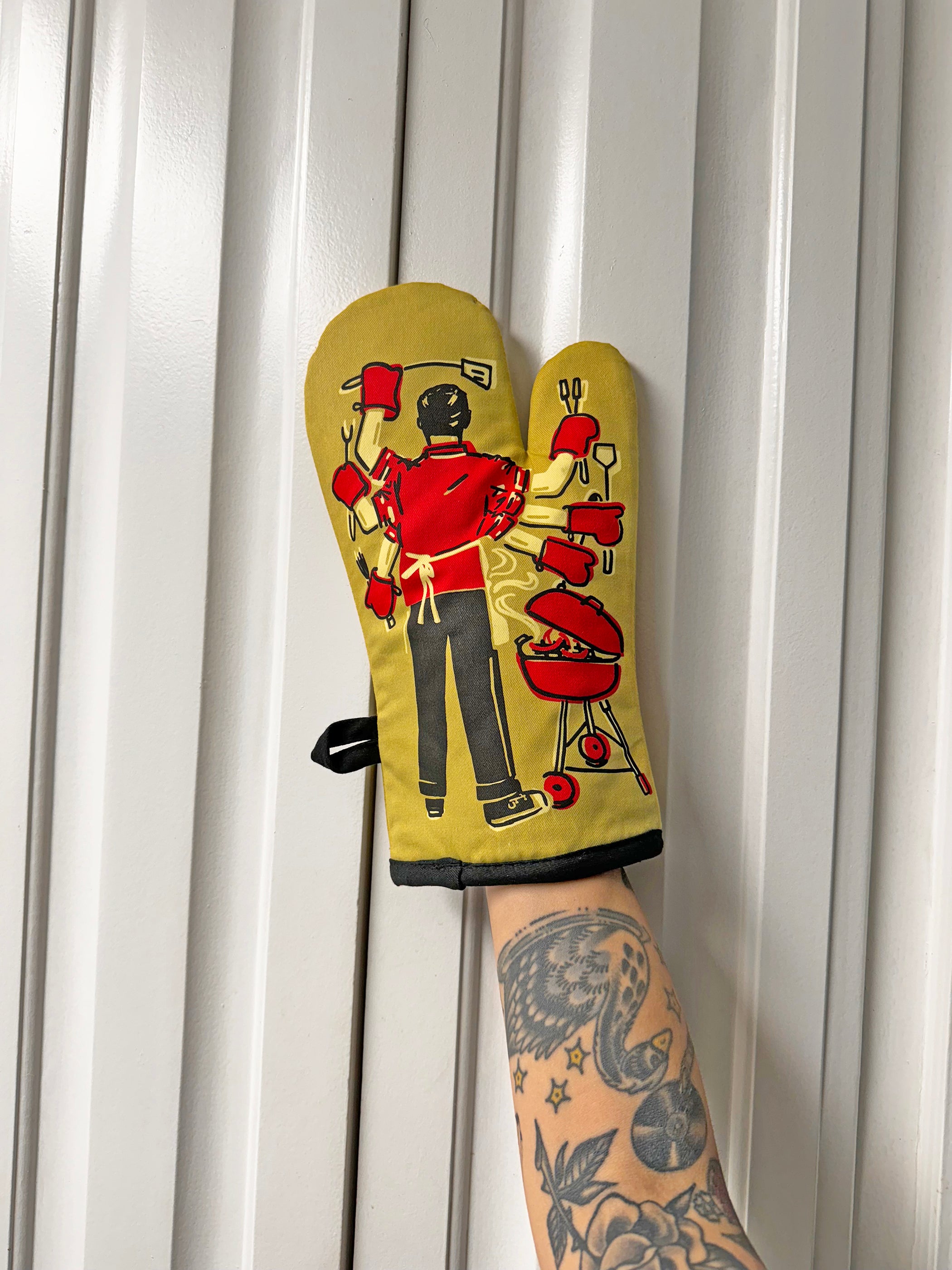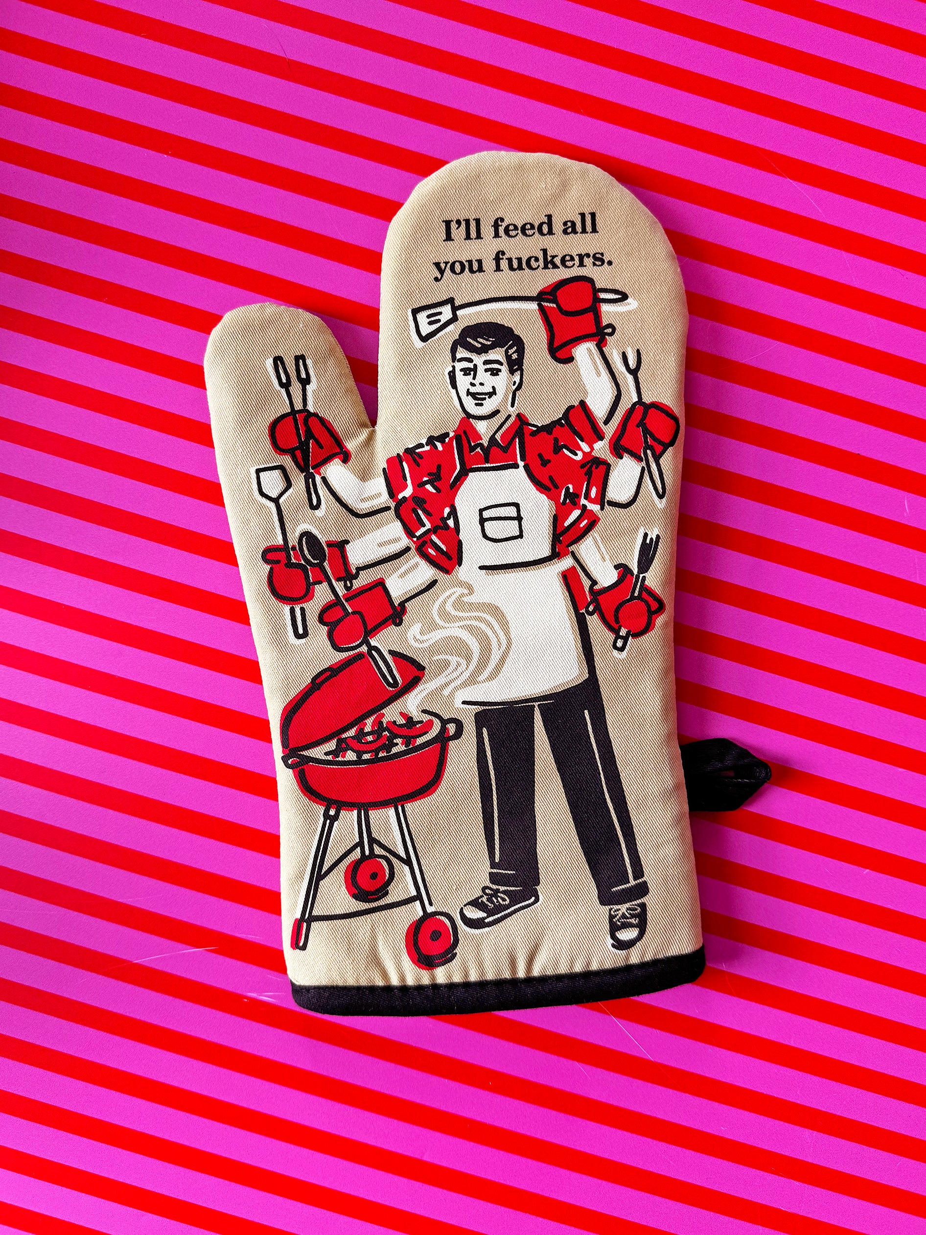 This high quality oven mitt is insulated and made with a 100% cotton material! One side of the oven mitt features a very busy chef and reads "I'll feed all you fuckers.". The other side features the same chef, but backwards, using all 6 of their arms to feed said f*ckers! ;) The bottom edge of the mitt is black and has a matching loop for convenient hanging when not in use! Great gift for the chef in your life!!