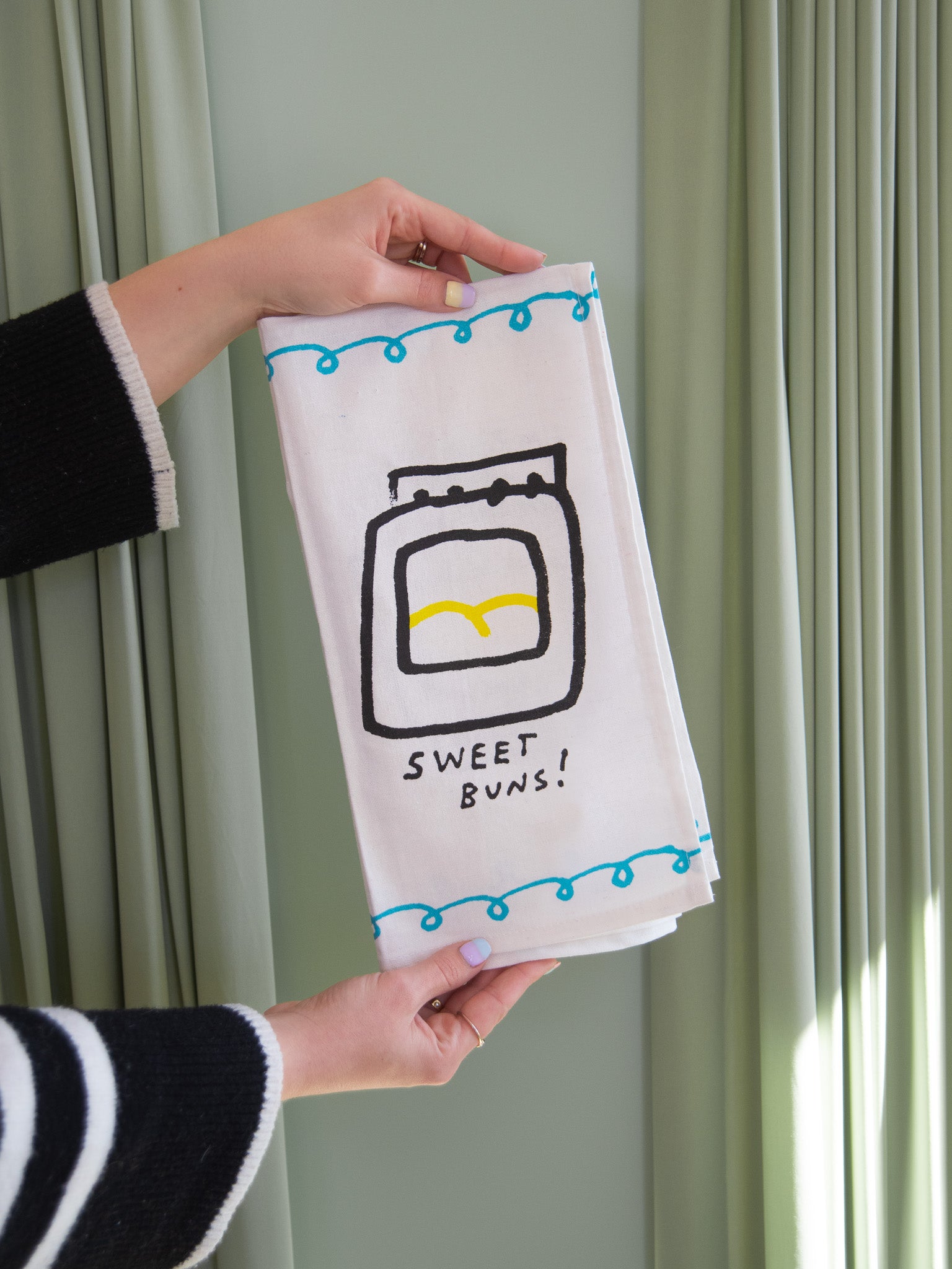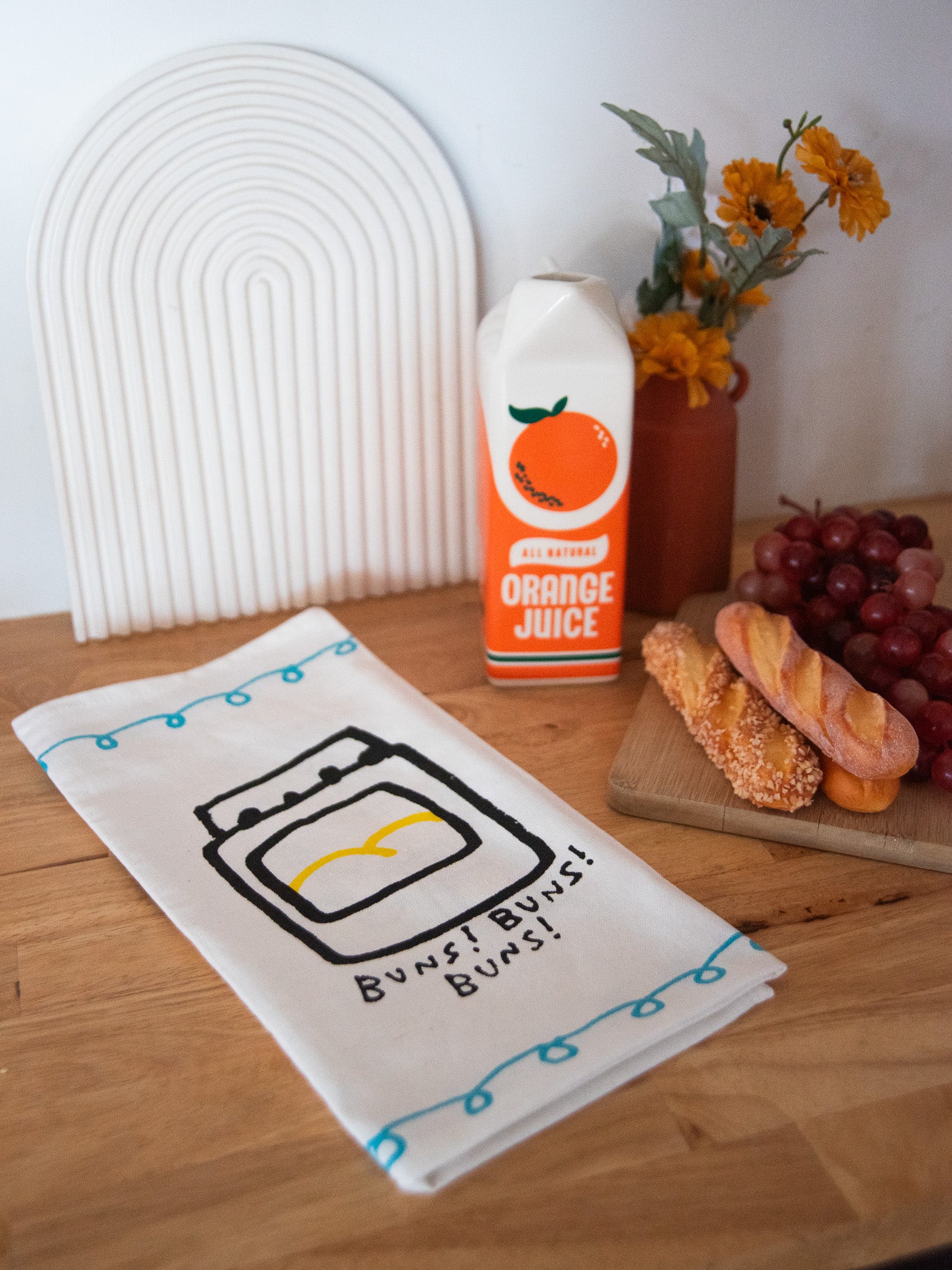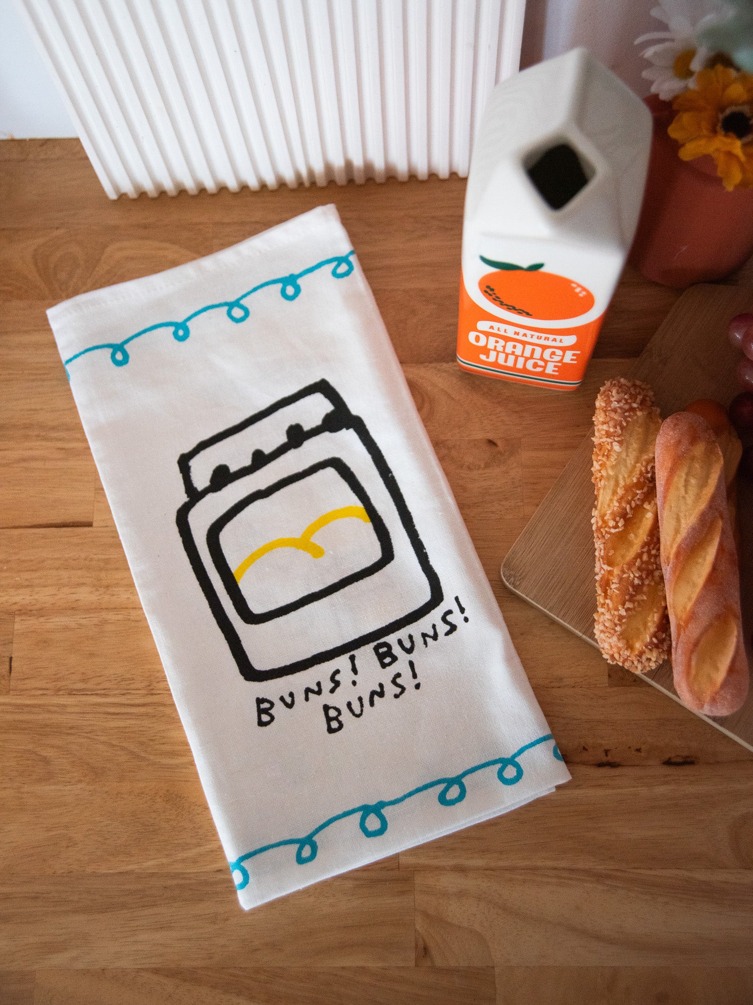 This high quality dish towel is super absorbent and made with 100% cotton material! The towel folds out to reveal 6 ovens baking buns and one little baker getting his buns out! Pops of yellow and blue add some fun color to the black and white illustrations!
