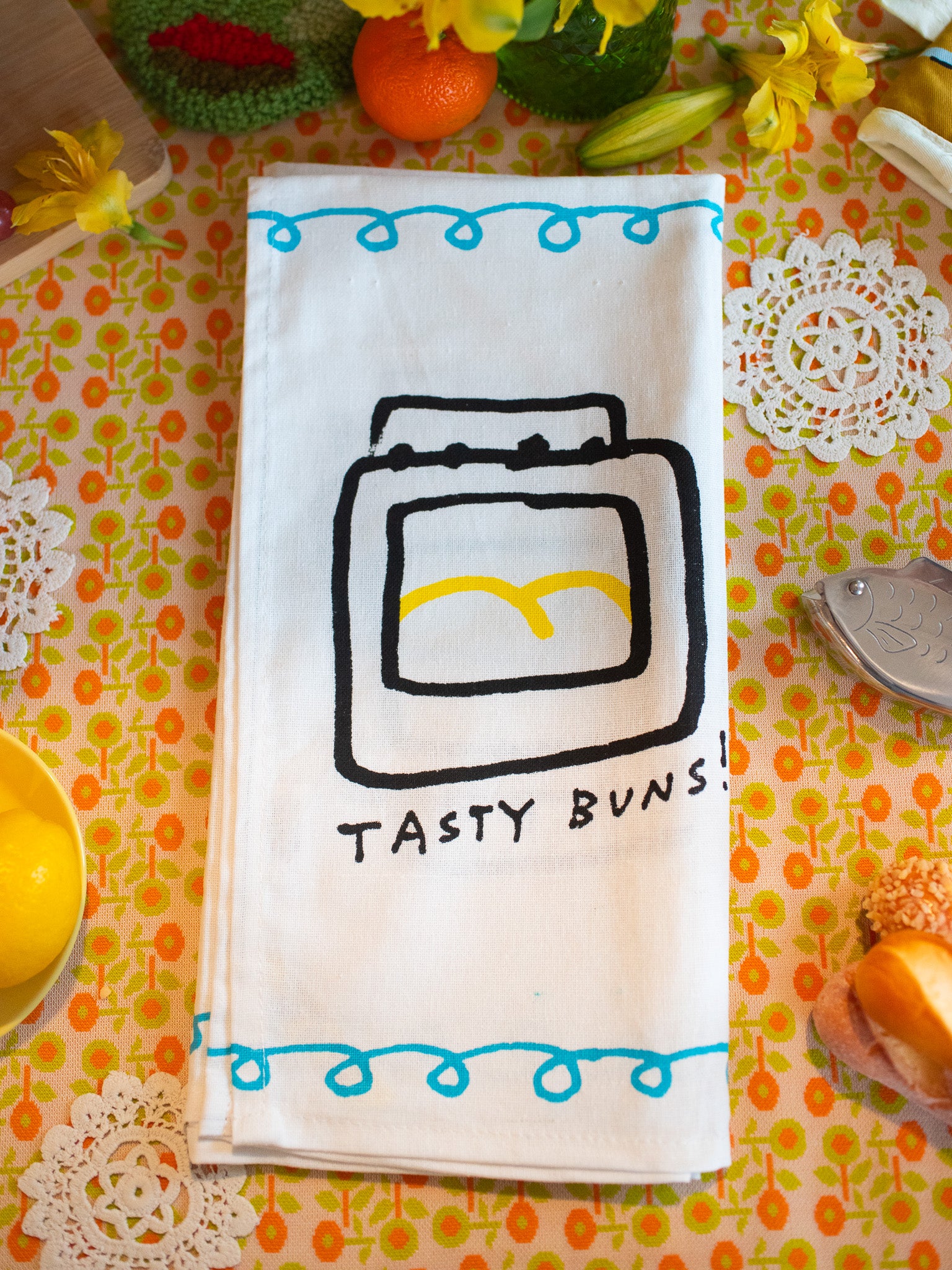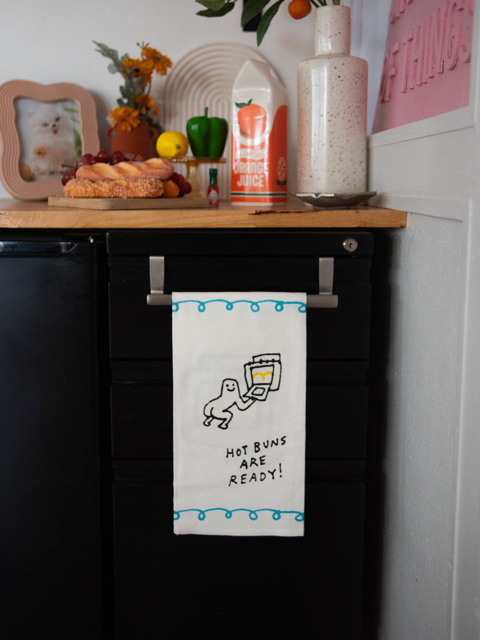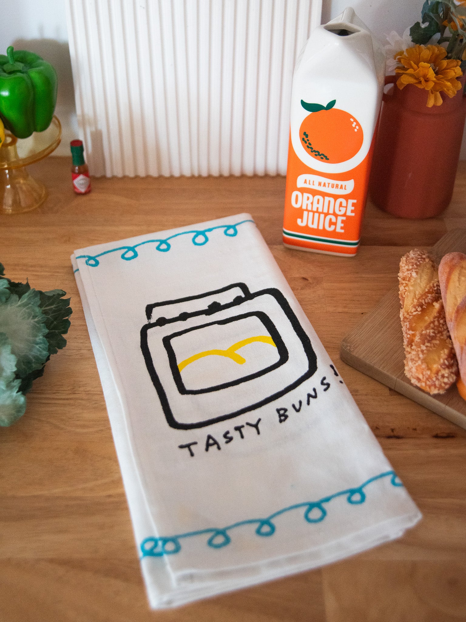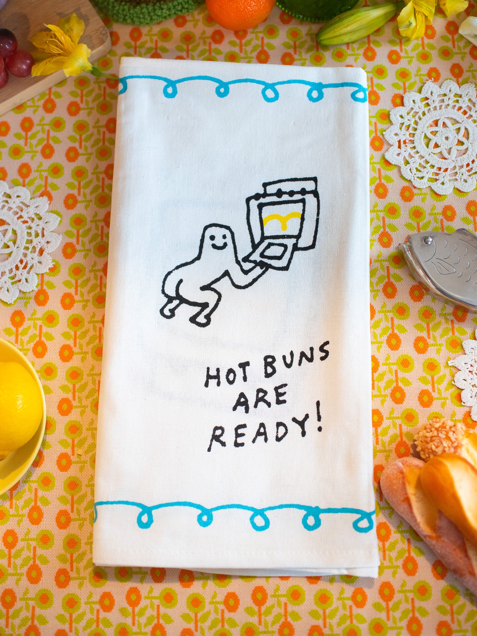This high quality dish towel is super absorbent and made with 100% cotton material! The towel folds out to reveal 6 ovens baking buns and one little baker getting his buns out! Pops of yellow and blue add some fun color to the black and white illustrations!