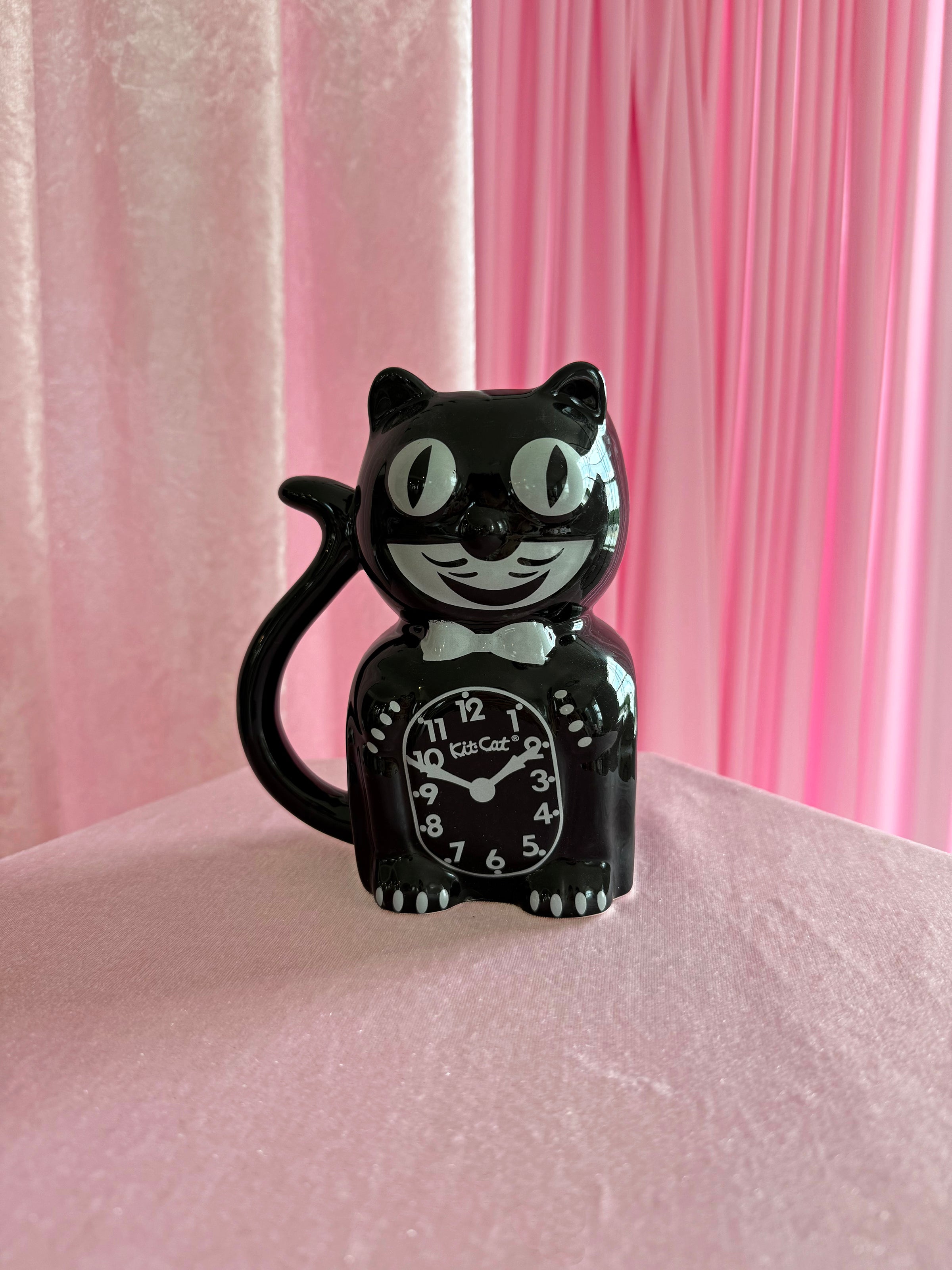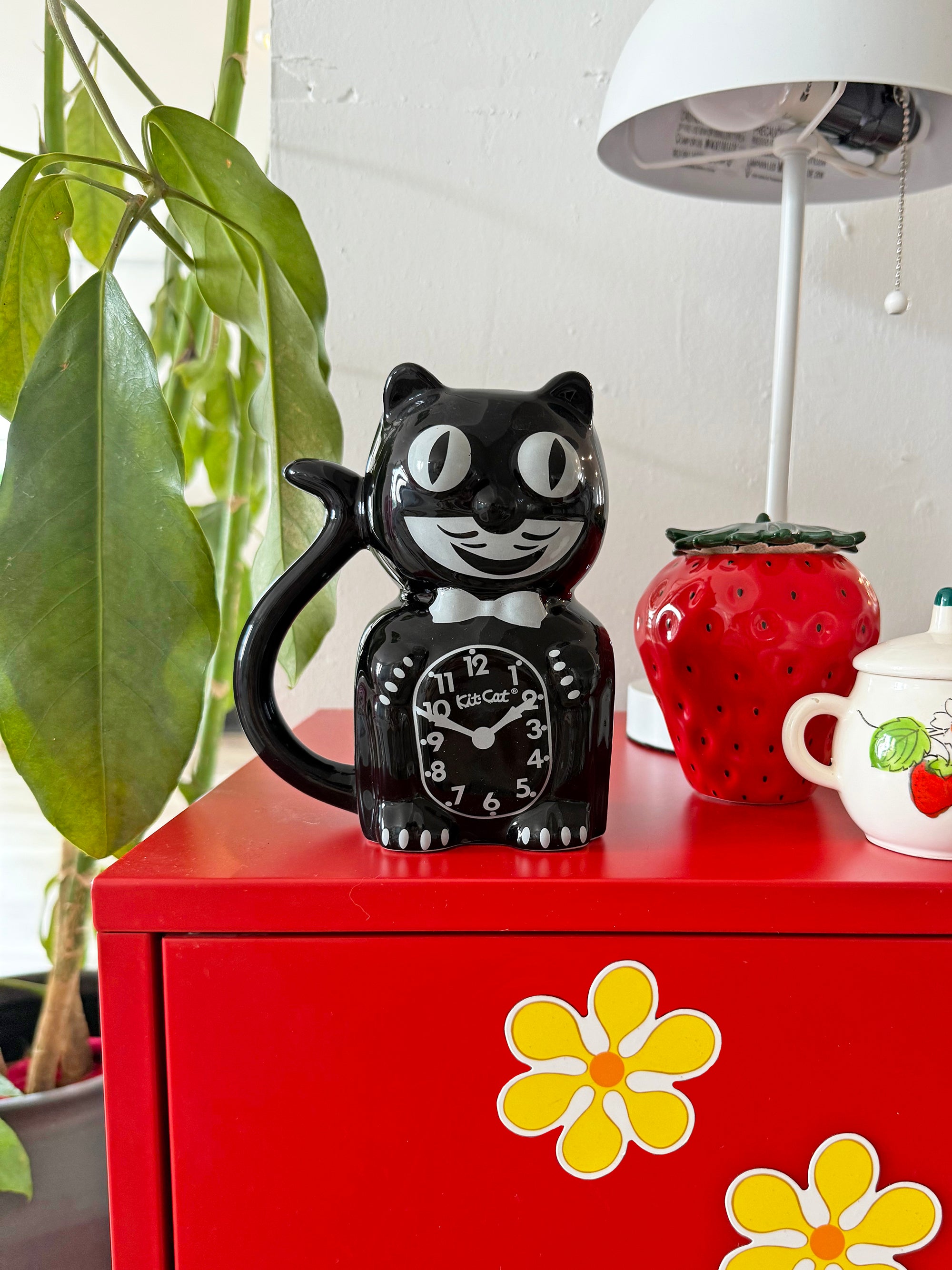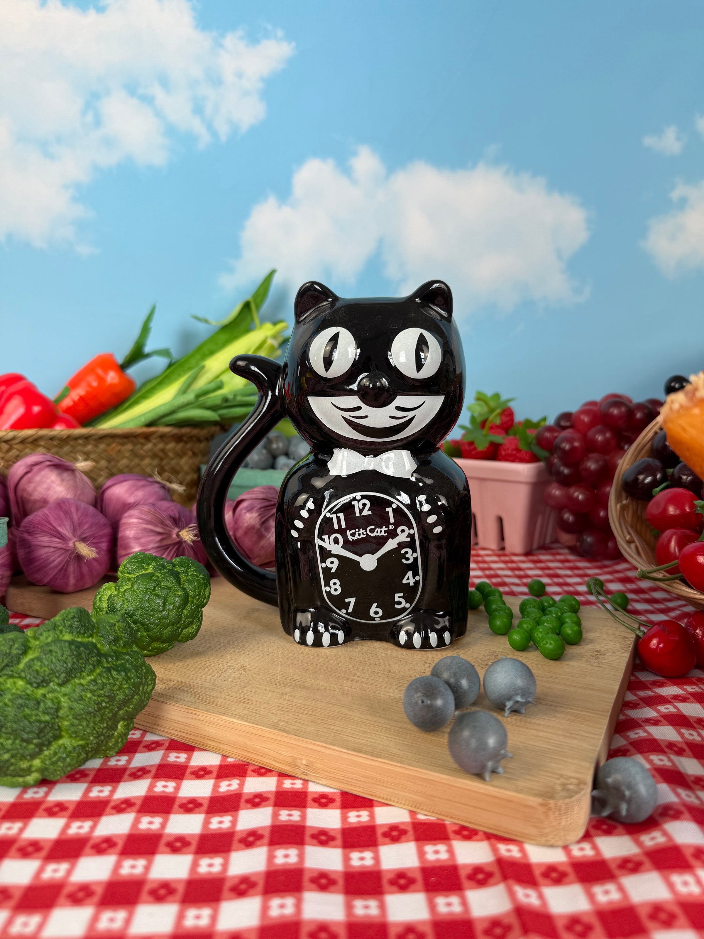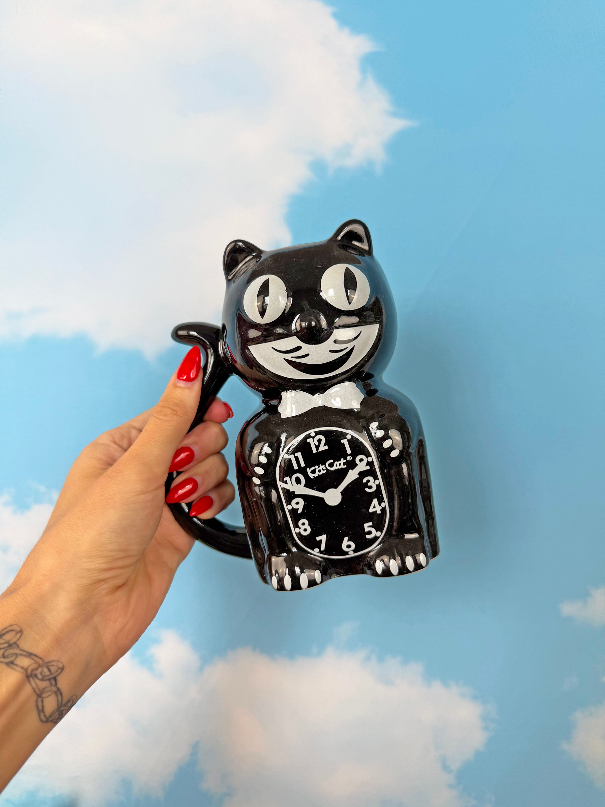 This adorable mug looks just like the original black and white Kit-Cat Klocks! It features Kit-Cat's iconic tail as the handle and a cute little painted clock on the front. Perfect for adding a touch of nostalgia to your morning bev!