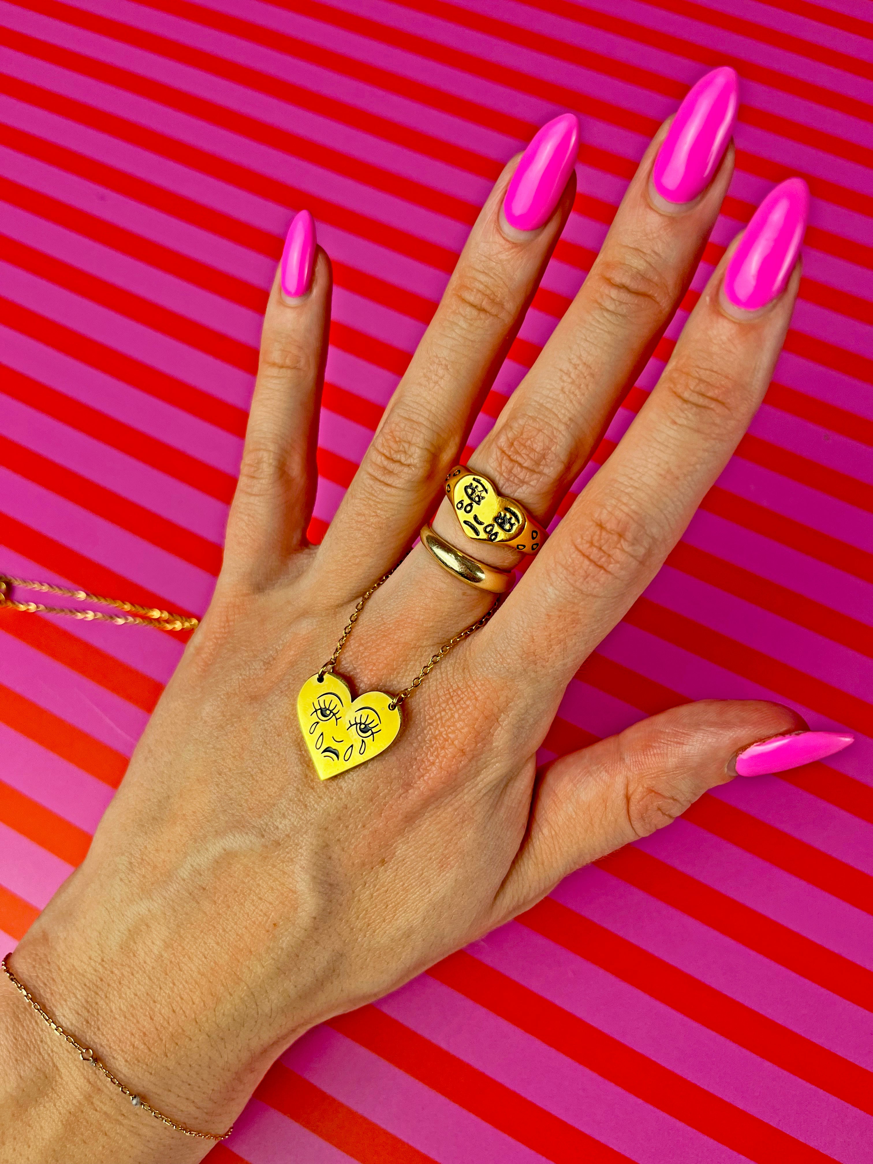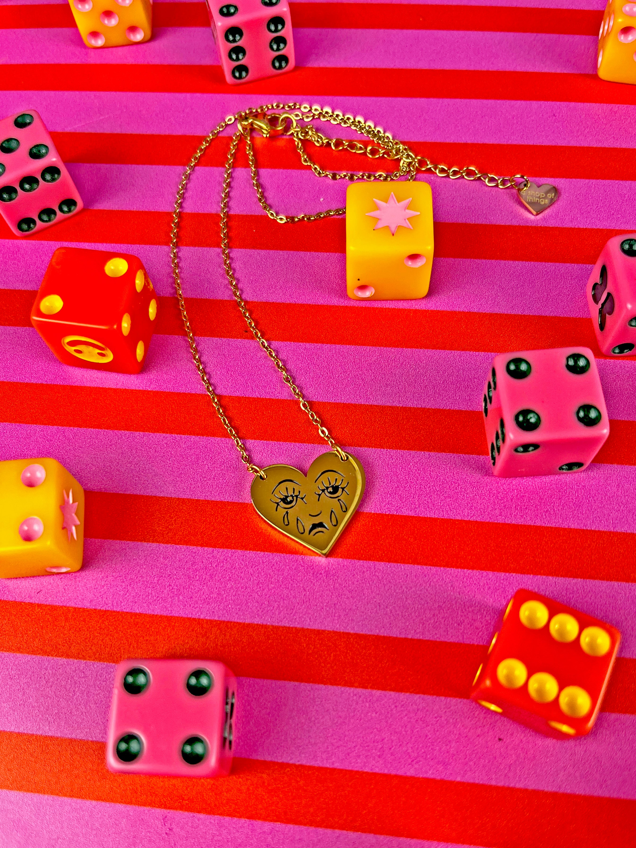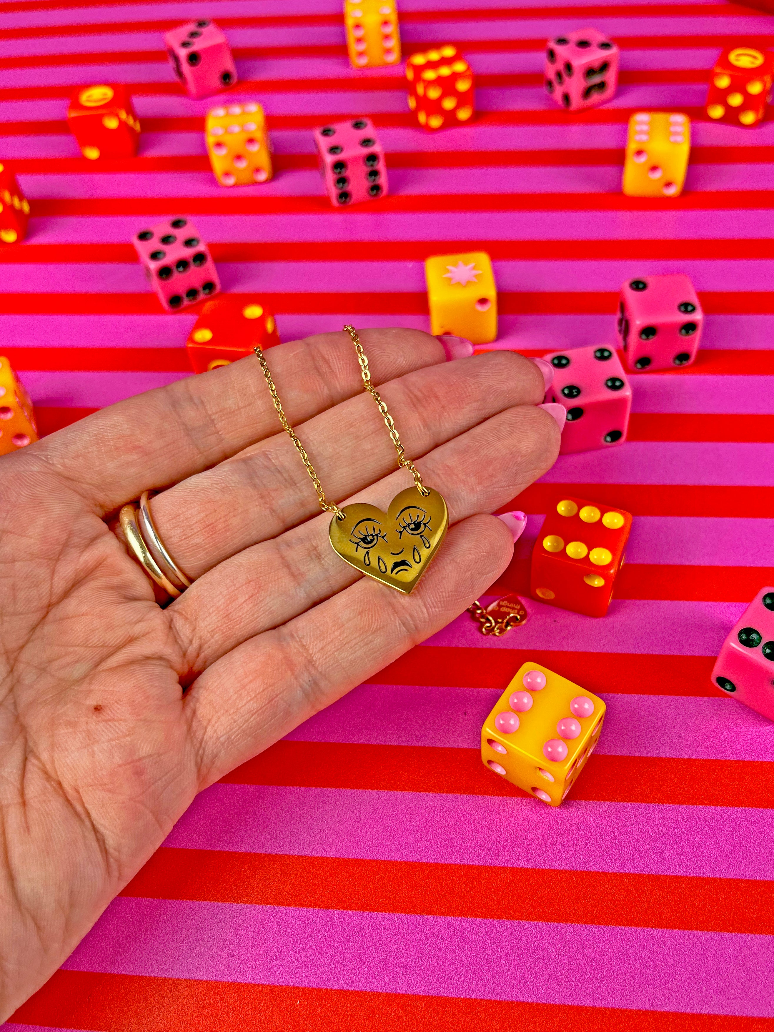 This necklace is for hot sad girls, cute sad girls, or those who love the charm of american traditional tattoos. Made of 14k gold plated stainless steel, a heart-shaped charm is strung on a link chain. Neck is adjustable up to 20". Heart measures 3/4"