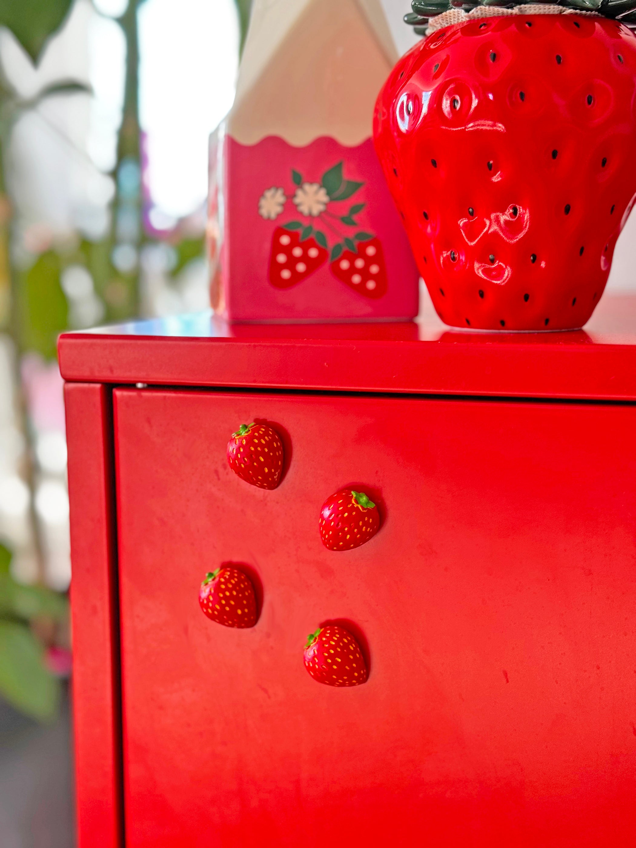 This set includes 4 strawberry magnets. These are extra strength magnets so you can be sure they'll stay put! Hand painted so slight variations may occur.Β