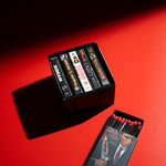 6 unique matchbooks designed to look like classic horror VHS tapes. Each matchbook sits inside a decorative box that looks like a retro TV! Designs include Halloween, Elvira: Mistress of the Dark, Scream, Killer Klowns from Outer Space, The Craft, and American Psycho.