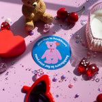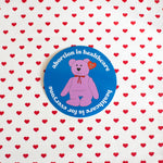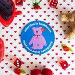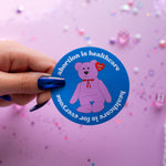 This sticker features a beanie bb advocating for healthcare. Sticker reads: abortion is healthcare / healthcare is for everyone.