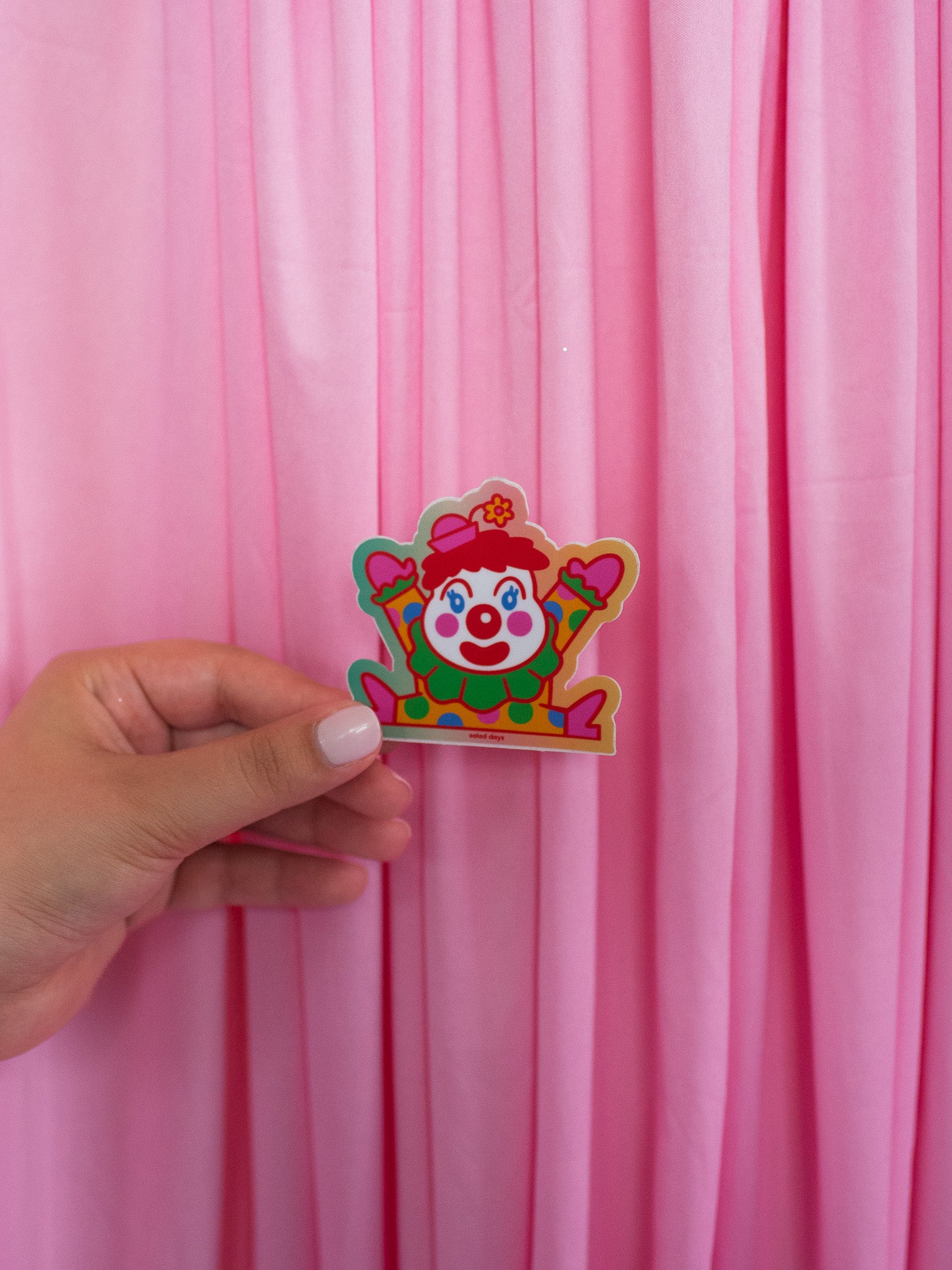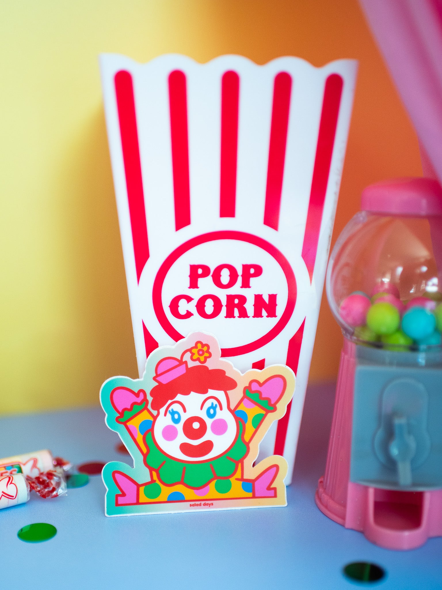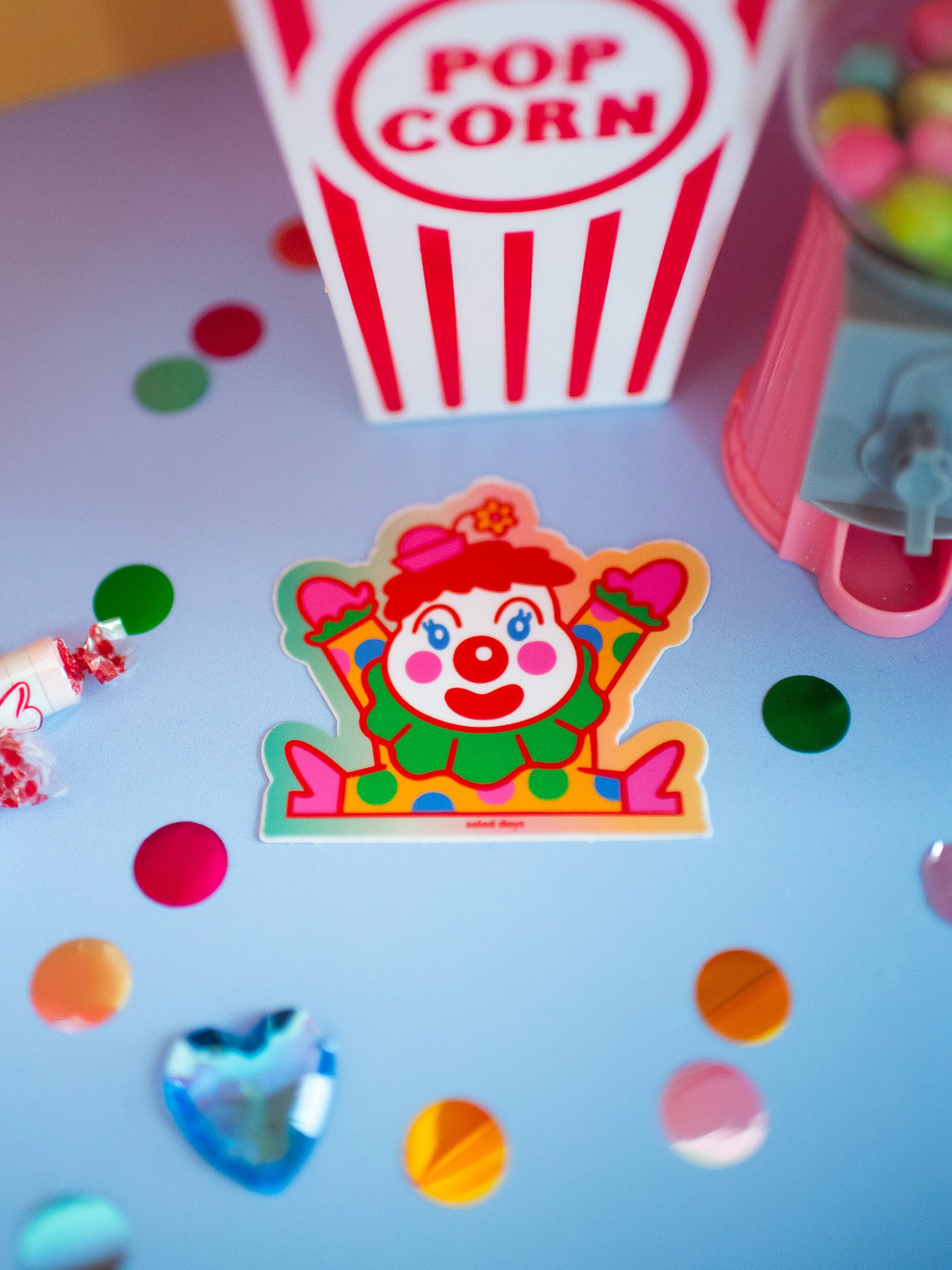 This vinyl sticker features a silly little clown doing the splits and wearing the cutest lil hat you've ever seen!!
