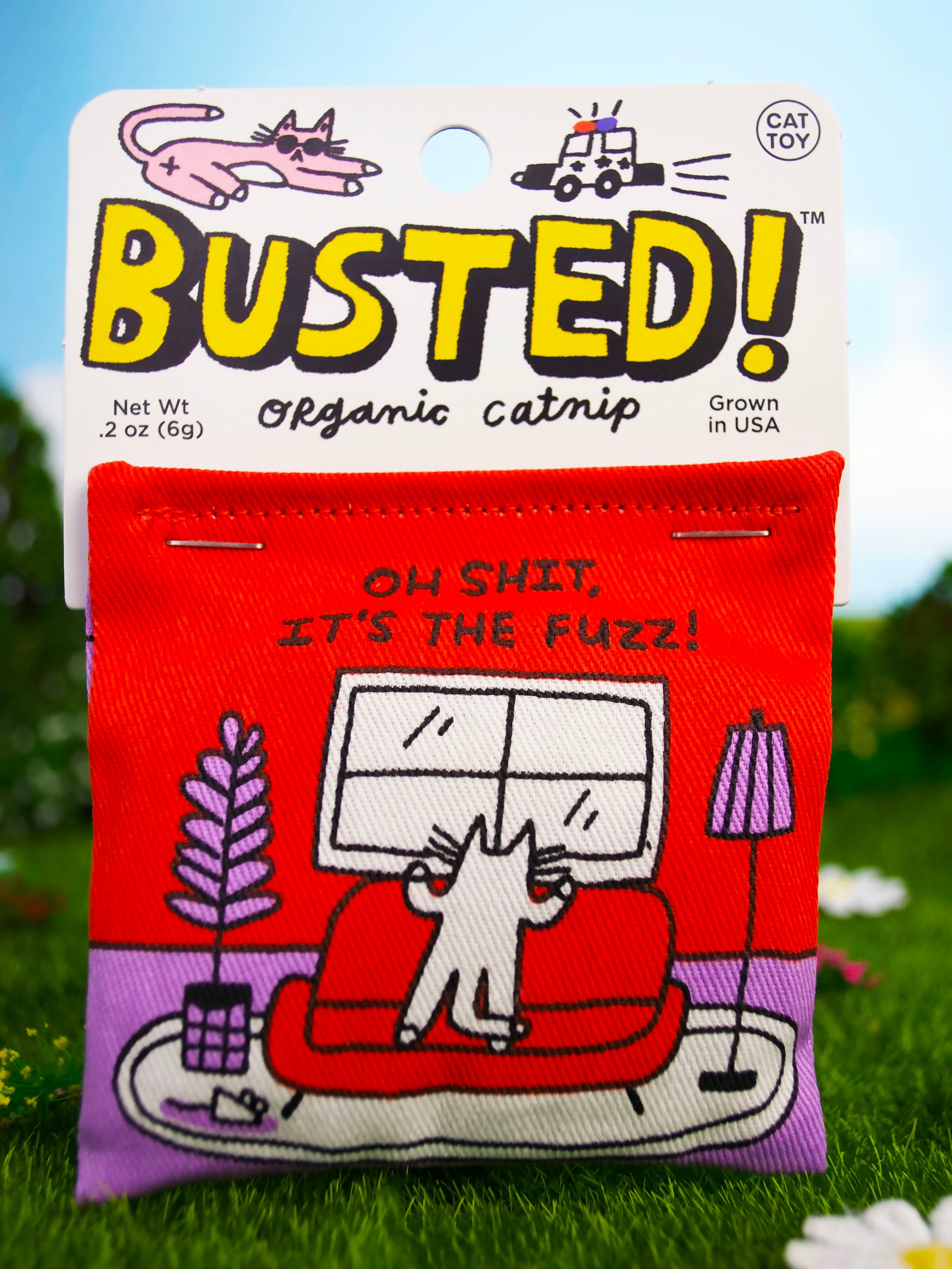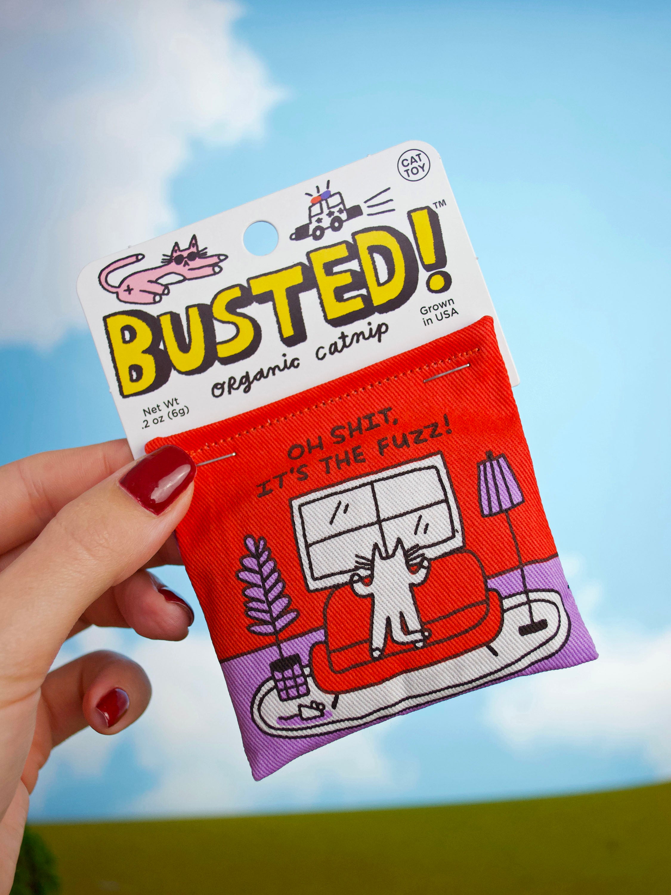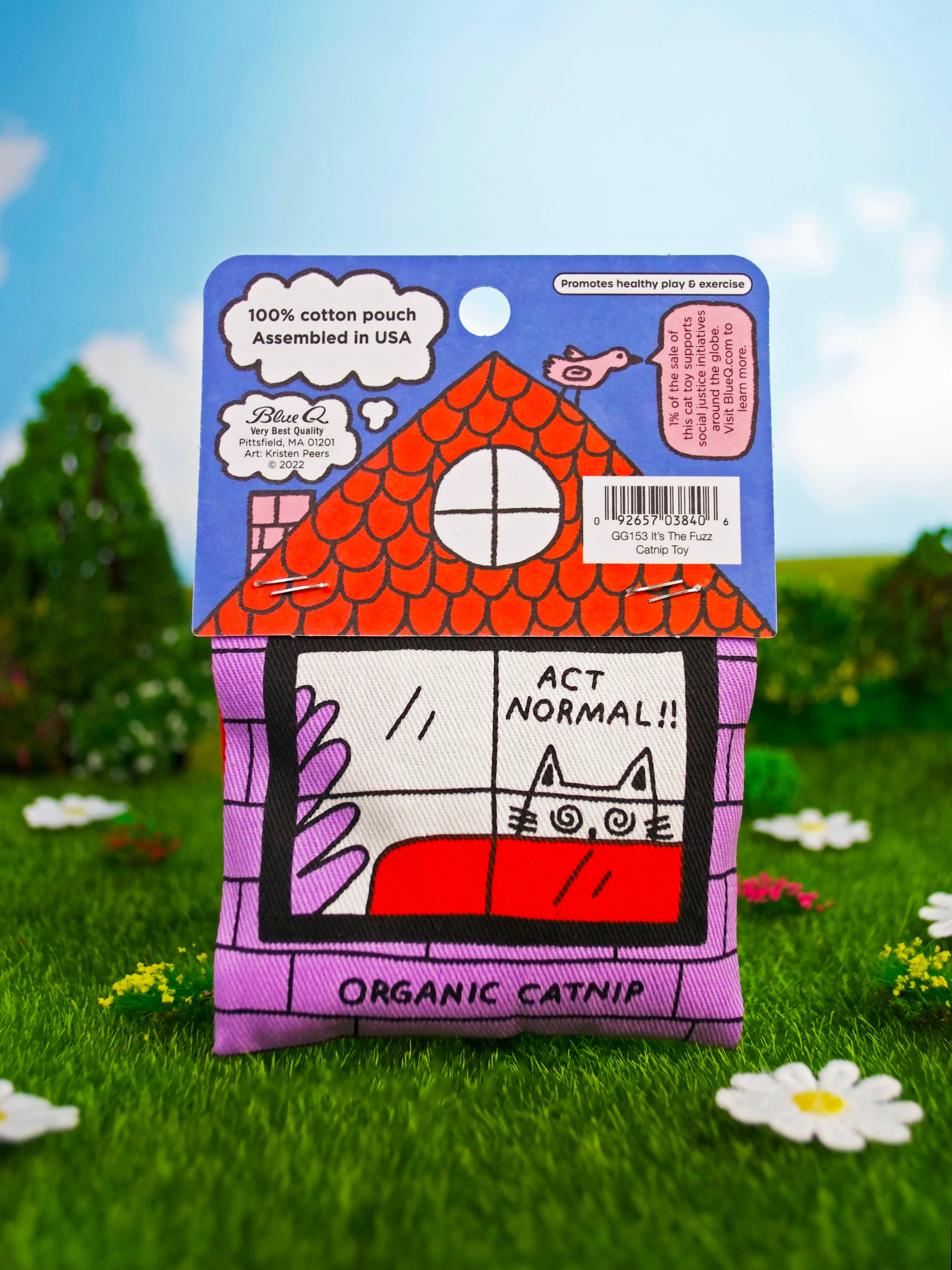 Featuring a kitty peeking out the window and the saying, "oh shit. it's the fuzz!" on one side, and another window cat saying, "act normal!!" on the other!