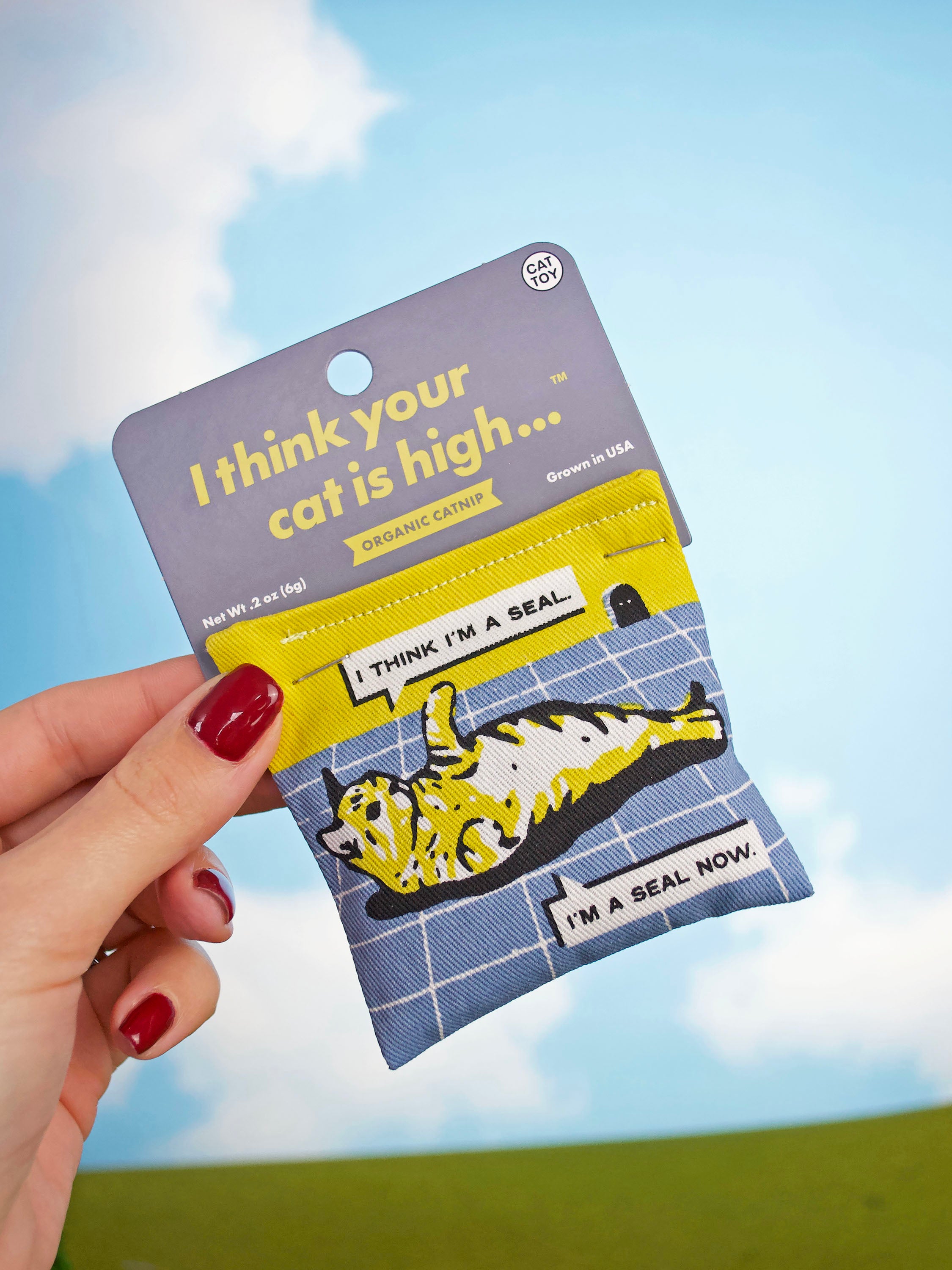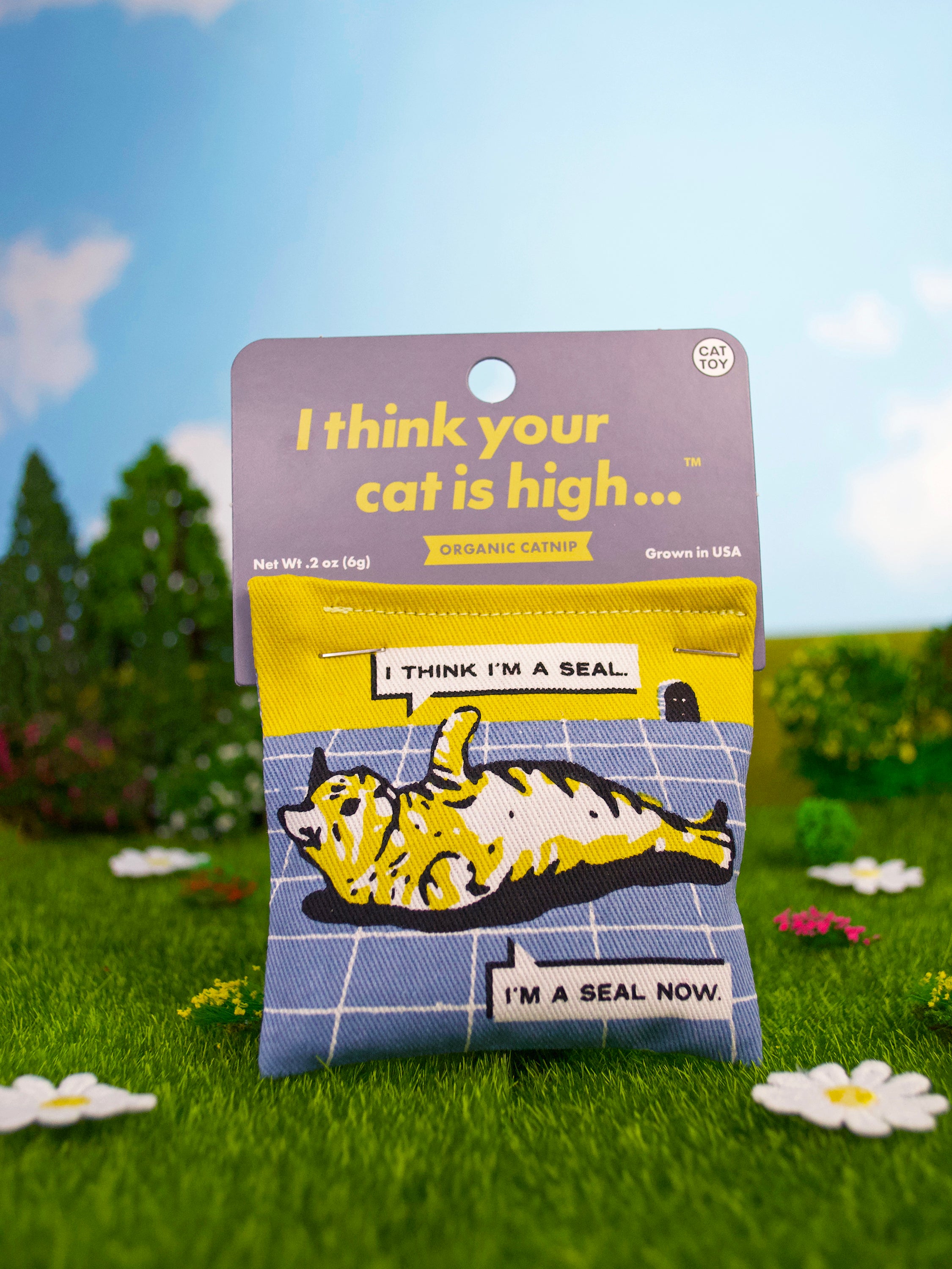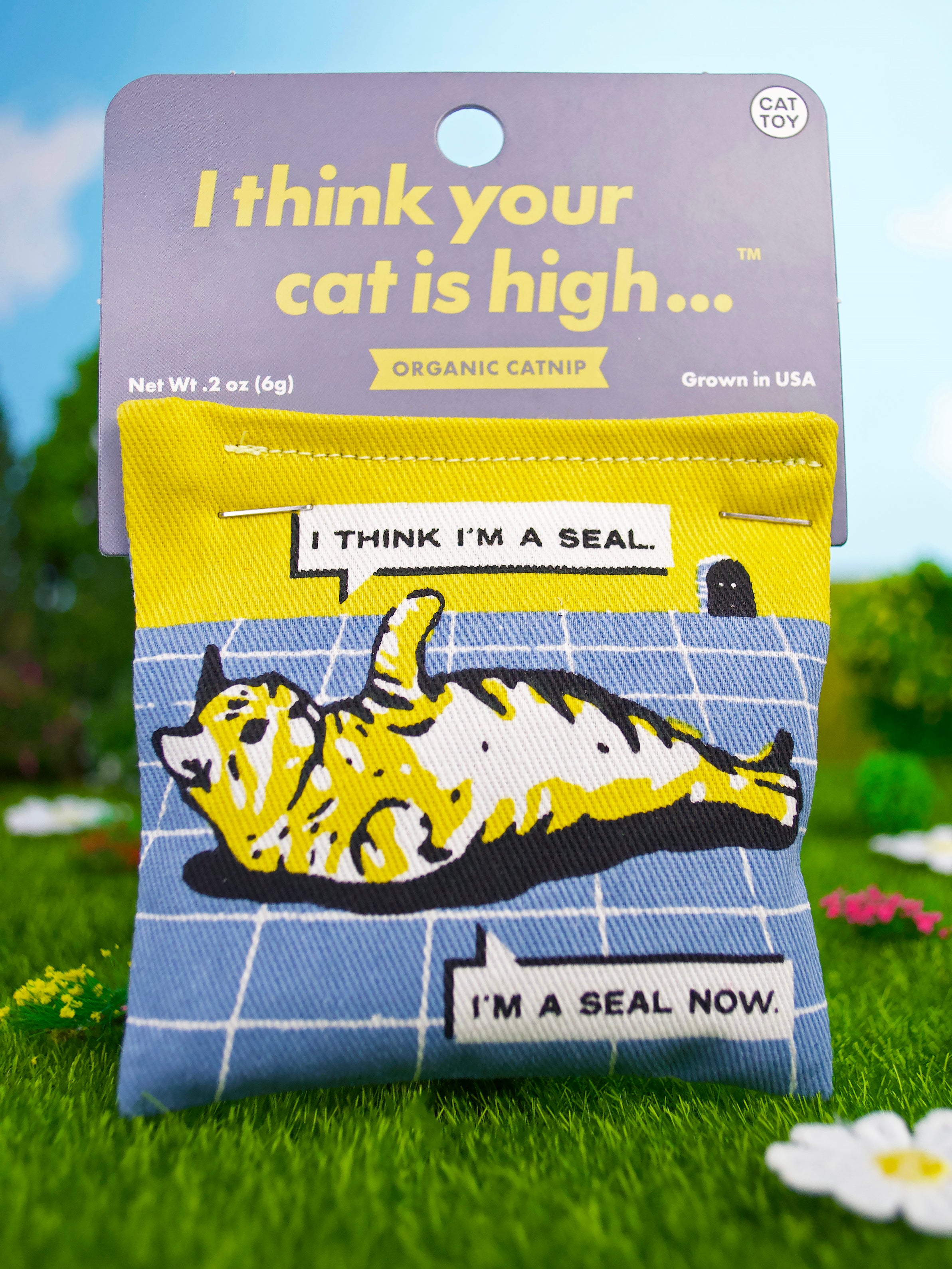 Featuring a relaxed kitty saying, "I think I'm a seal. I'm a seal now." on one side, and a mouse saying "I think your cat is high" on the other!