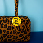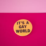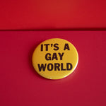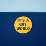 This bright yellow button pin reads, "it's a gay world" in a black font! Iconic.