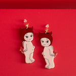 These handmade earrings feature our favorite little angels in devil outfits, horns and all!! You just know they're up to no good! Made from acrylic and 18k gold plated stainless steel.
