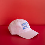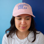 This light pink dad hat reads "protect the dolls" in blue embroidery across the front. Looks perf with any outfit and is adjustable - we love!!