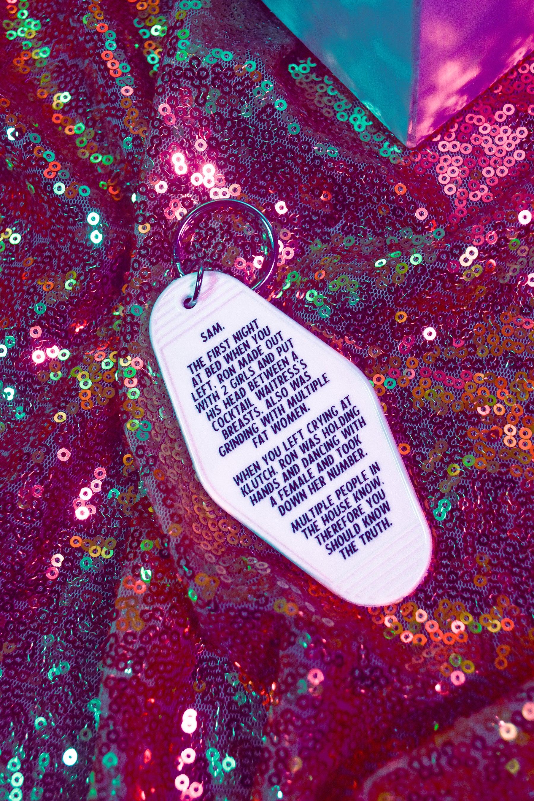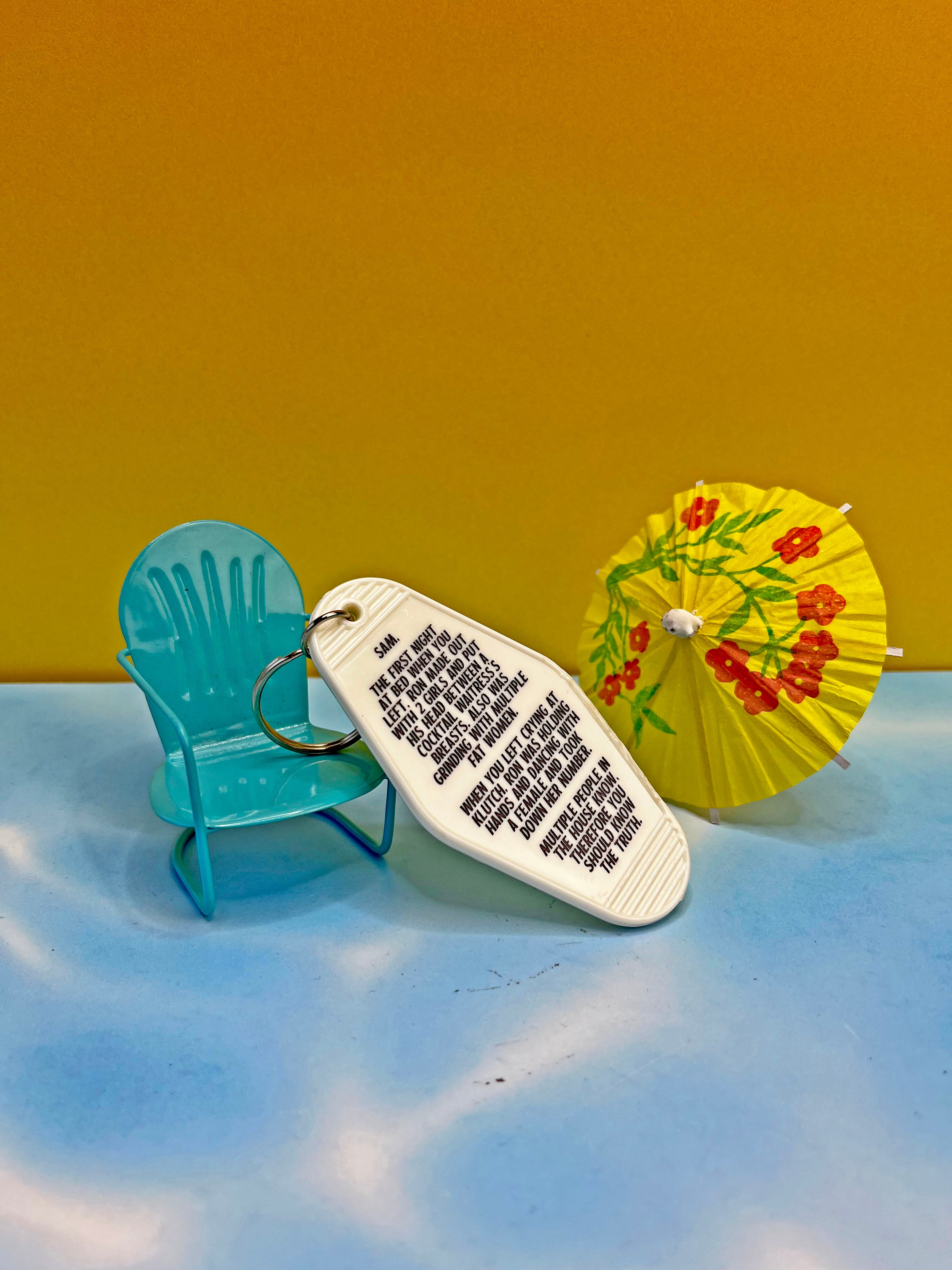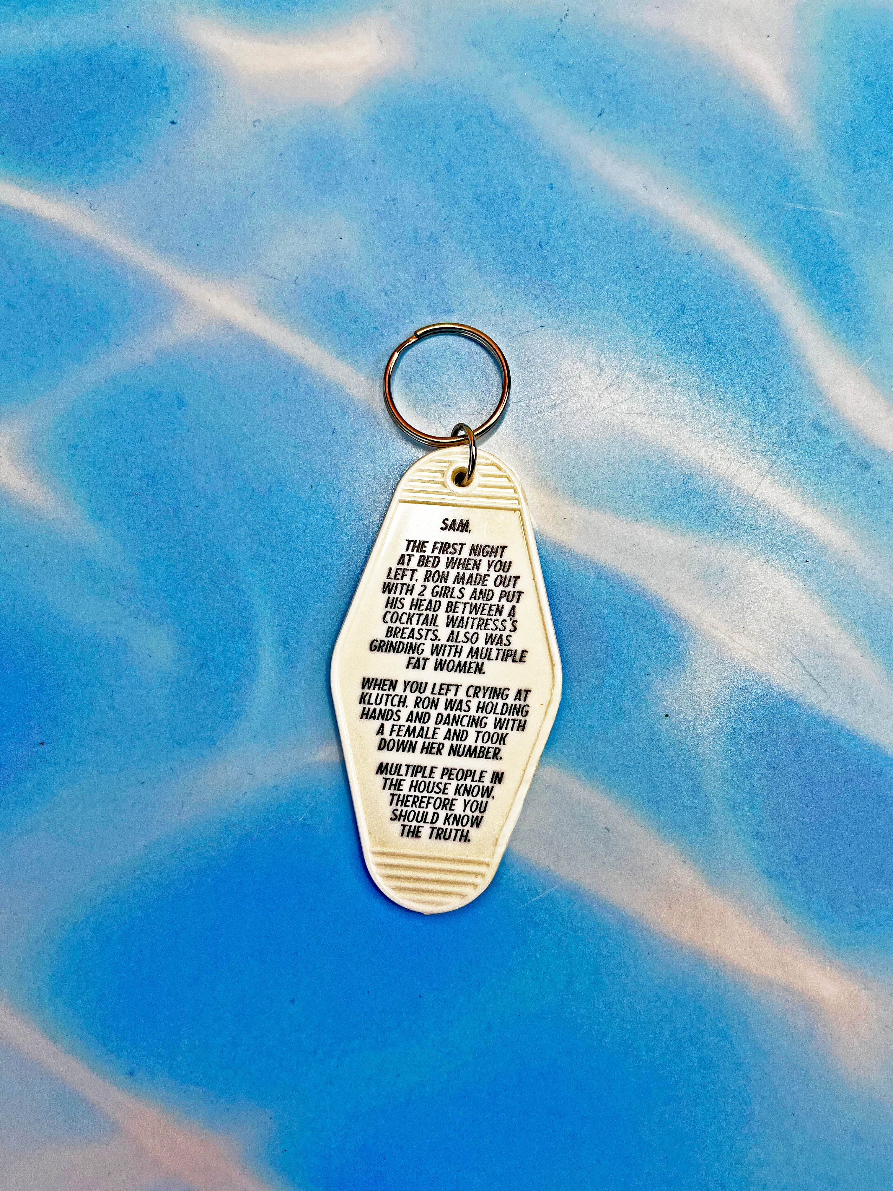 Vintage style motel keychain features an anonymous letter from JWoww and Snooki to Sammi.