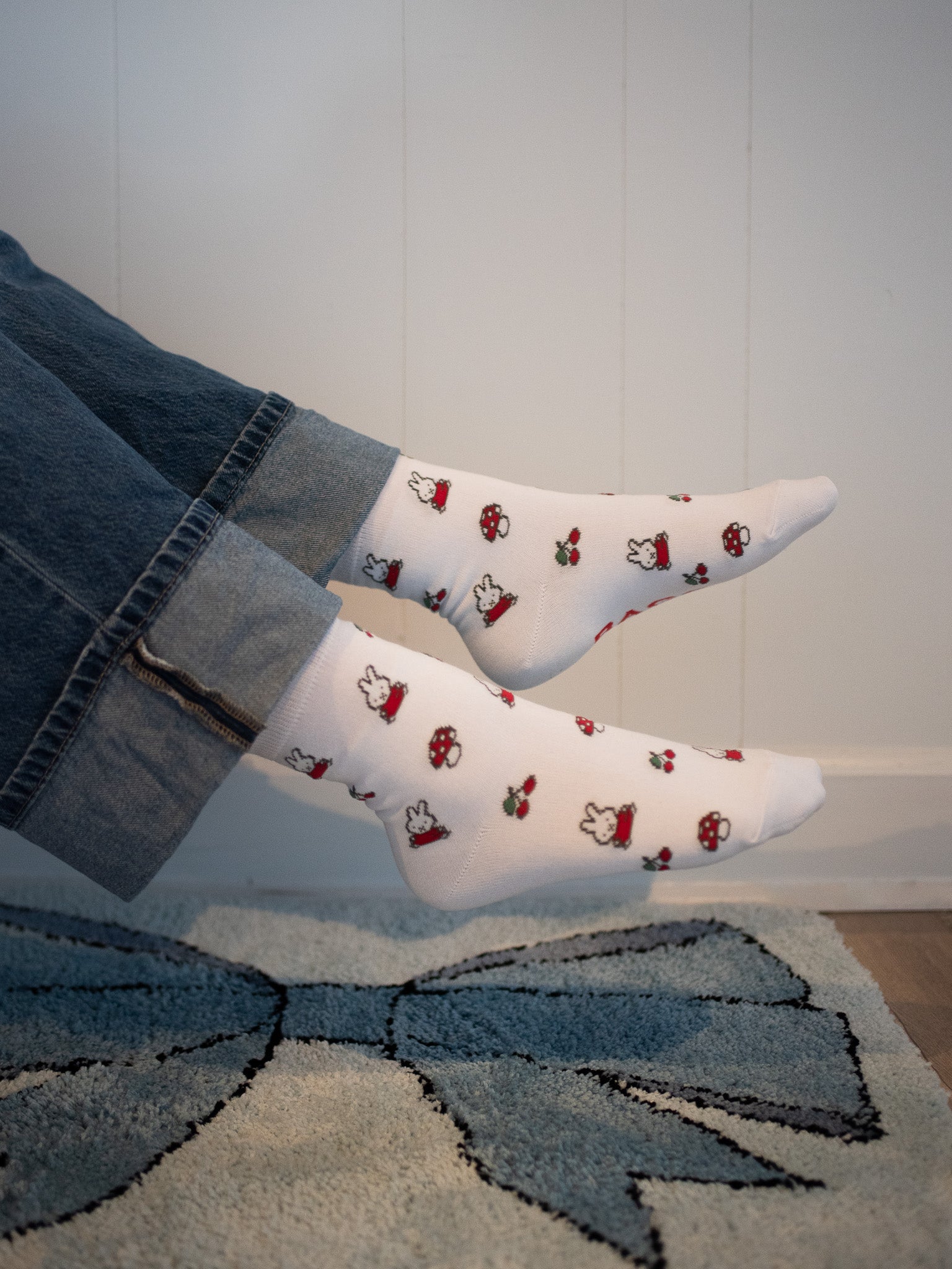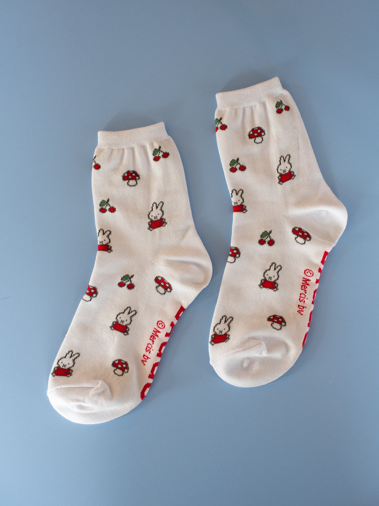 Socks are just bags for your feet, right? These crew socks are woven from soft and stretchy bamboo rayon material and feature a repeating design of Miffy with cherries and mushrooms! AH so cute!