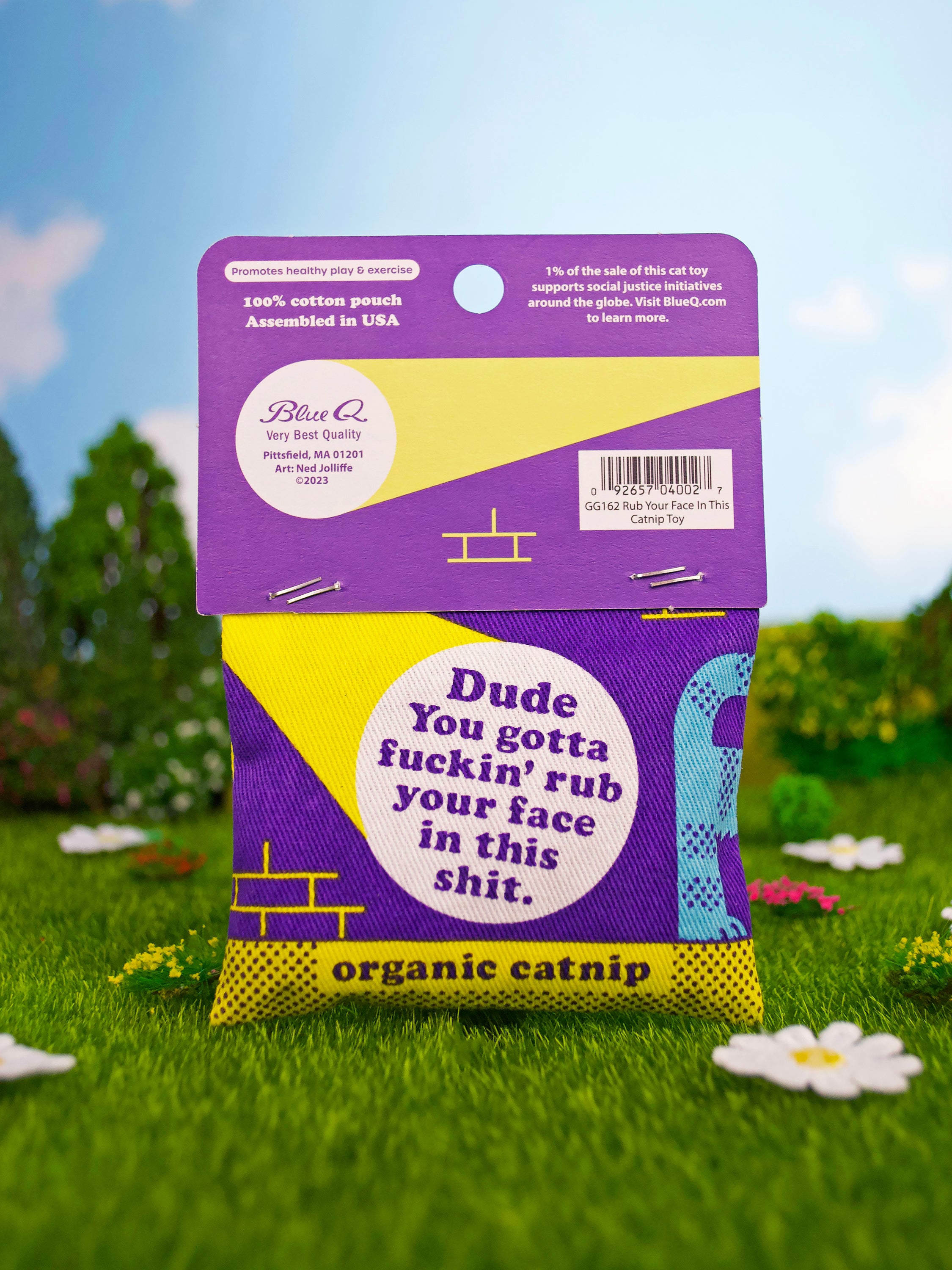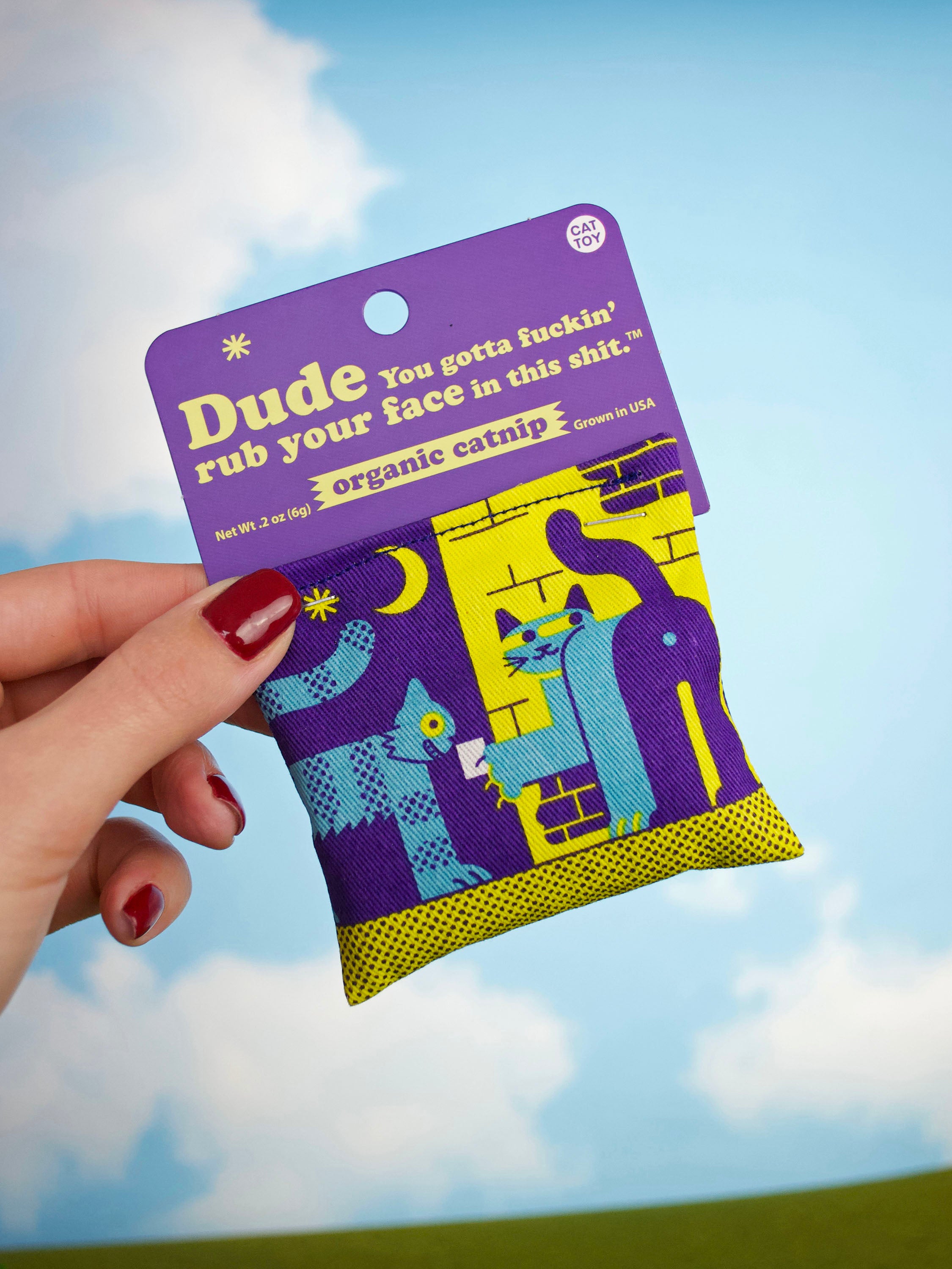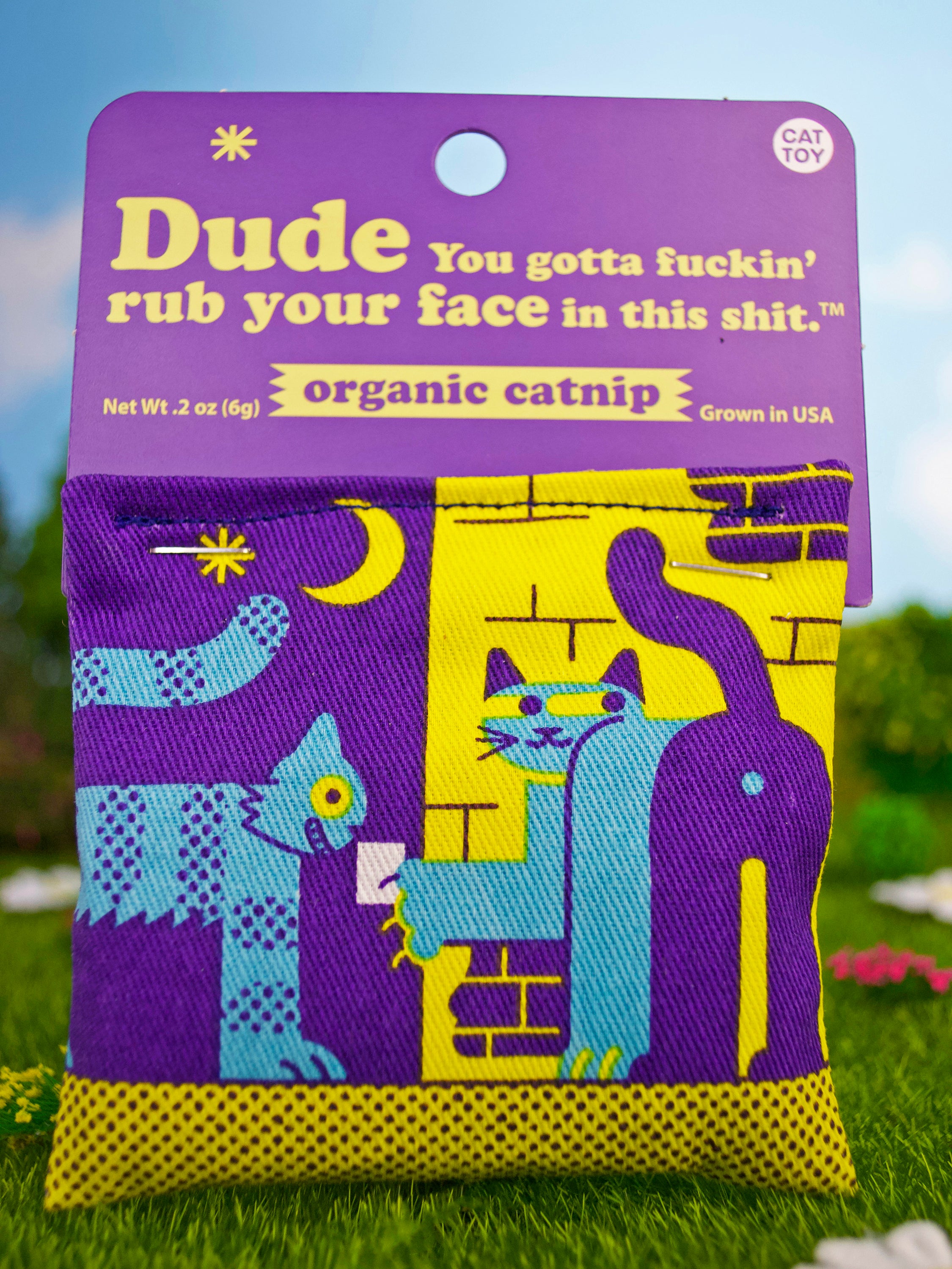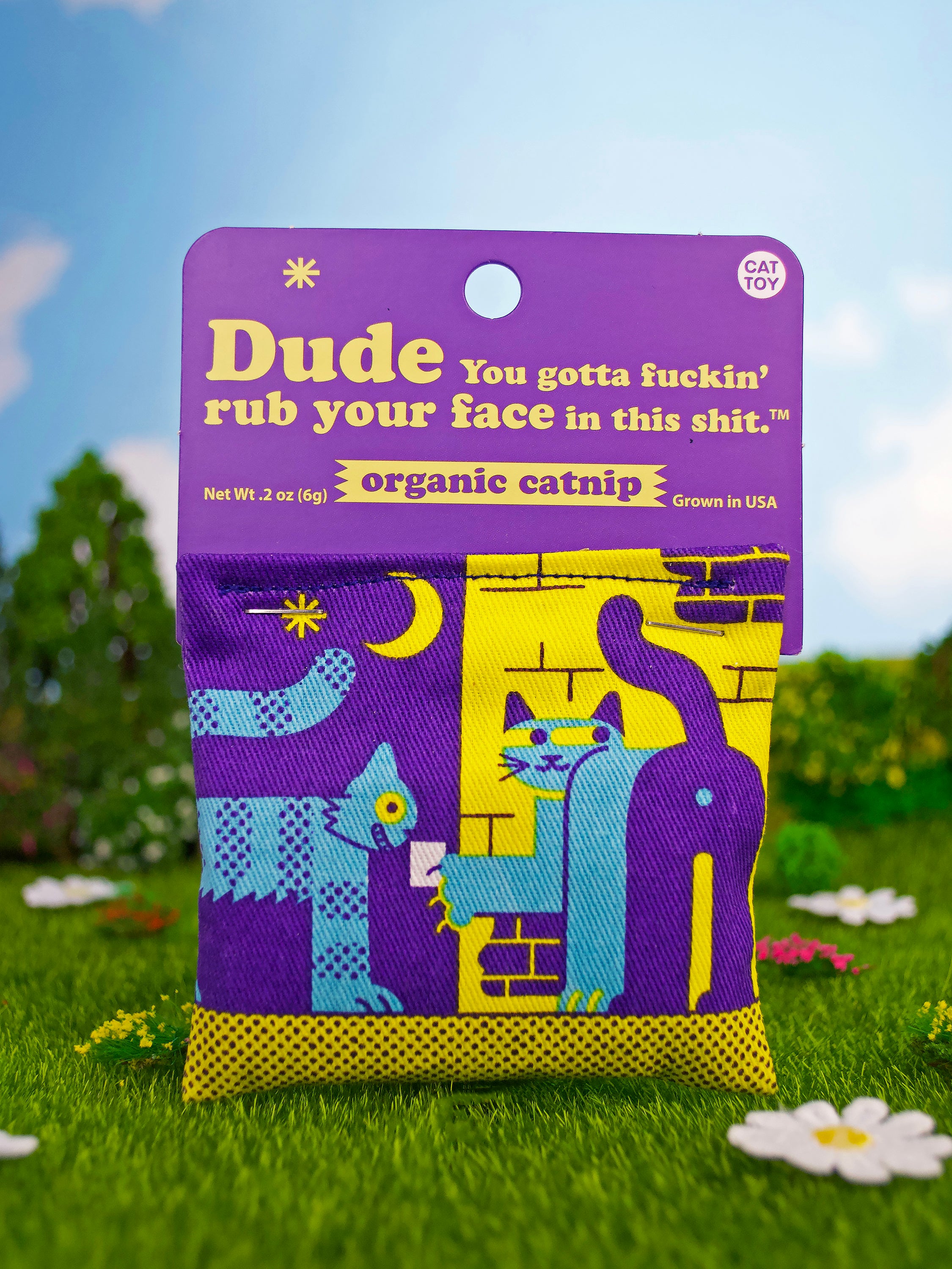 Featuring a cat buying "cat nip" on one side and the saying, " Dude You Gotta Fuckin' Rub Your Face In This Shit" on the other!