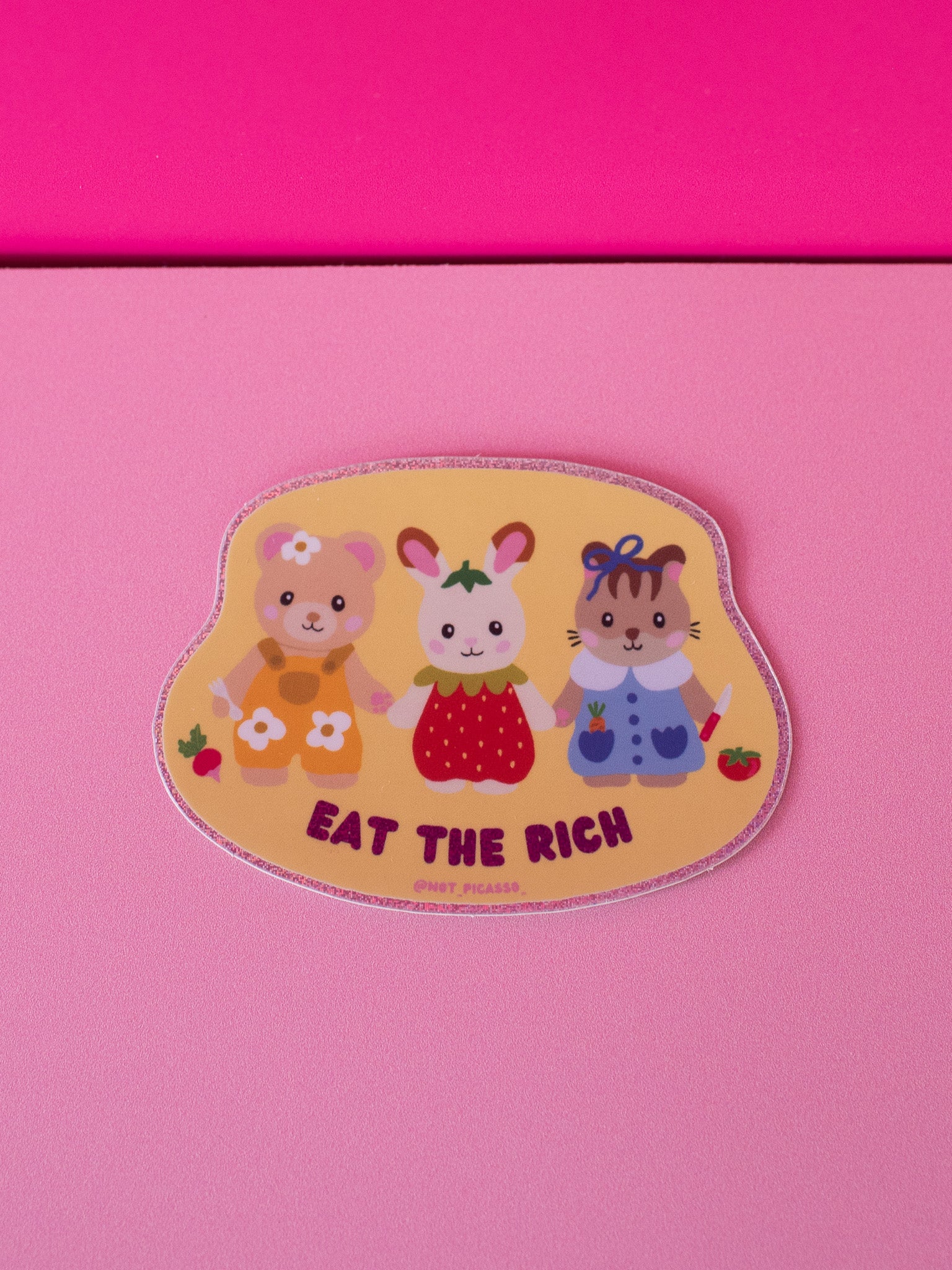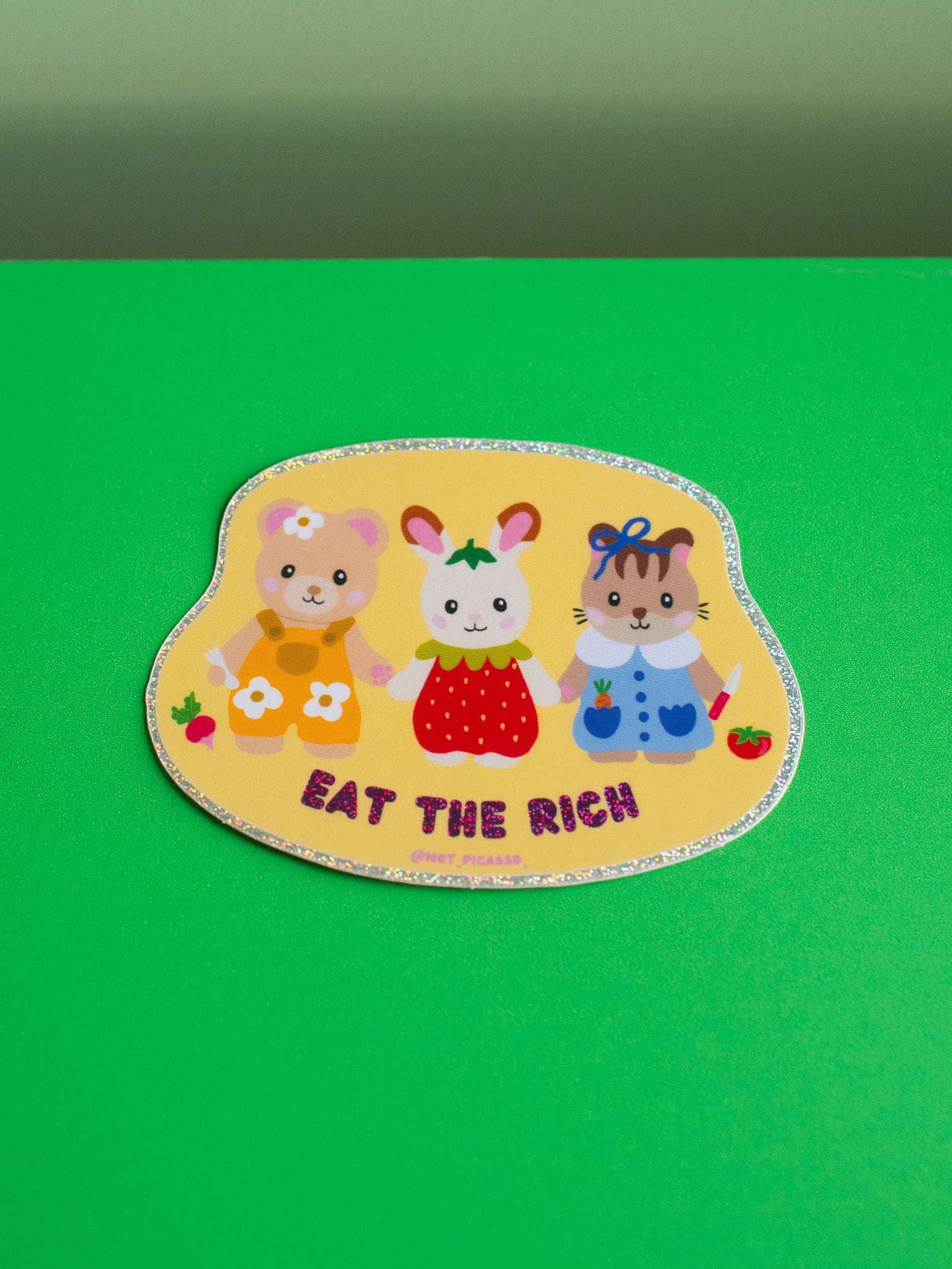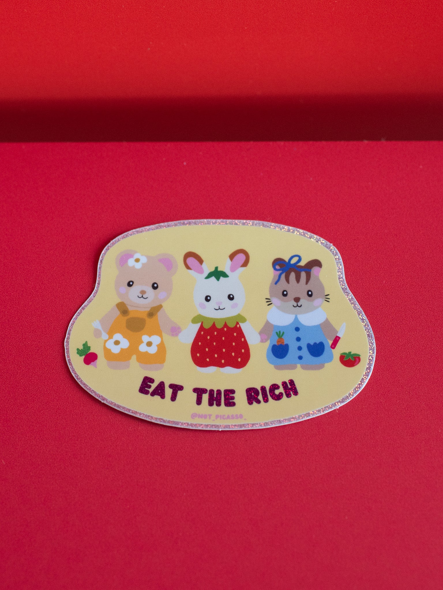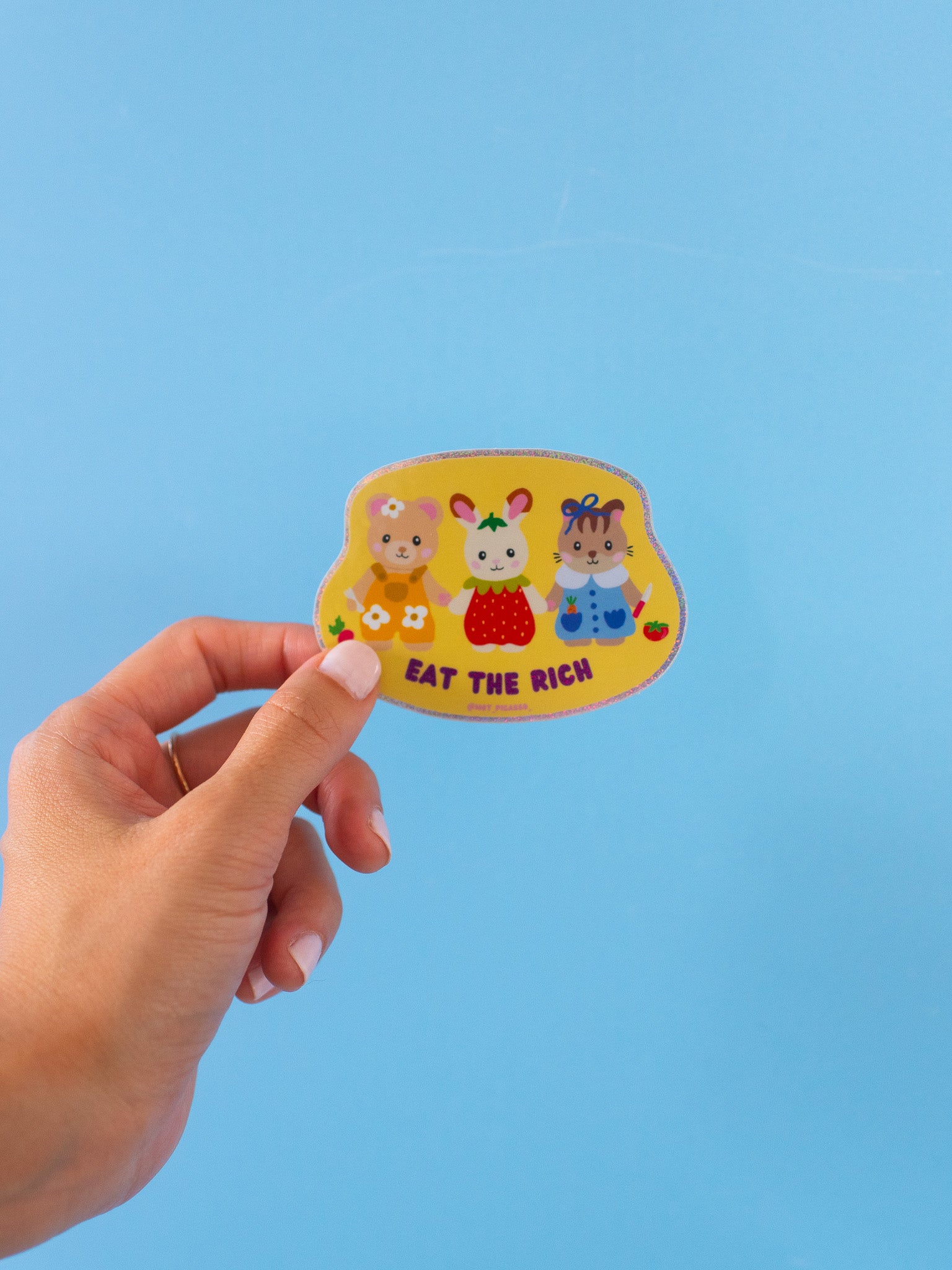 This sticker reads "eat the rich" in holographic glitter and features three cute critters who are ready to eat! nom nom nom