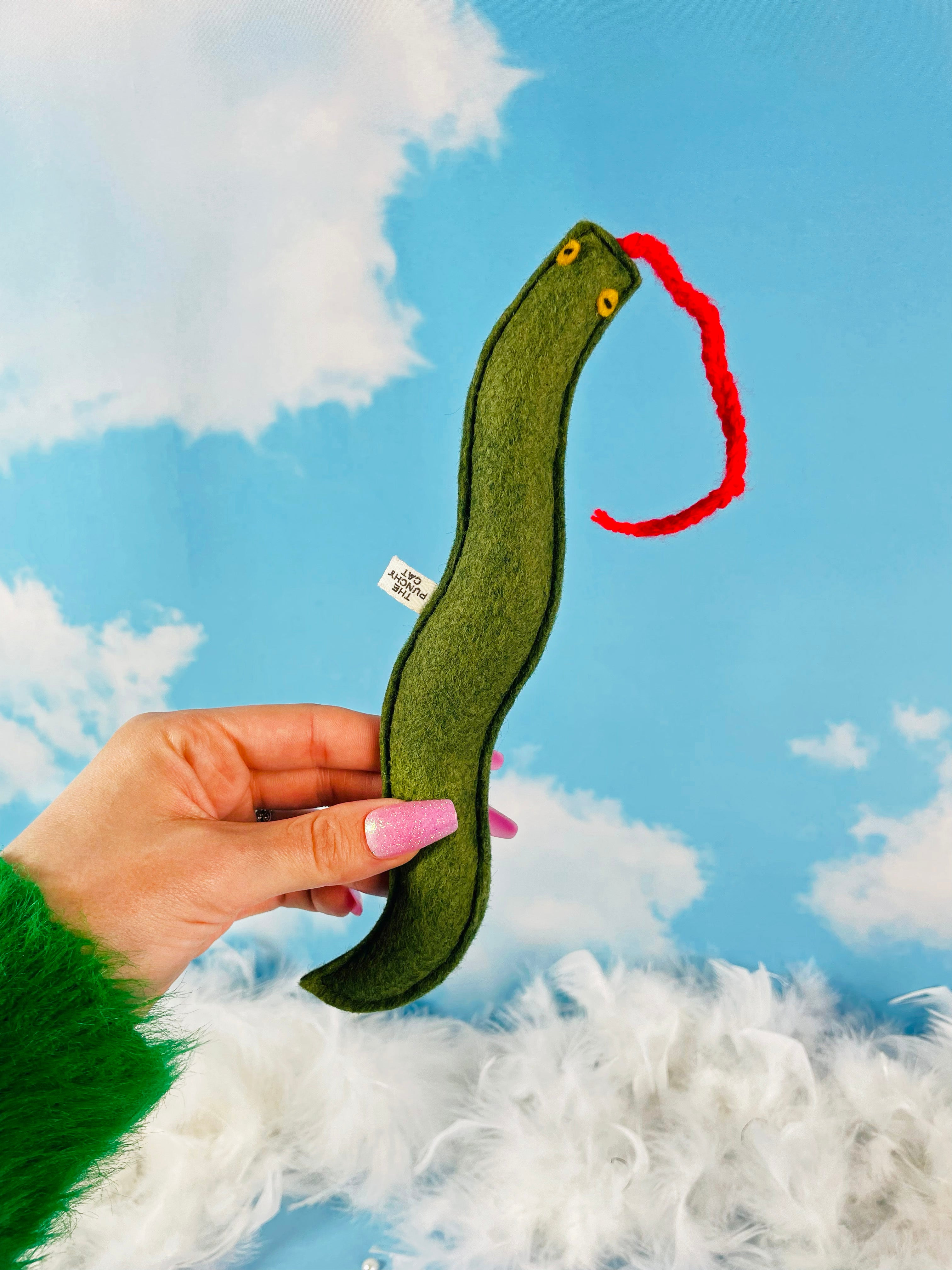 Measures 9" long, not including the tongue! Every toy is one-of-a-kind and variations are to be expected as is the charming nature of a handmade product.