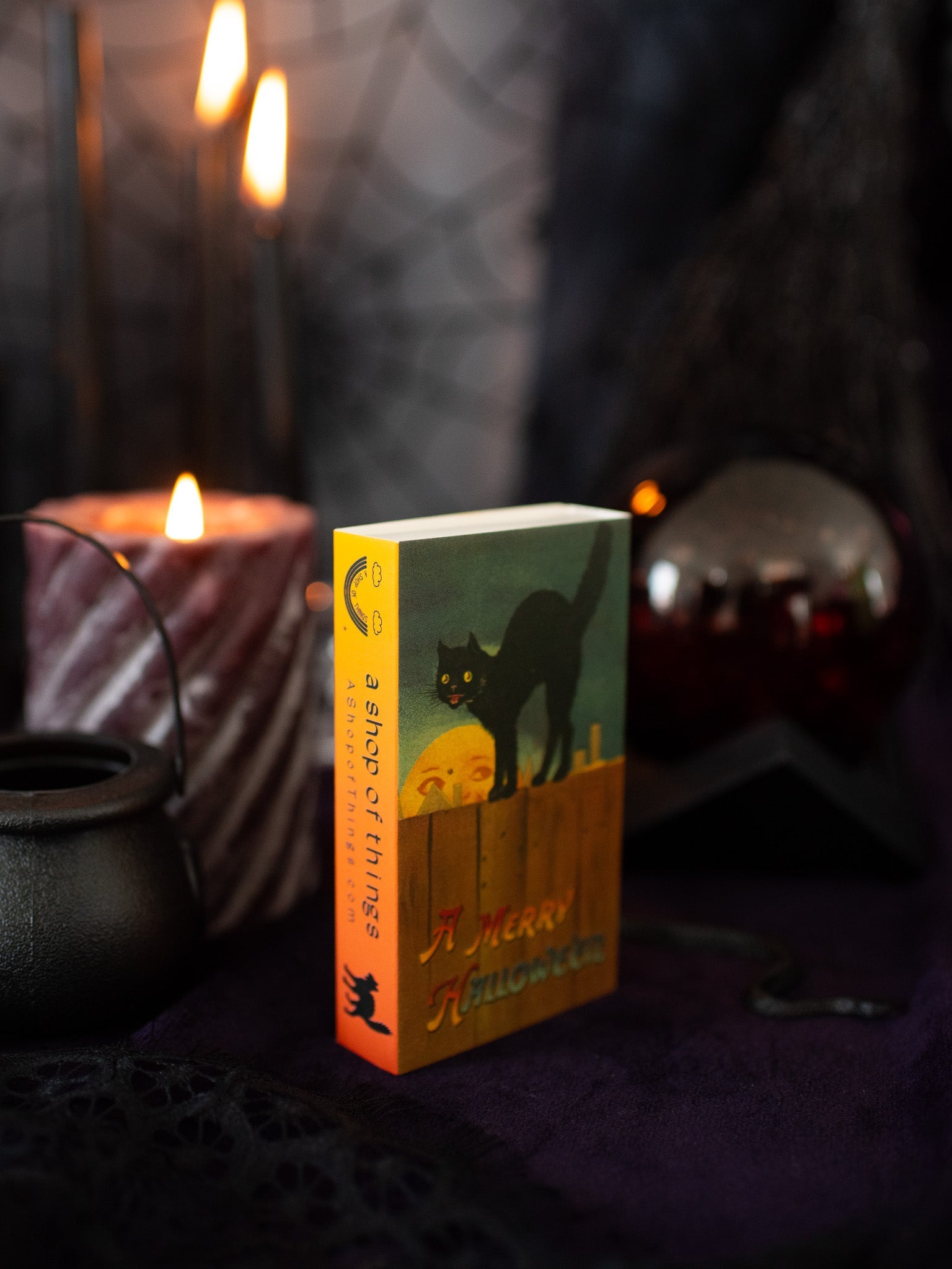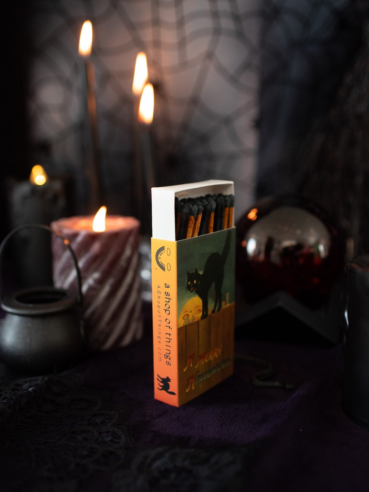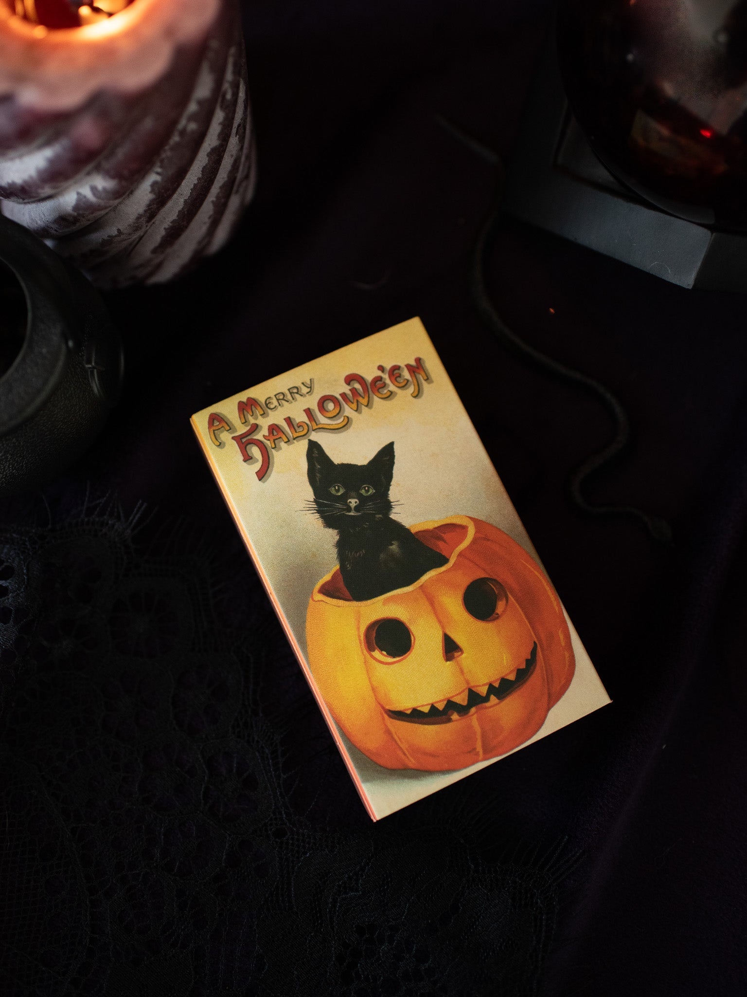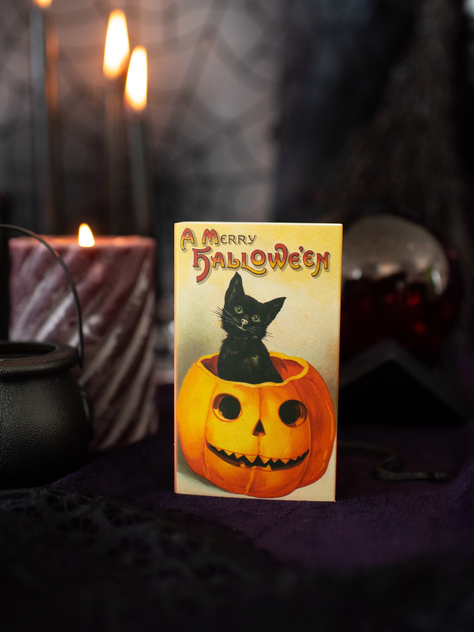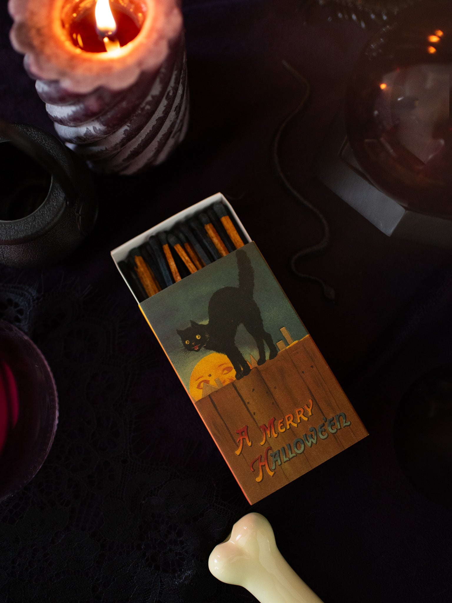The match box features different art on the front and back! One side features a black cat sneaking on a fence. The other side features a black cat adorably sitting in a pumpkin! Both sides read "A Merry Hallowe'en." On the side of the matchbox is a striker and inside are special black/orange and solid black large match sticks.