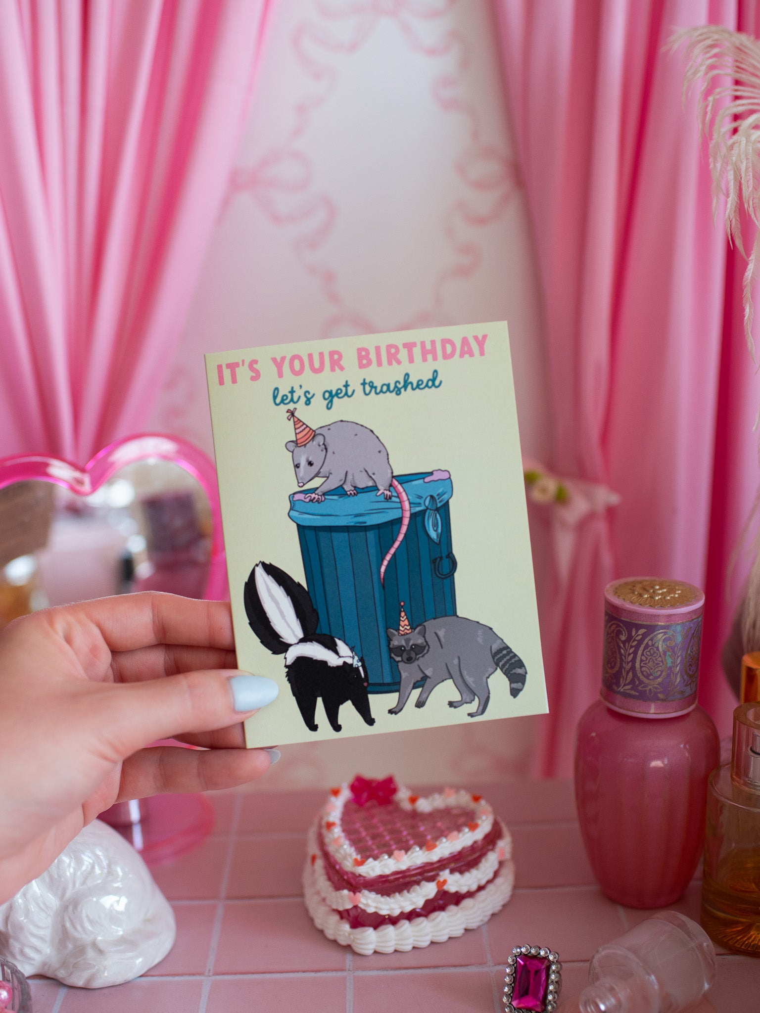 This card is adorable! It features a trashcan surrounded by a cutie raccoon, skunk and opossum wearing party hats and preparing to dig into your birthday feast leftovers! The front of the card reads "It's your birthday let's get trashed". Perfect card for the party animal in your life!