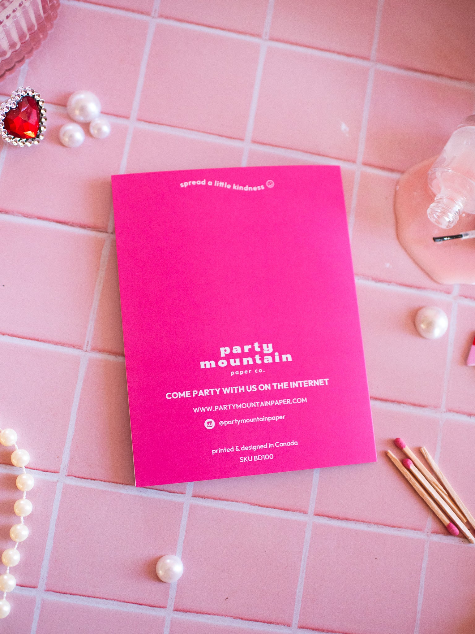 This card is stunning! Comes in a pretty pink color featuring everyone's fave gal, Chappell Roan standing in front of a vintage-style neon heart sign. The front of the card reads "Ultra Modern Graphic Birthday Girl!" Perfect birthday card for the Chappell fan in your life - we all know one!