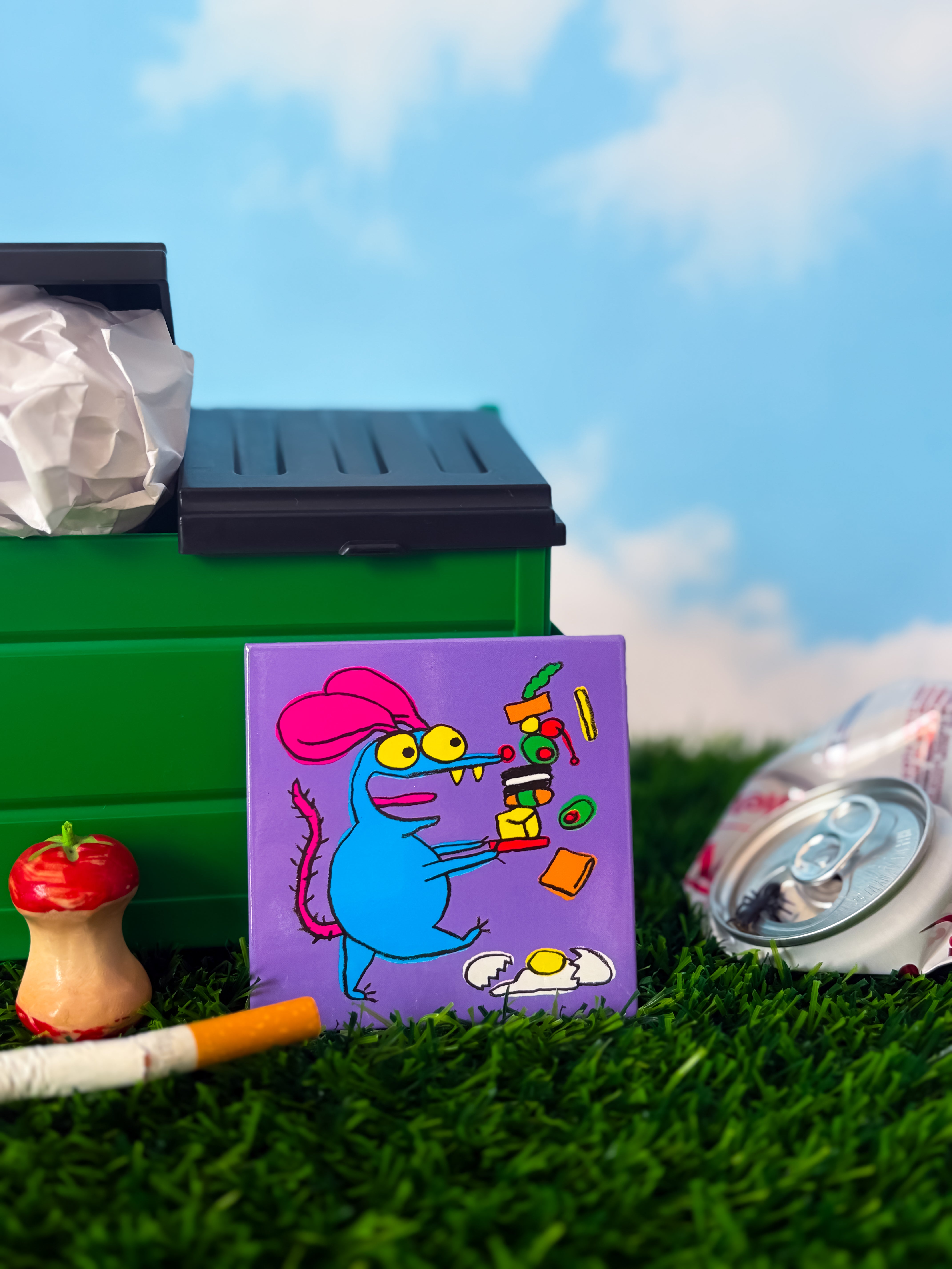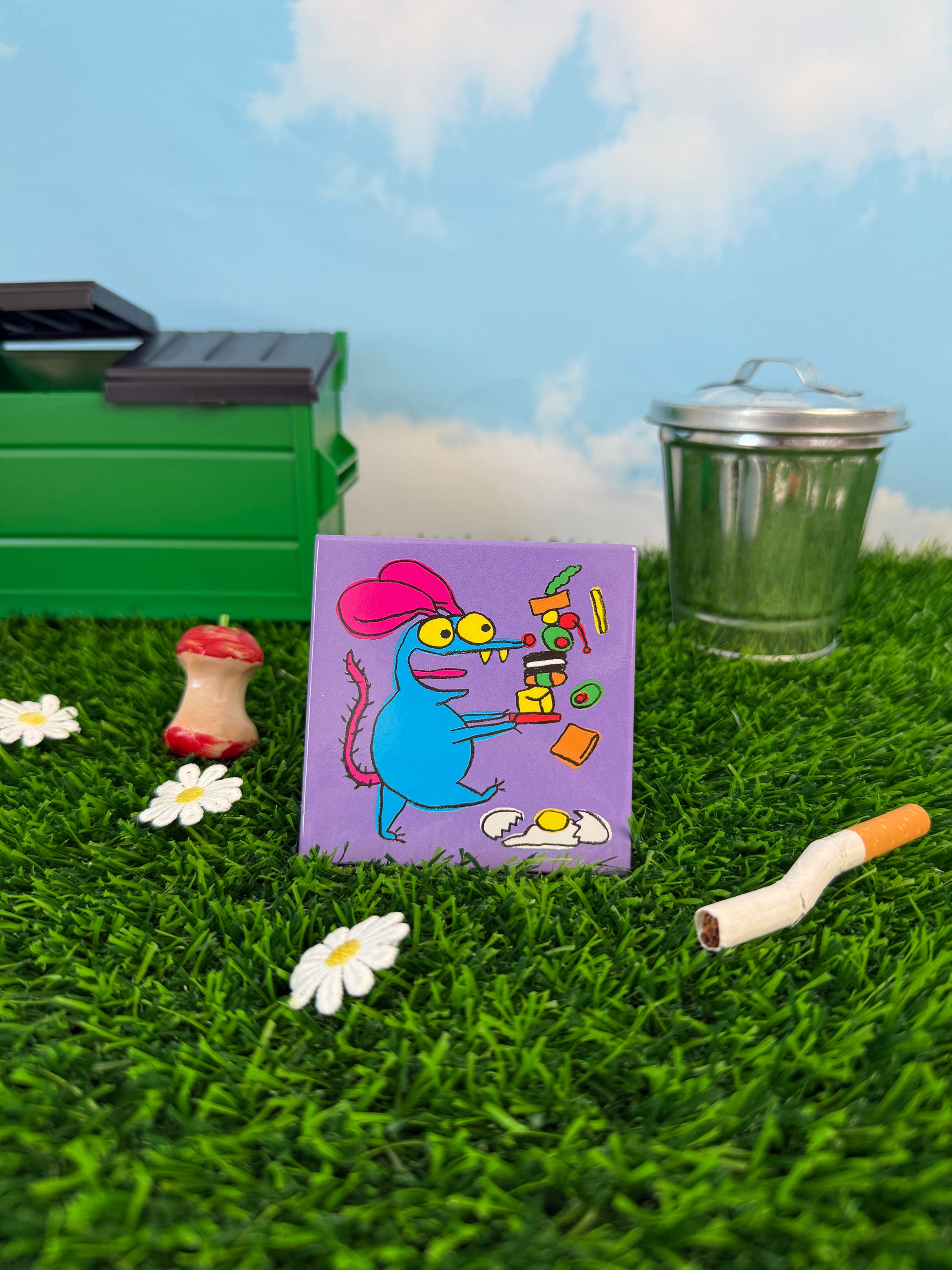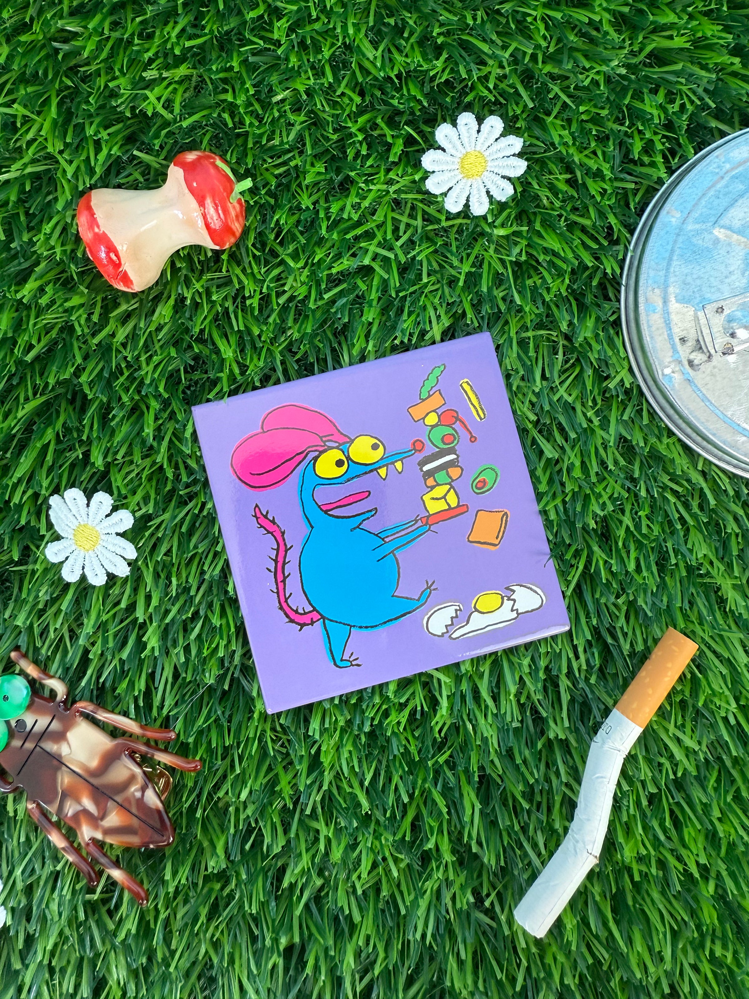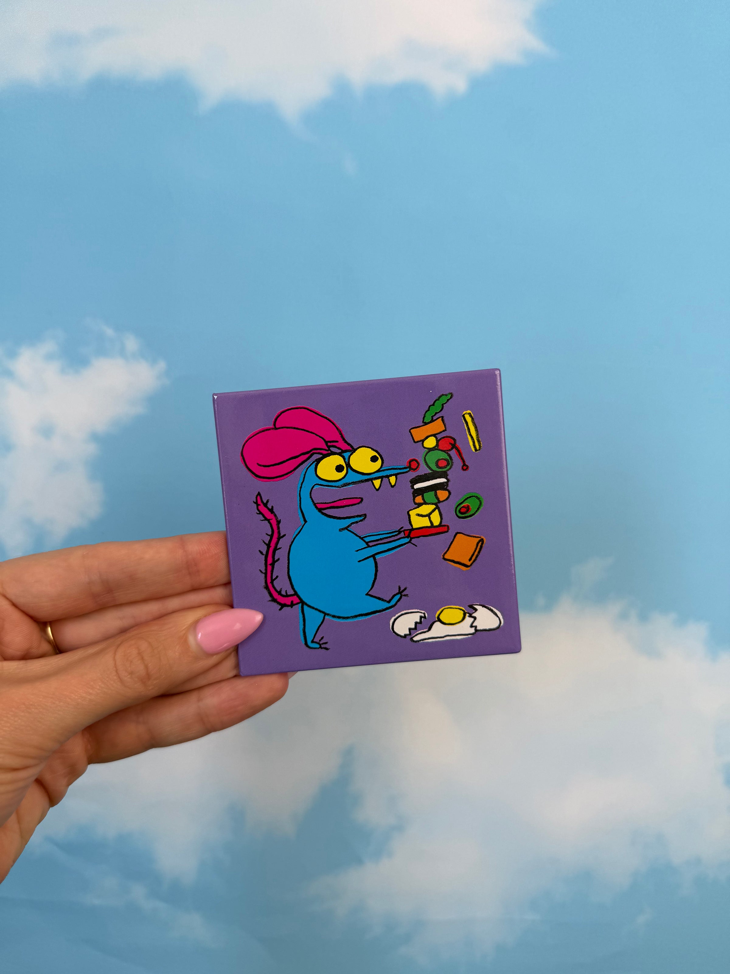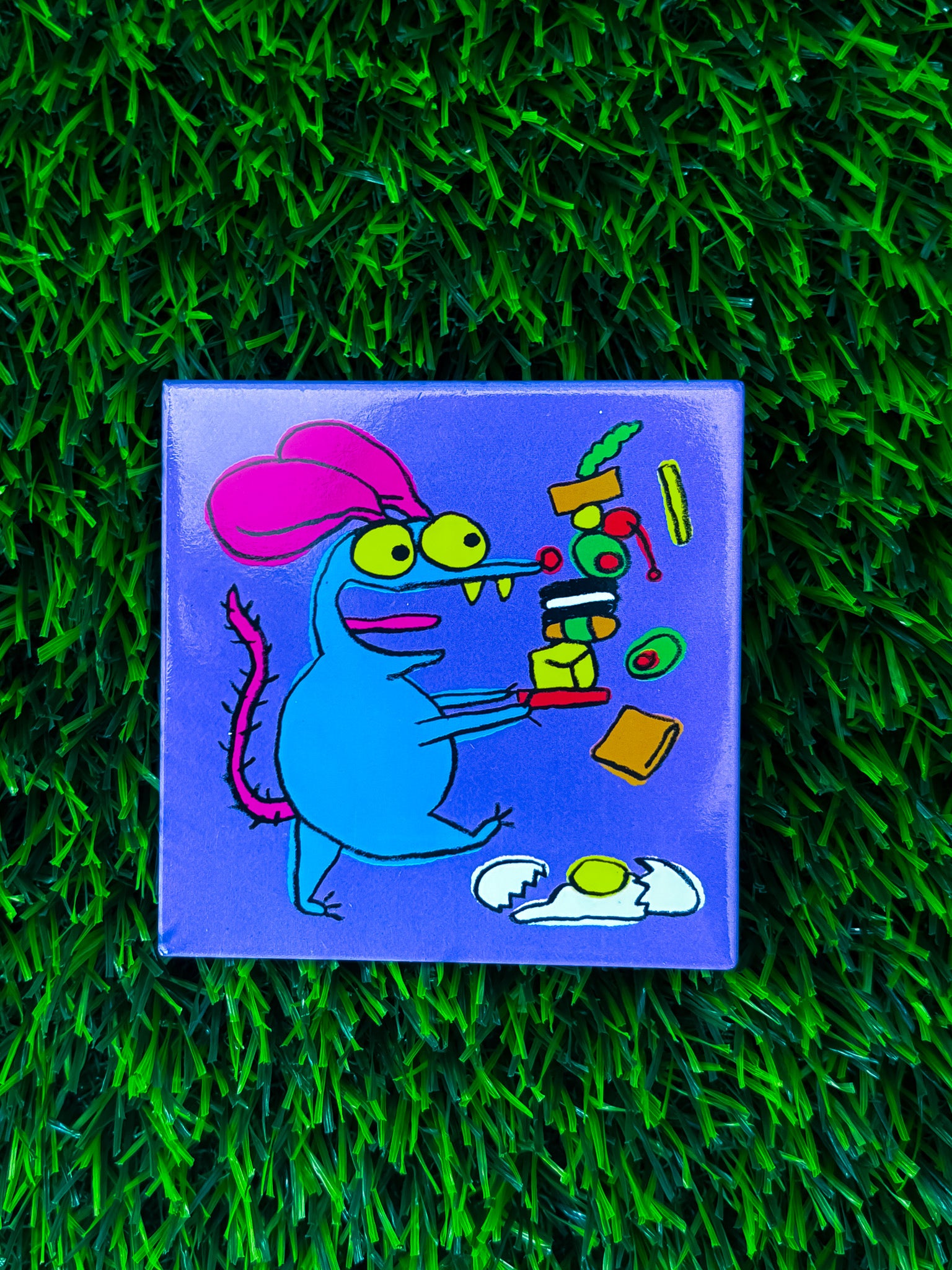 This magnet features an adorable blue rat with pink ears balancing a plate of yummy treats! Perfect for fridges, lockers, calendar boards, etc!