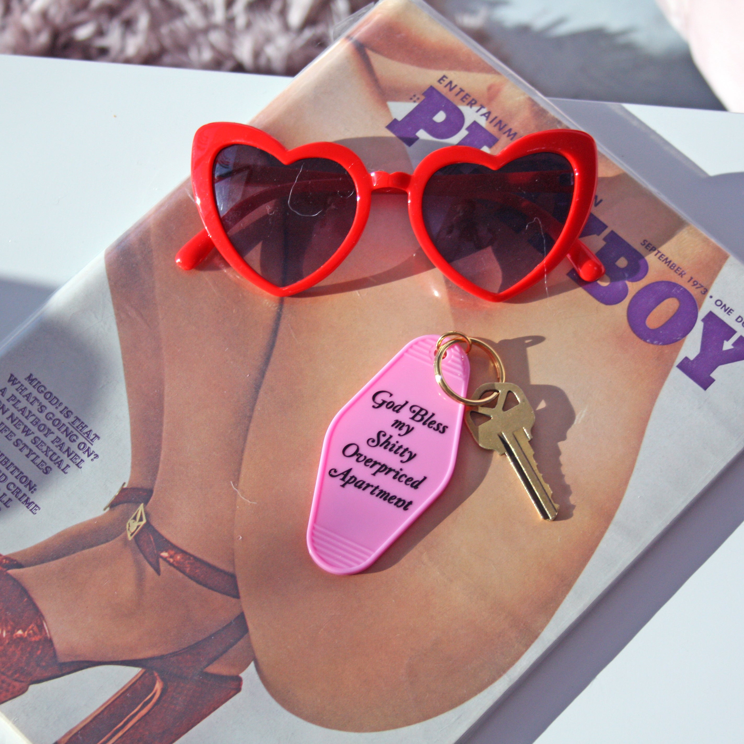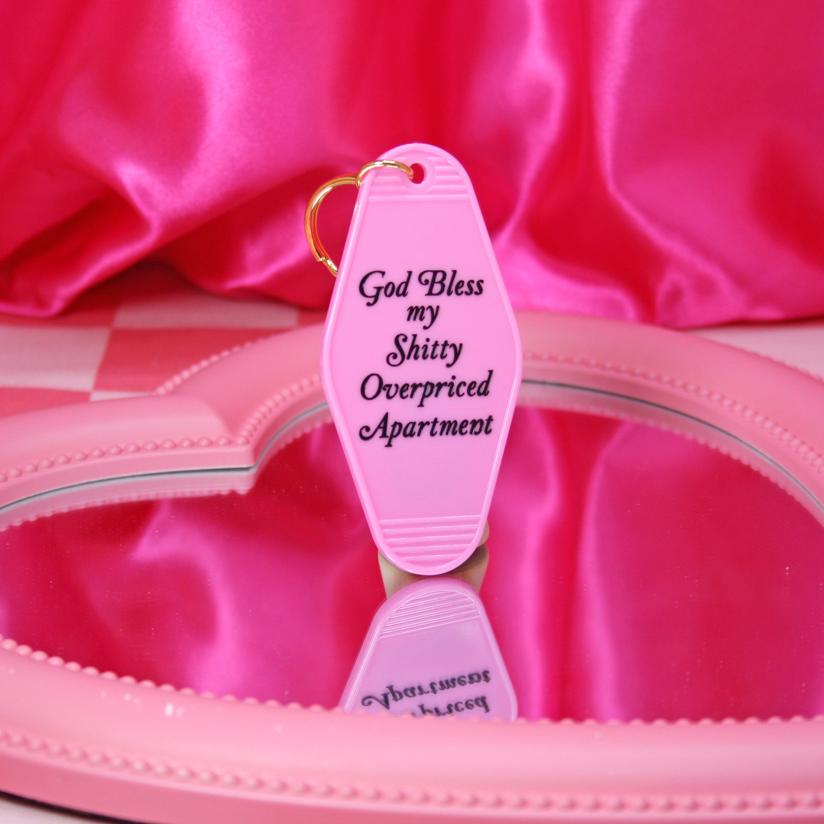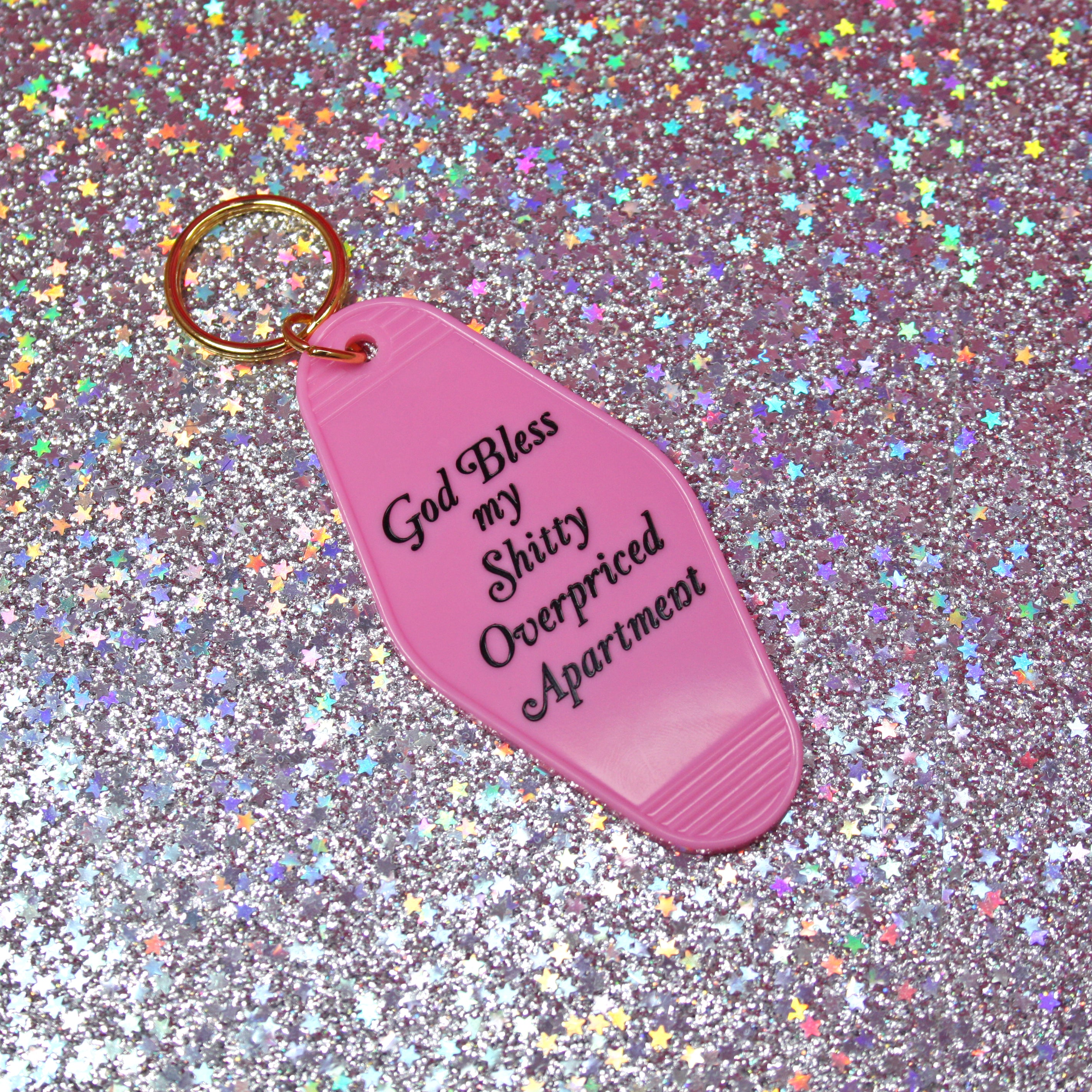 Vintage inspired motel keychain says God Bless my Shitty, Overpriced apartment.