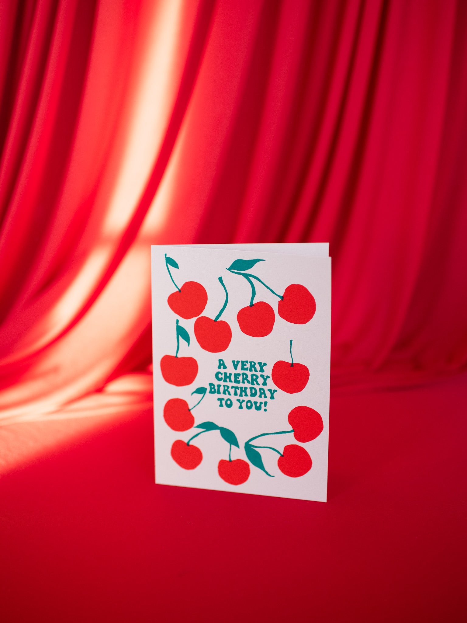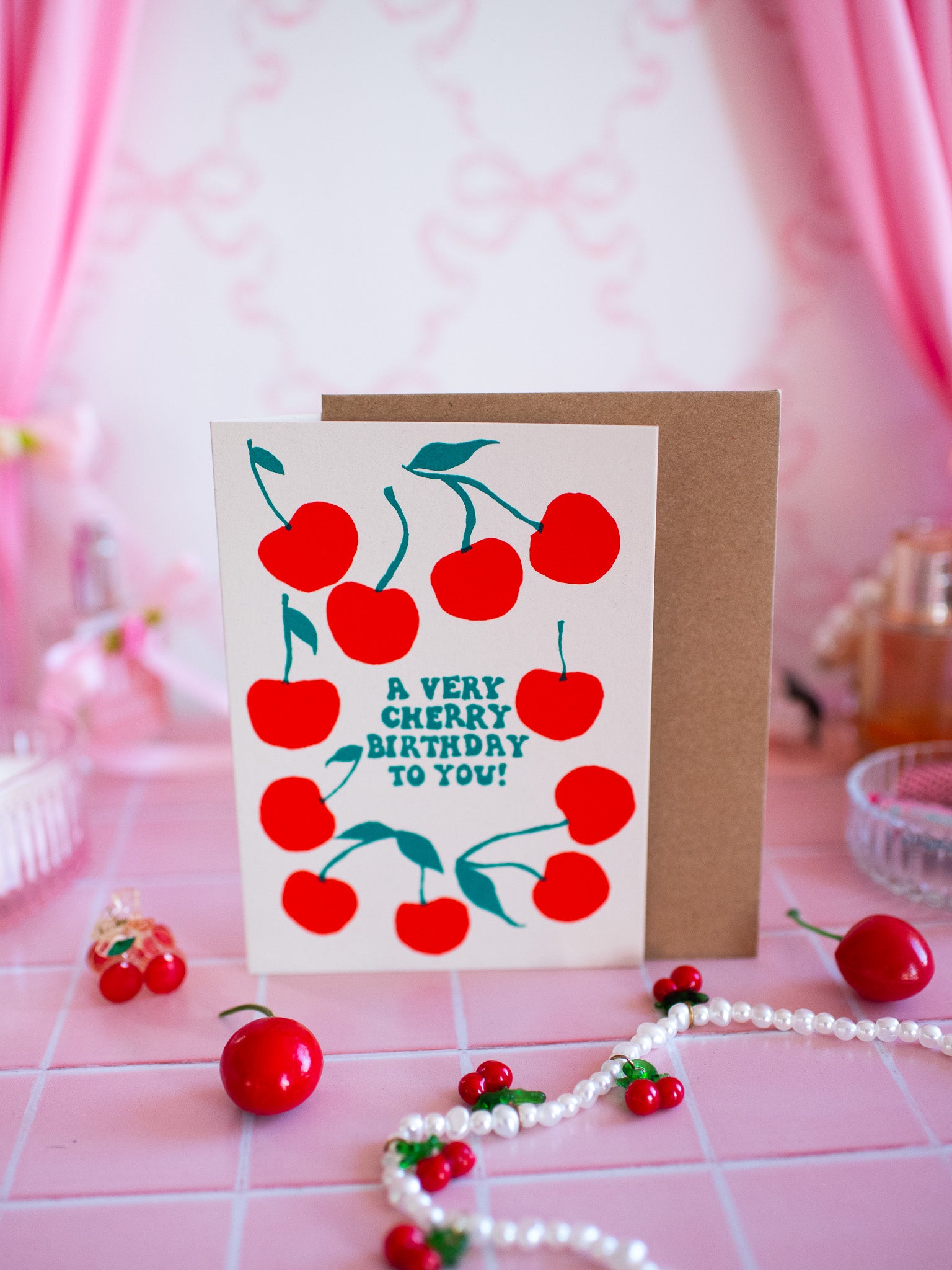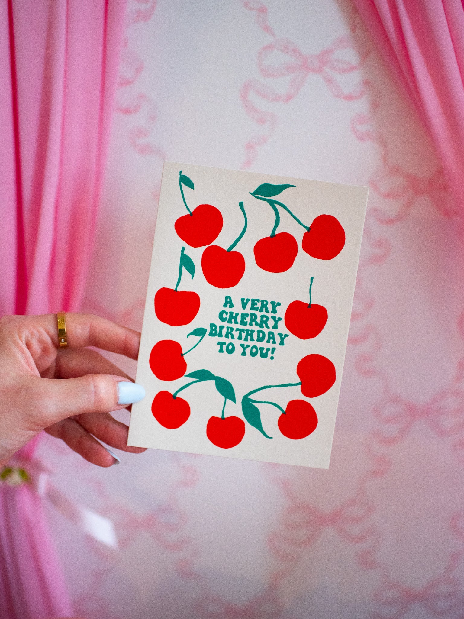 This card is the cutest! It features a bunch red cherries with green stems on a pretty pink card, complete with an even sweeter sentiment, "a very cherry birthday to you!" The perfect birthday card for your sweetest friend!