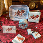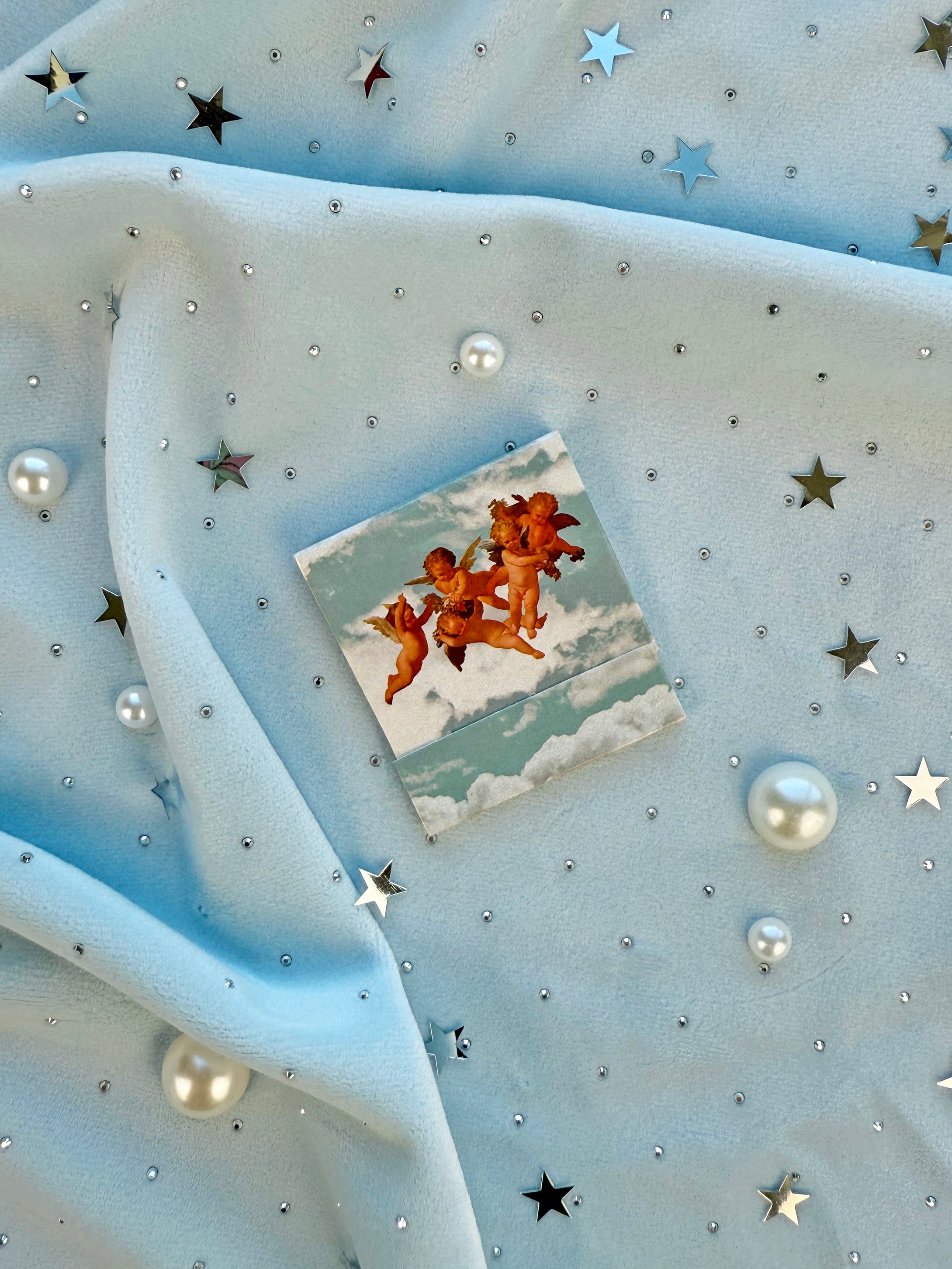 This gorgeous Cherub Matchbook features a flight of cherubs against a soft blue sky - whimsical and wonderful! Open the matchbook to uncover 10 periwinkle-tipped matches - each one covered in the same print!