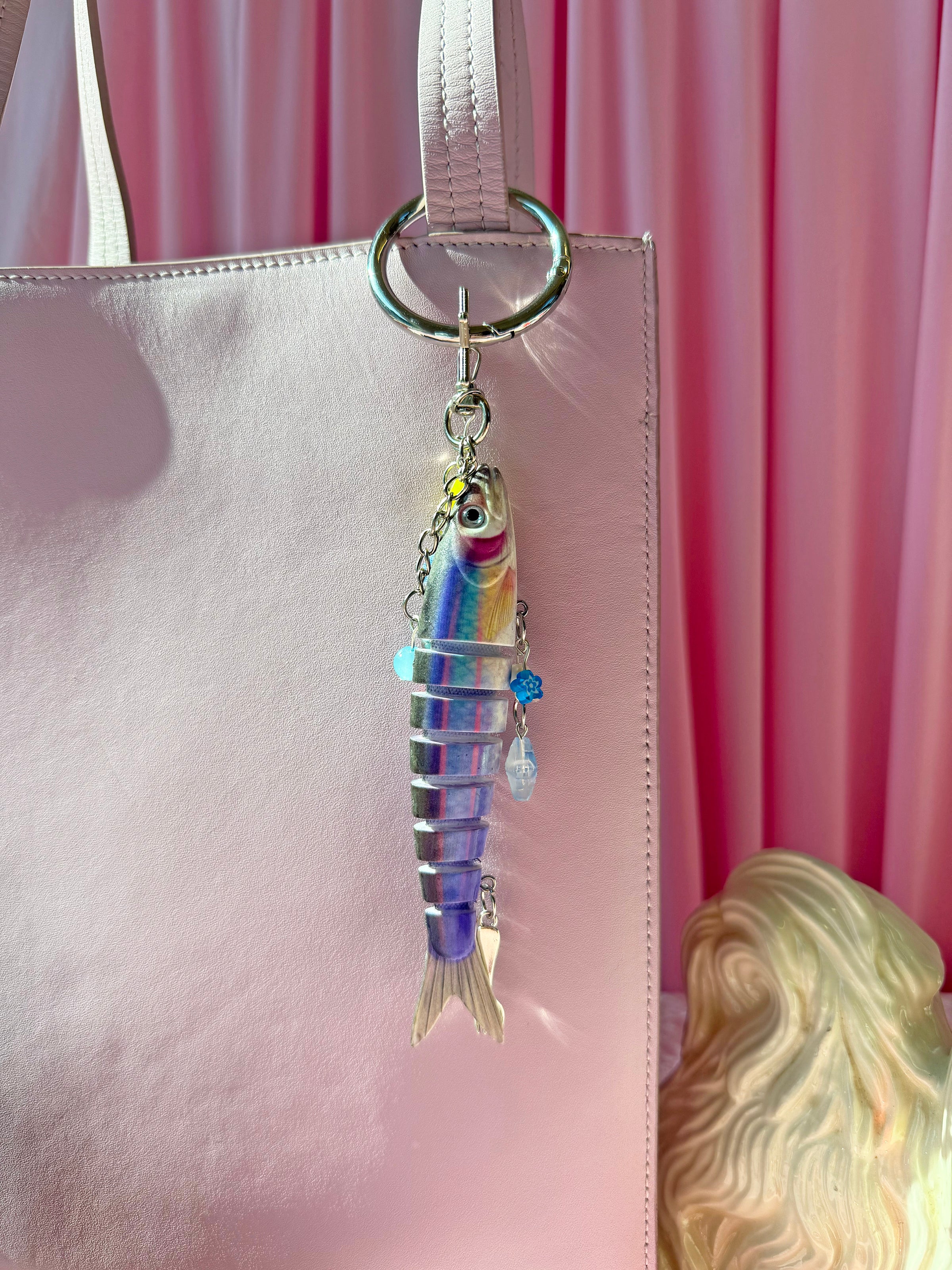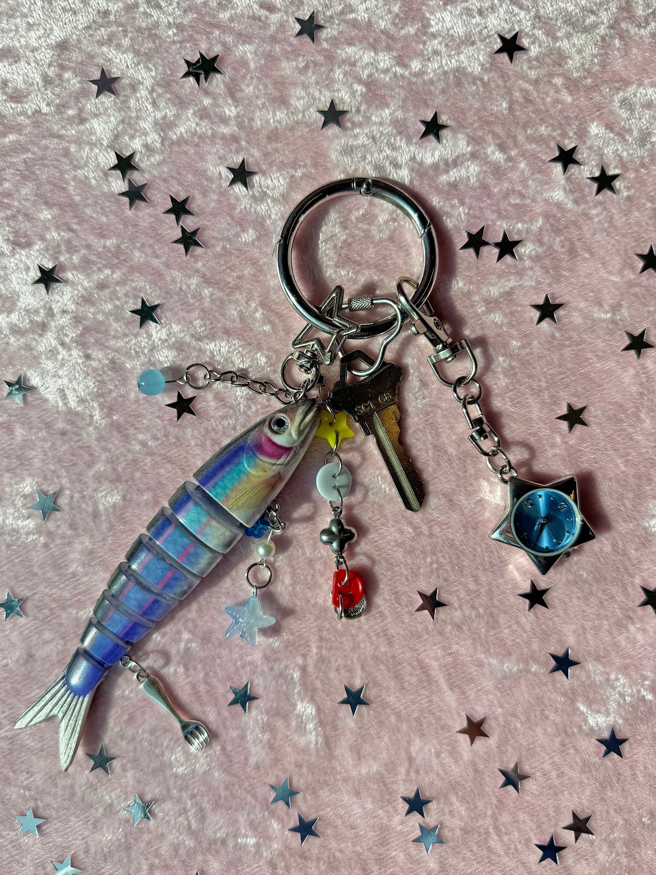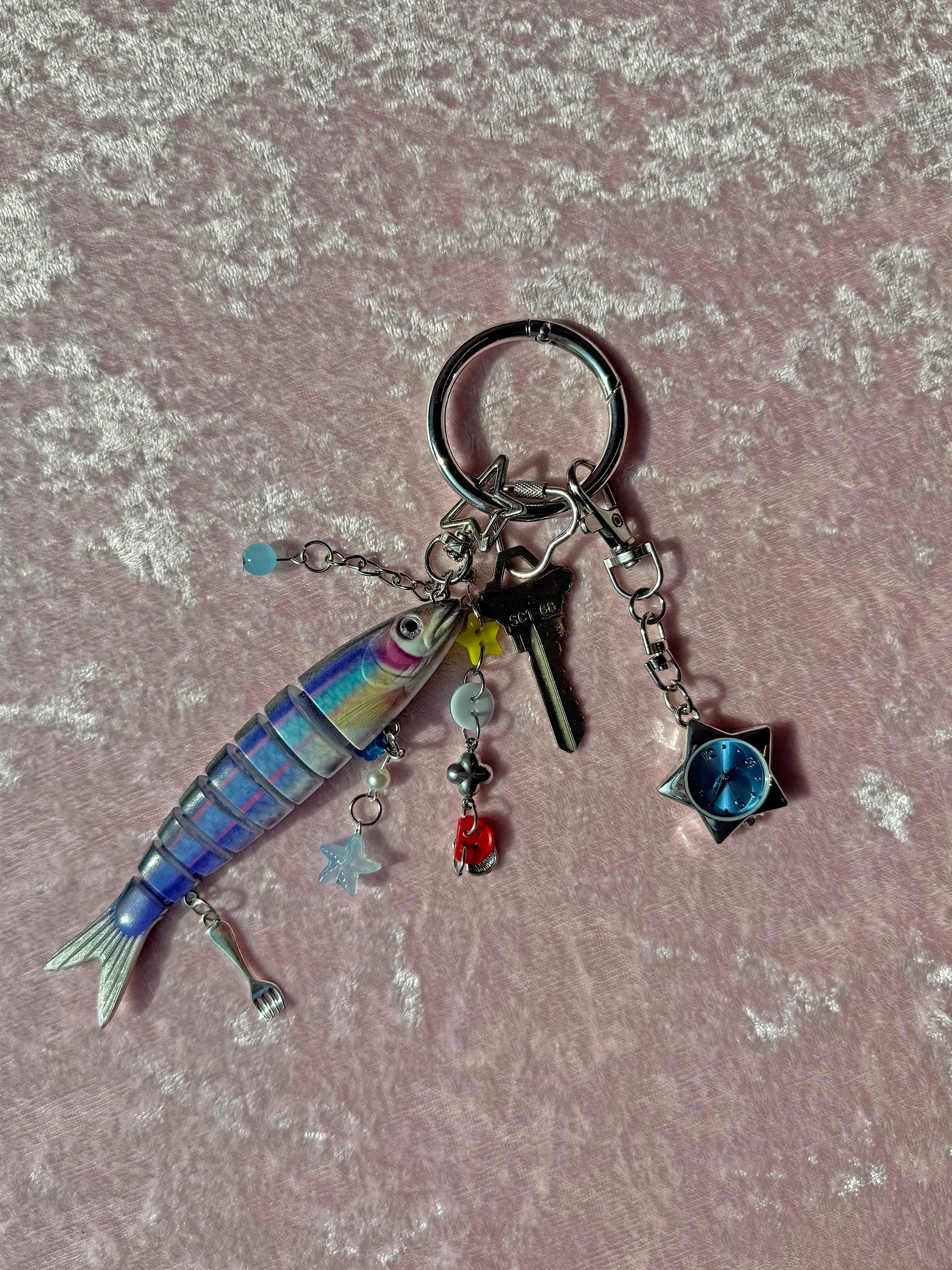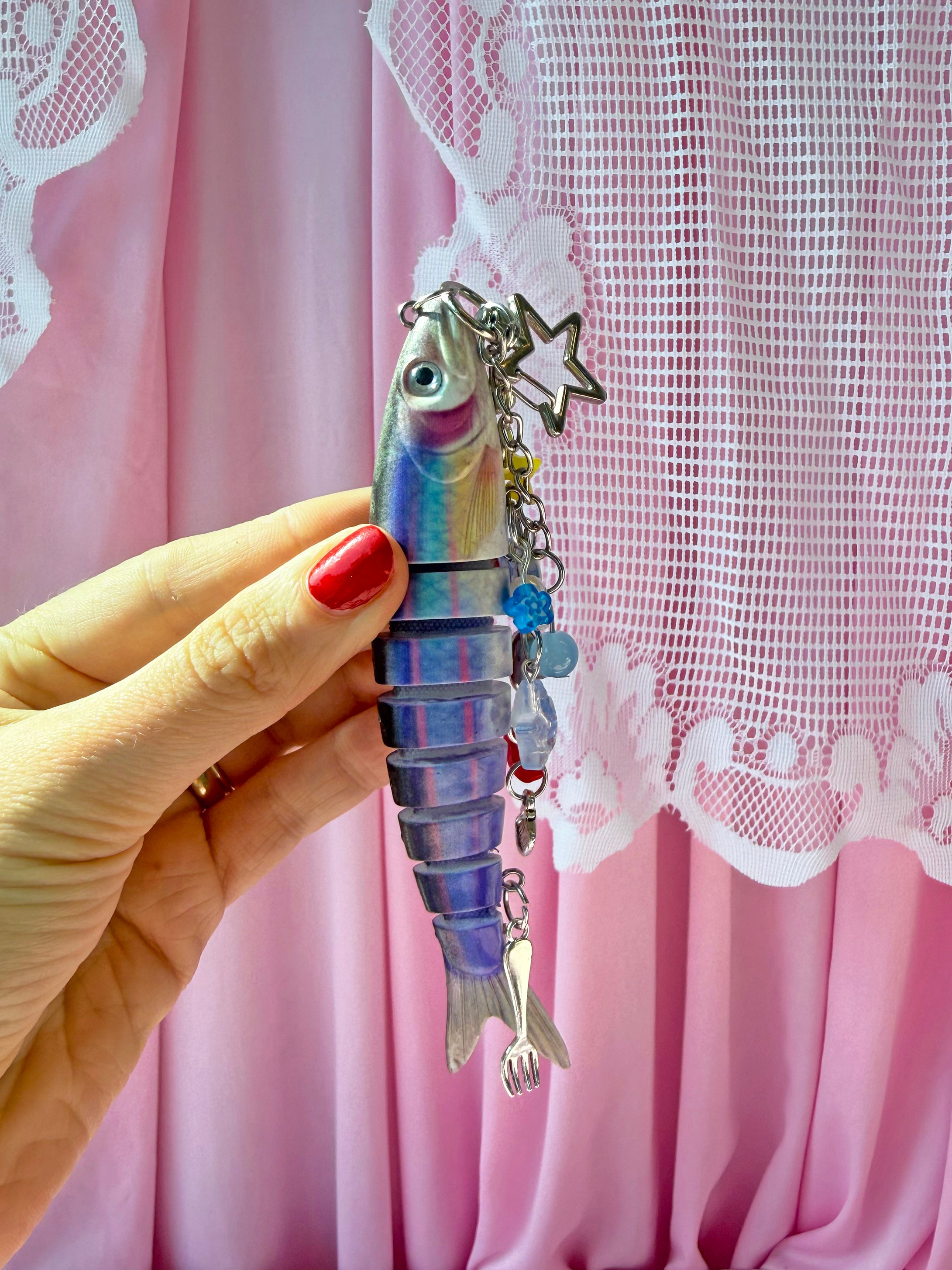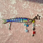 This adorable fish keychain features 1 cute blue segmented fish surrounded by lots of cute charms! She's got buttons, shells, stars, beads, and even a fork! Each keychain will have a unique combo of charms. Comes on a silver star shaped carabiner that makes attaching it to any bag/keychain a breeze!