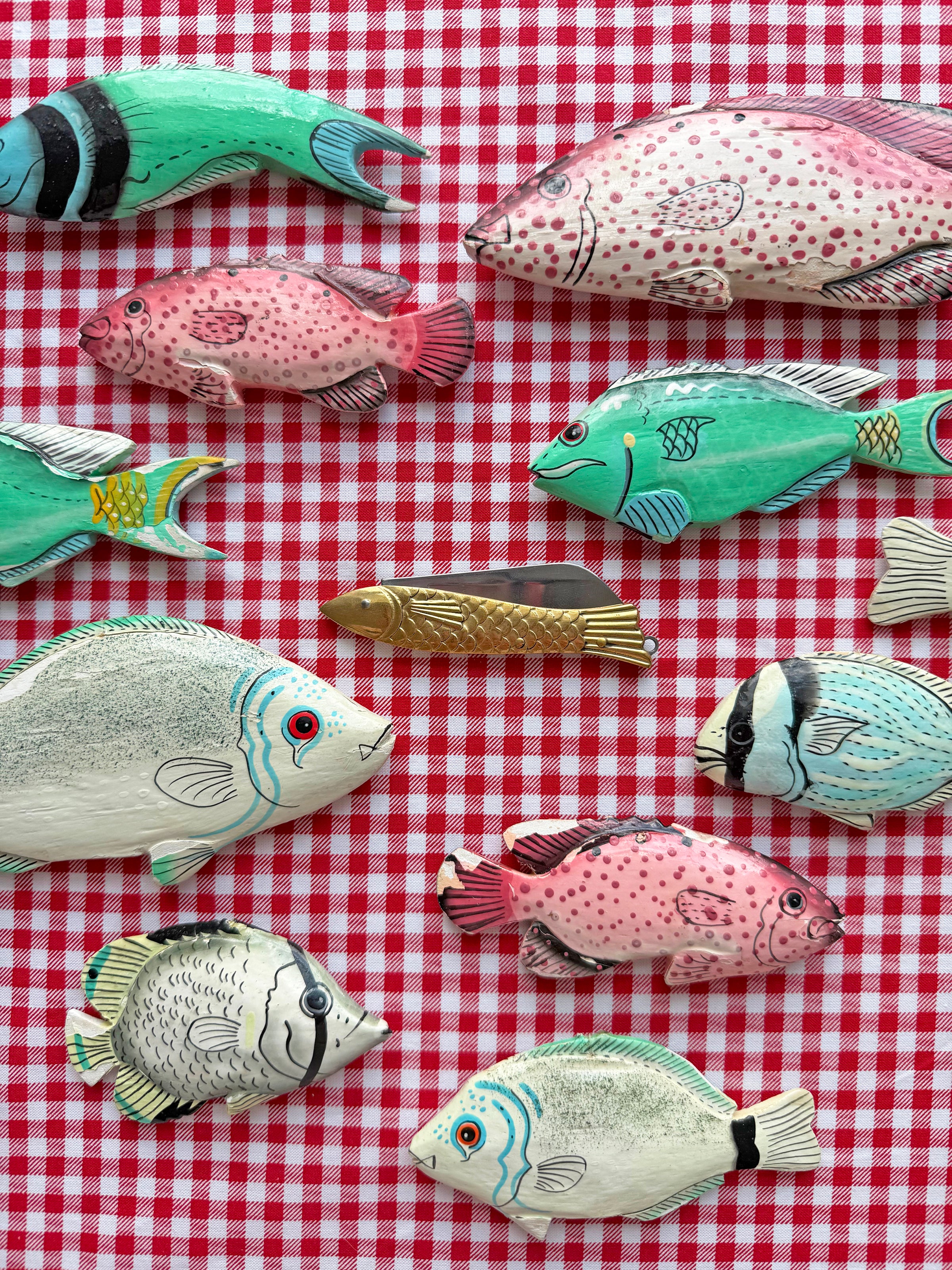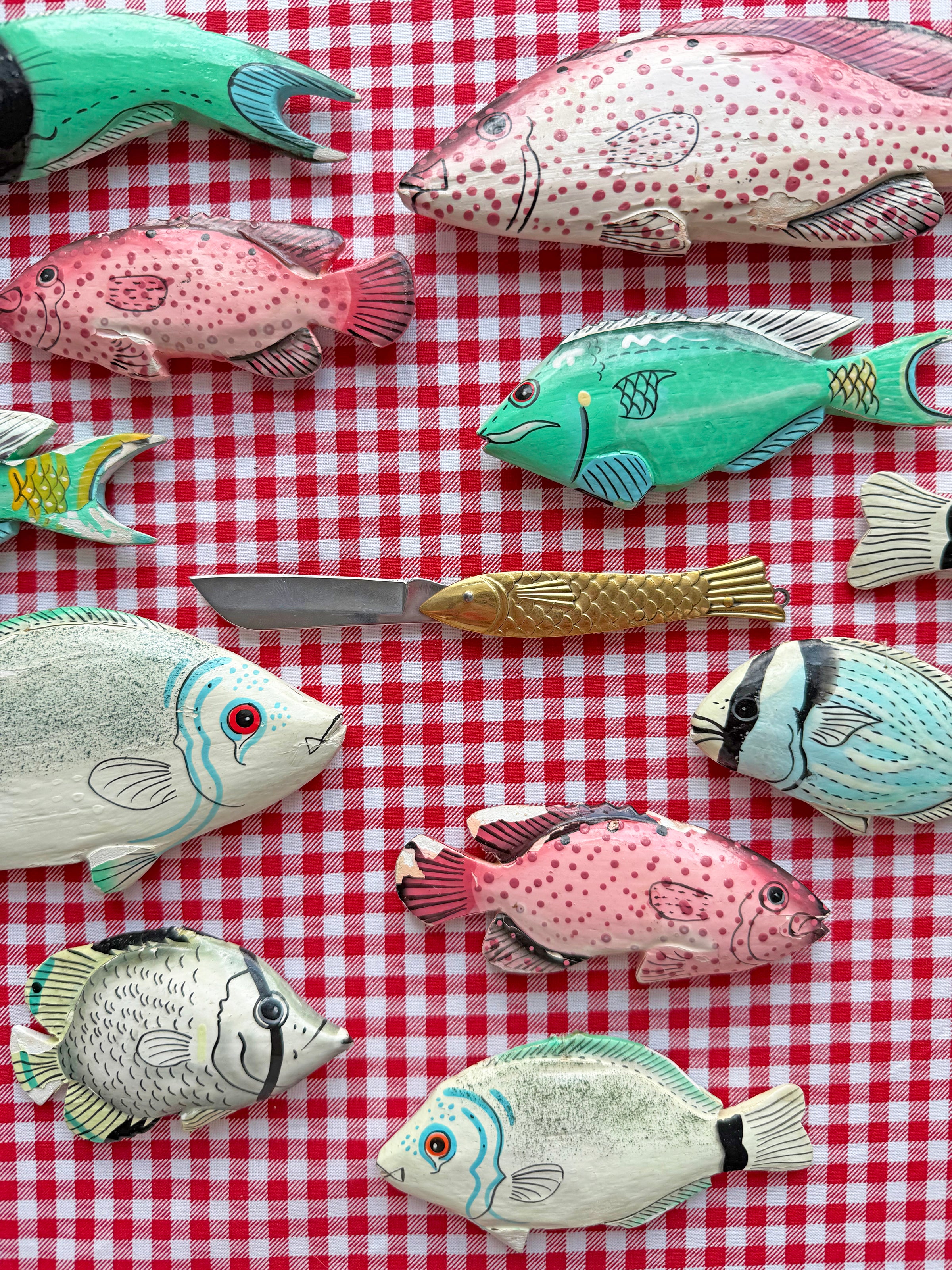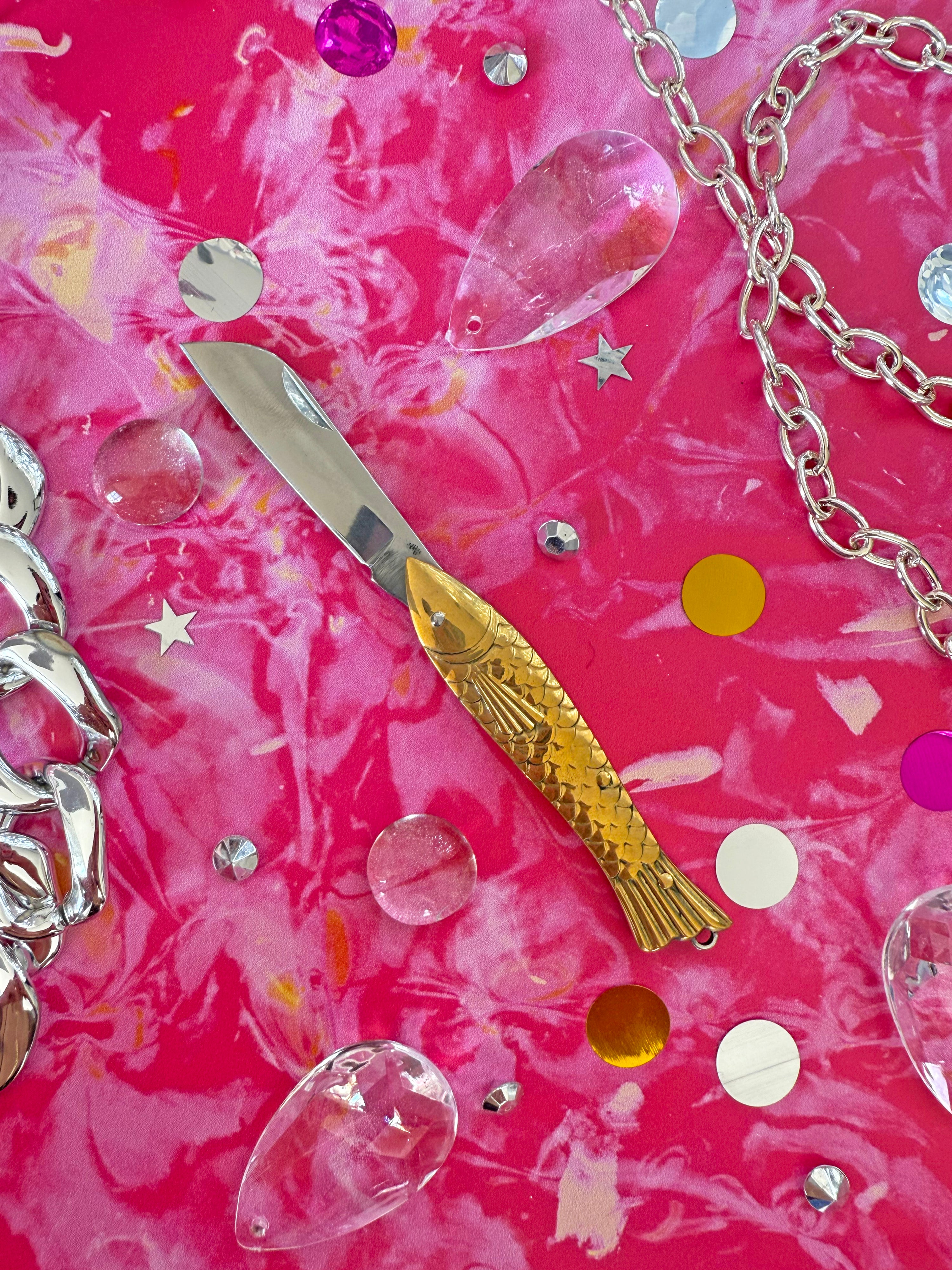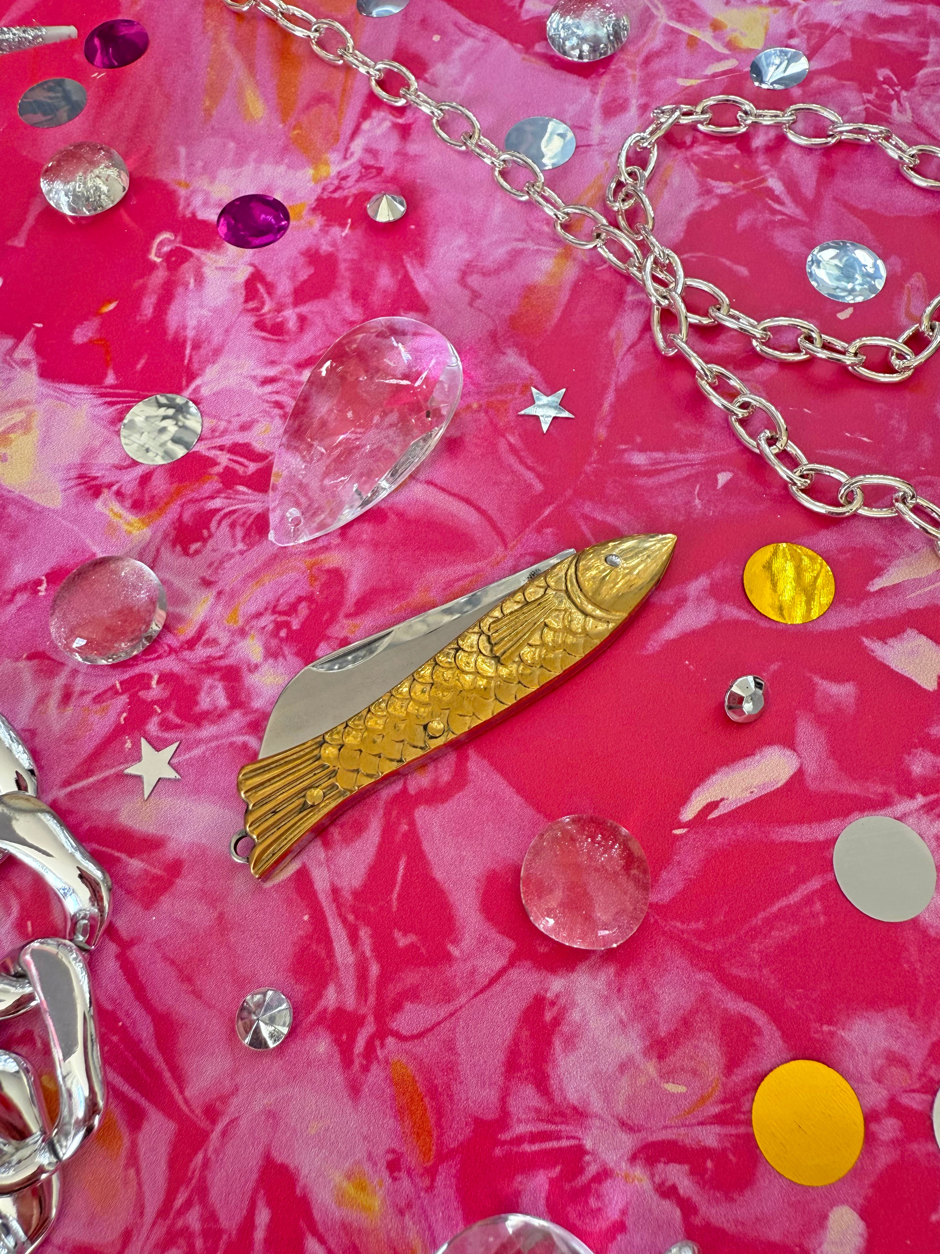 This mini pocket knife features a brass fish-shaped handle, a stainless steel blade, and a loop on the fishy's tail for easy attachment onto a key ring! Perfect for opening packages, cutting fishing line (if you're about that life), or gifting to your favorite fish enthusiast!