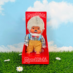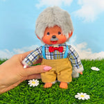 This sweet grandpa Monchhichi has the cutest grey fur and mustache! He's wearing a plaid button down with khaki pants, accessorized perfectly with a red bow tie and blue suspenders! Perfect for gifting, adding to your growing collection, or just to add some fun vibes to your space!