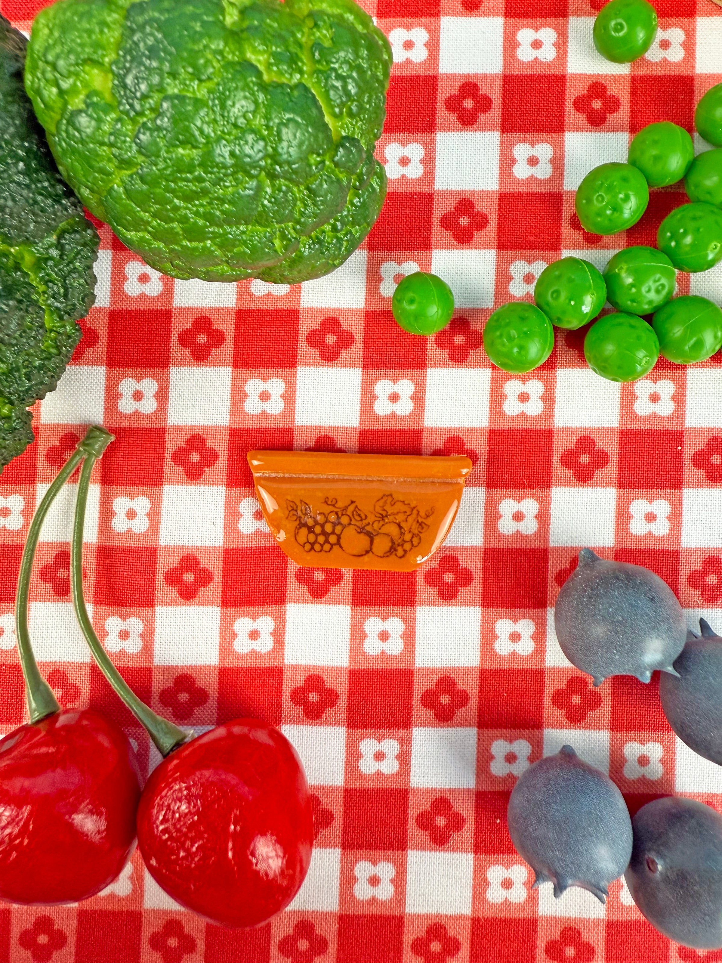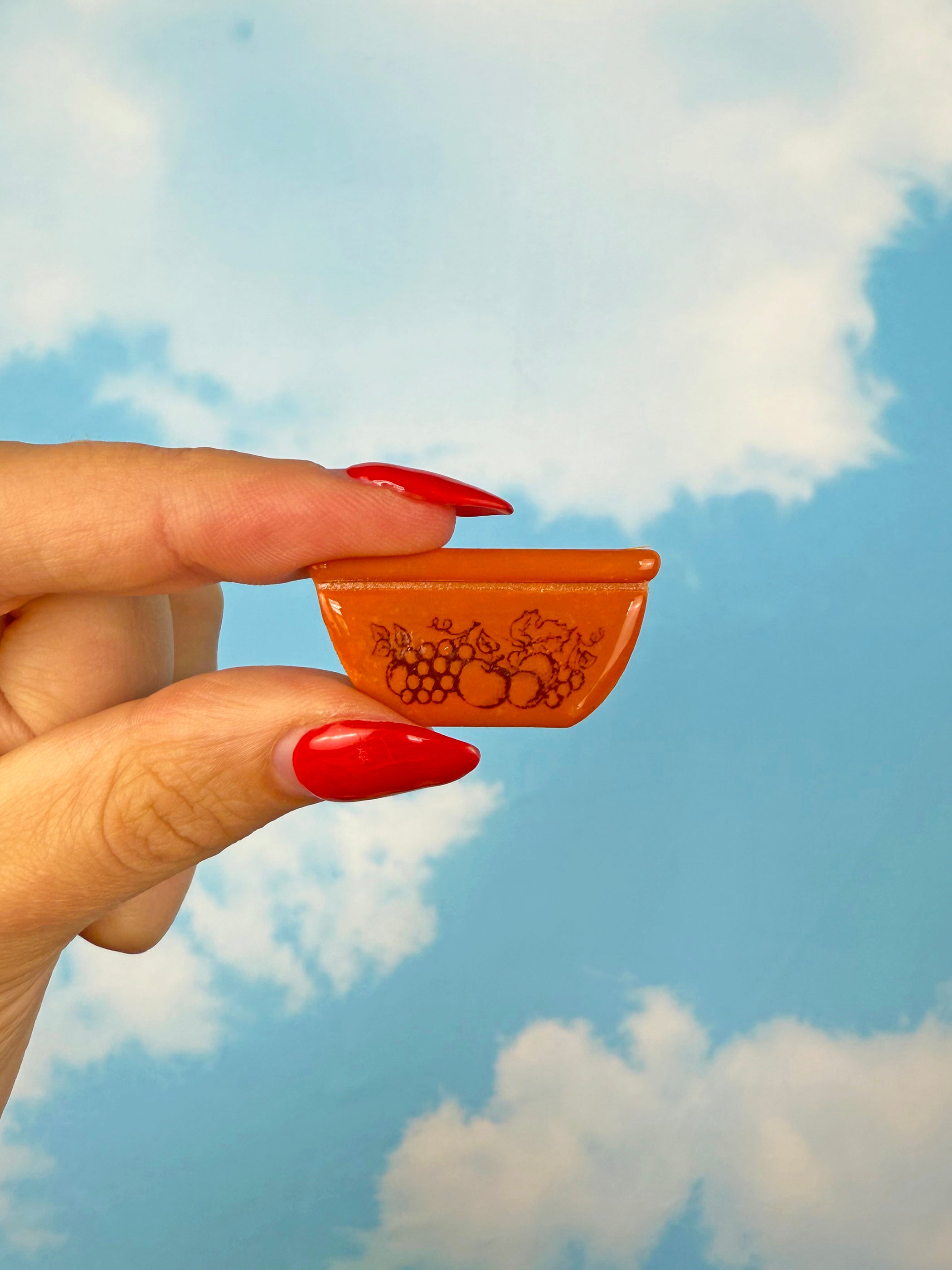 We all know and love these classic bowls! This adorable clay magnet features an orange vintage-style bowl with a kitschy fruit design. Perfect for fridges, lockers, calendar boards, etc!