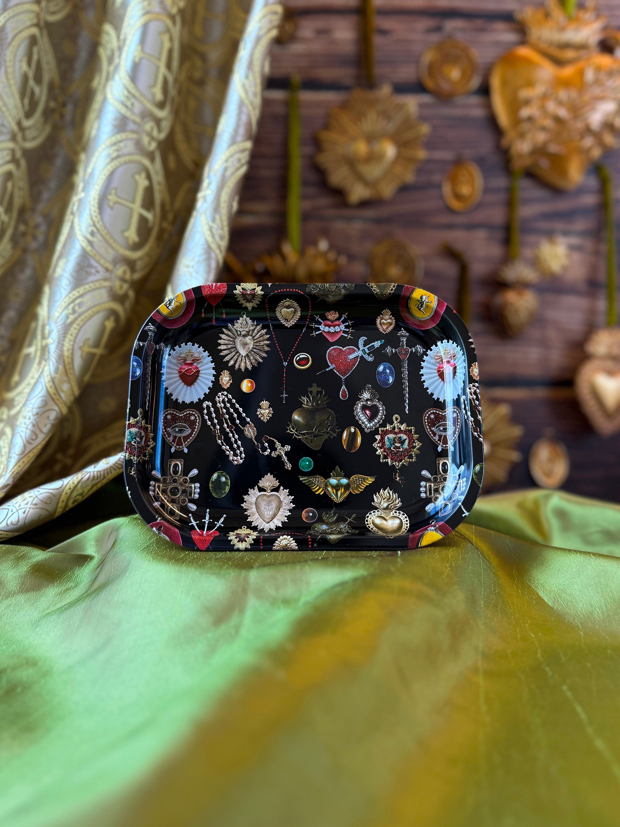 This tray features our iconic sacred heart print- serving sacred, sanctimonious Catholic guilt. Perfect for use as a rolling tray or as a lil trinket tray around your home!