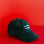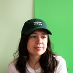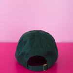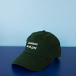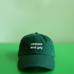 This hat is forest green with white embroidery that reads "useless and gay" on the front. A top seller at our IRL shop in Nashville, TN!