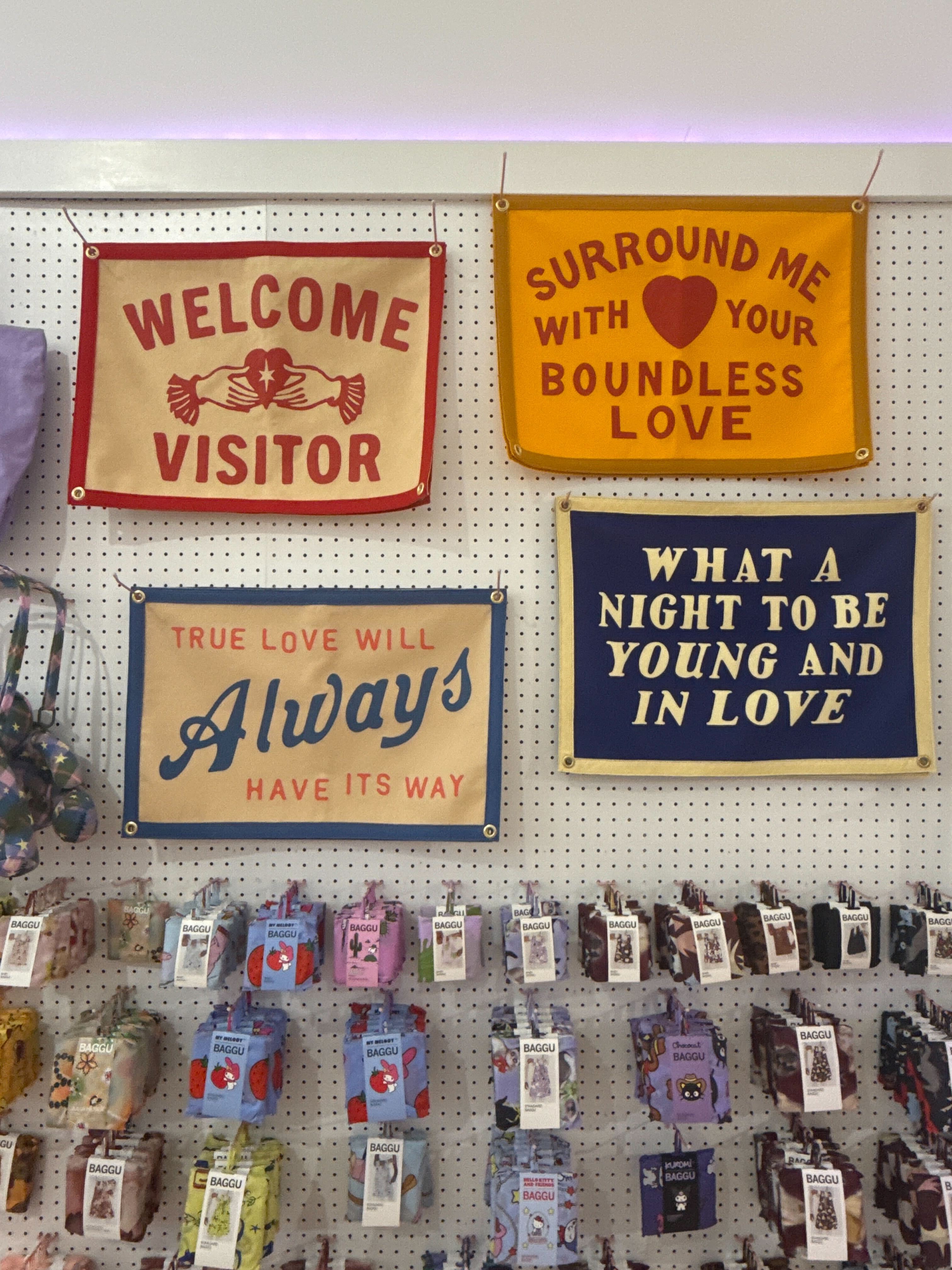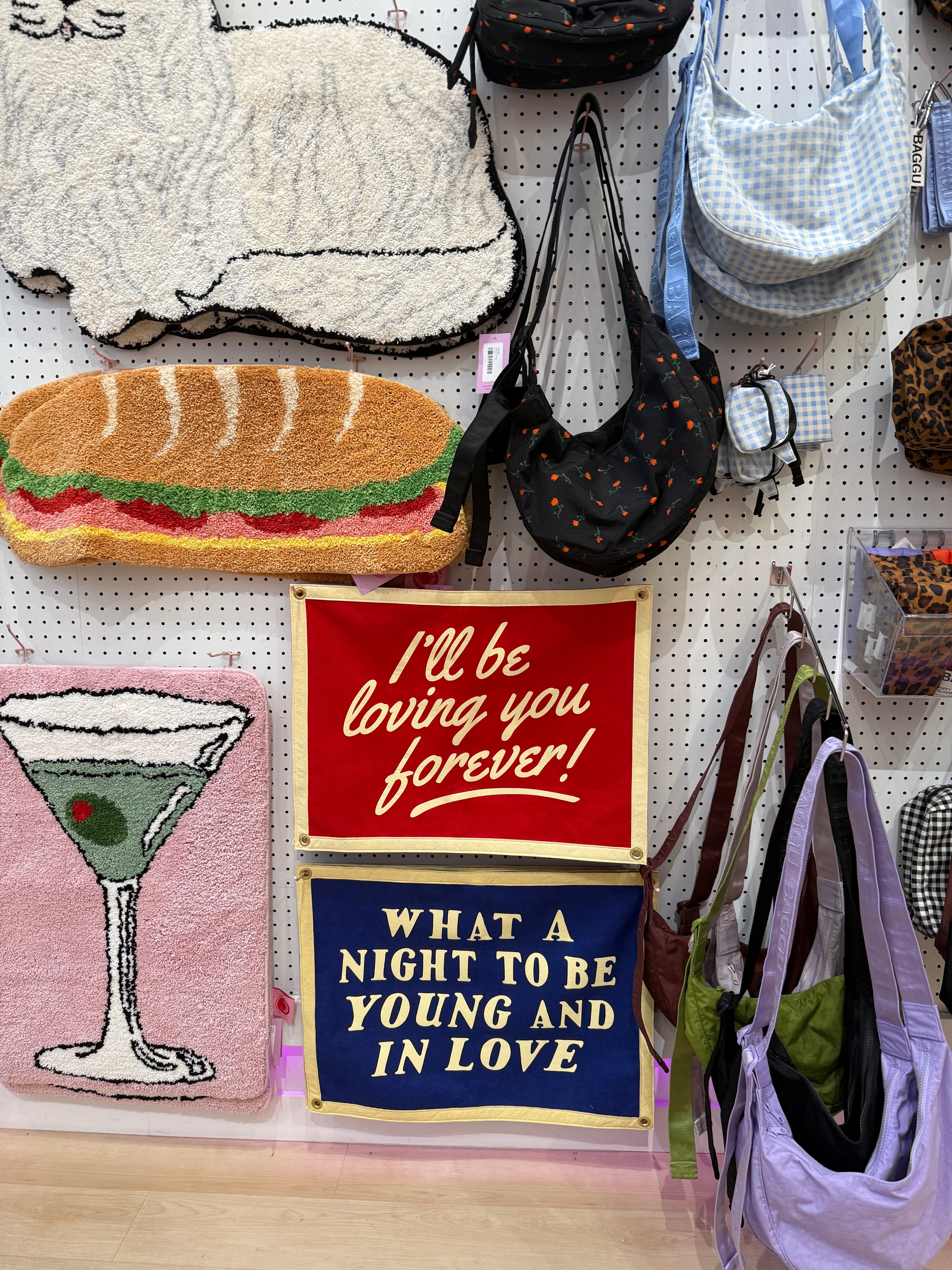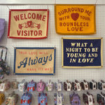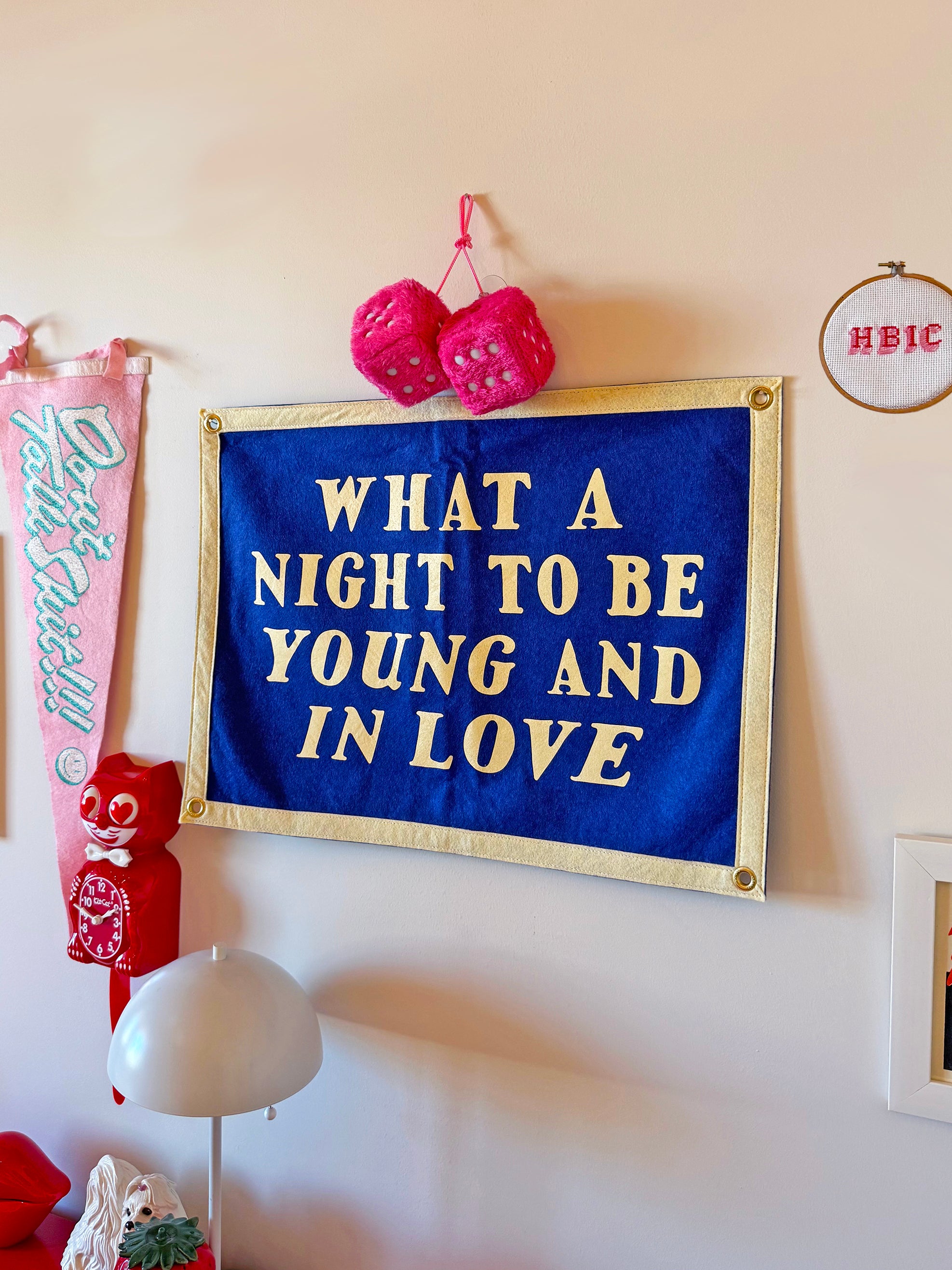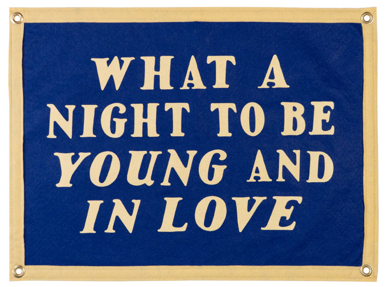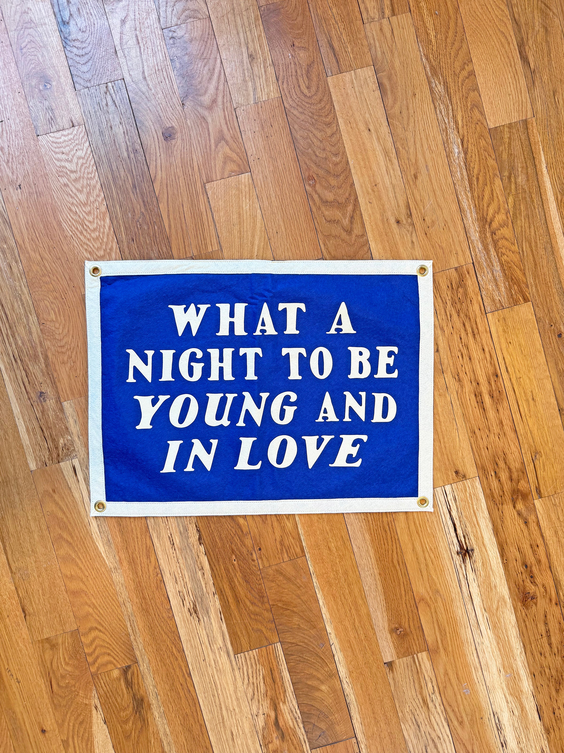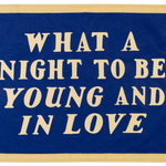 This bright blue flag reads "what a night to be young and in love" in a cream-colored font! It has 4 grommets, one on each corner, for easy hanging. Perfect to hang in your bedroom, the blank spot on your photo wall, or even as a cute photo prop!